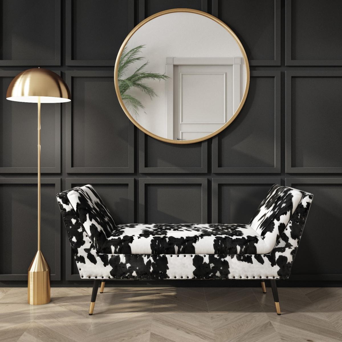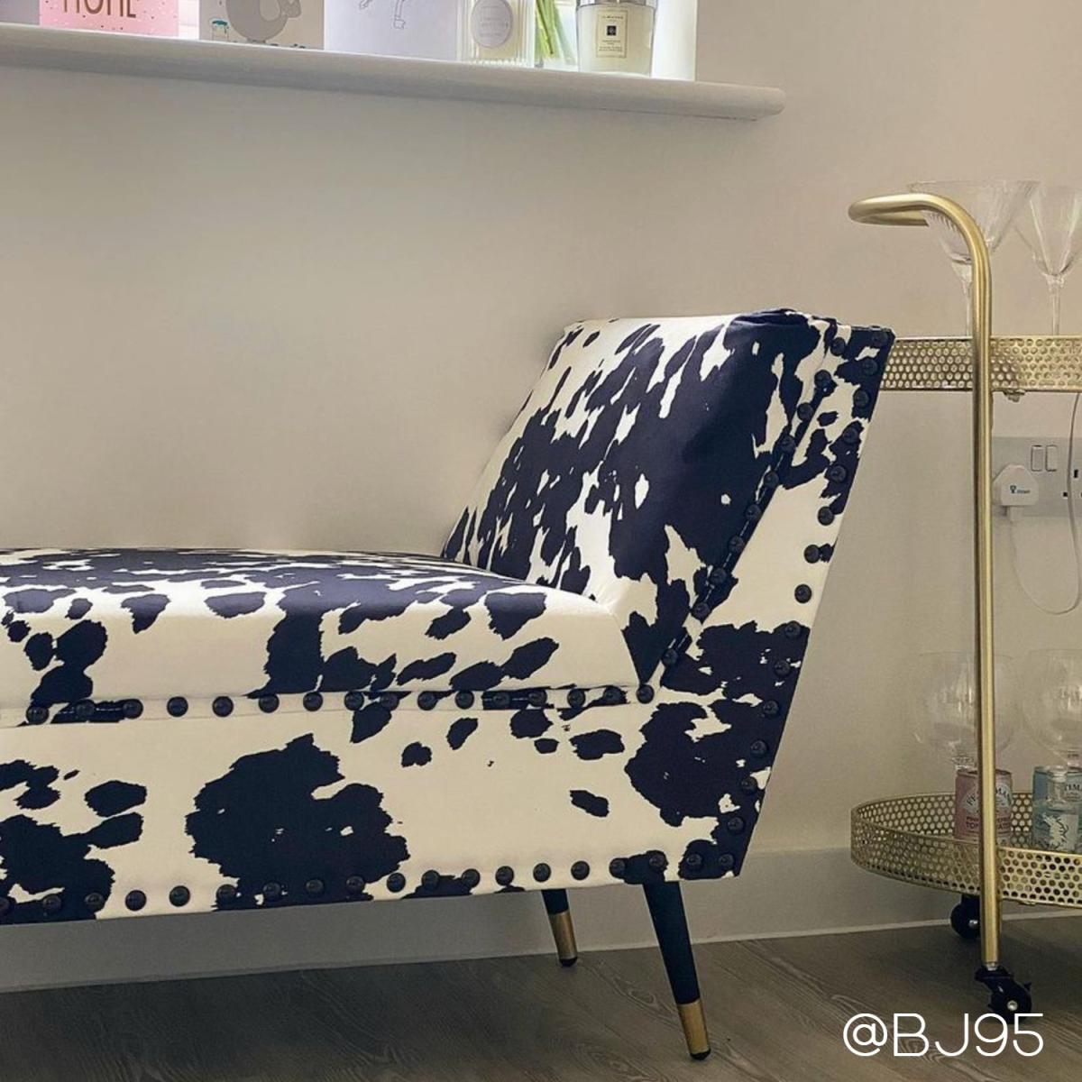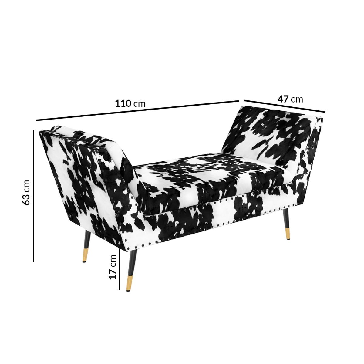 Features we love Upholstered in a luxurious cow print velvet fabric. Cushioned base and armrests provide a comfortable seat. Features contrasting carved wood legs with gold tips. Studded detail adds a lovely finishing touch. Use as an extra seat a footrest or add a drinks tray. Matching ottoman storage and footstool available. Need to know. Dimensions. W110 x D47 x H63 cm Colour. Black white and gold Finish. Cow print upholstery and gold painted Material. Solid wood combination frame fabric and metal For use. Indoors Weight capacity. 100kg Weight. 11.8kg Assembly required. Yes.