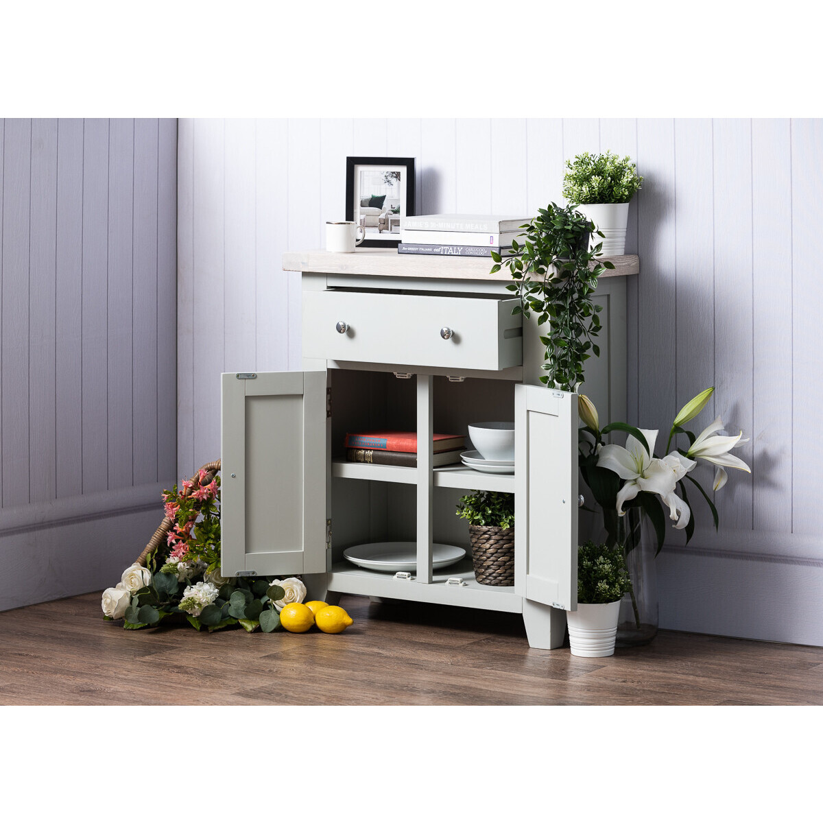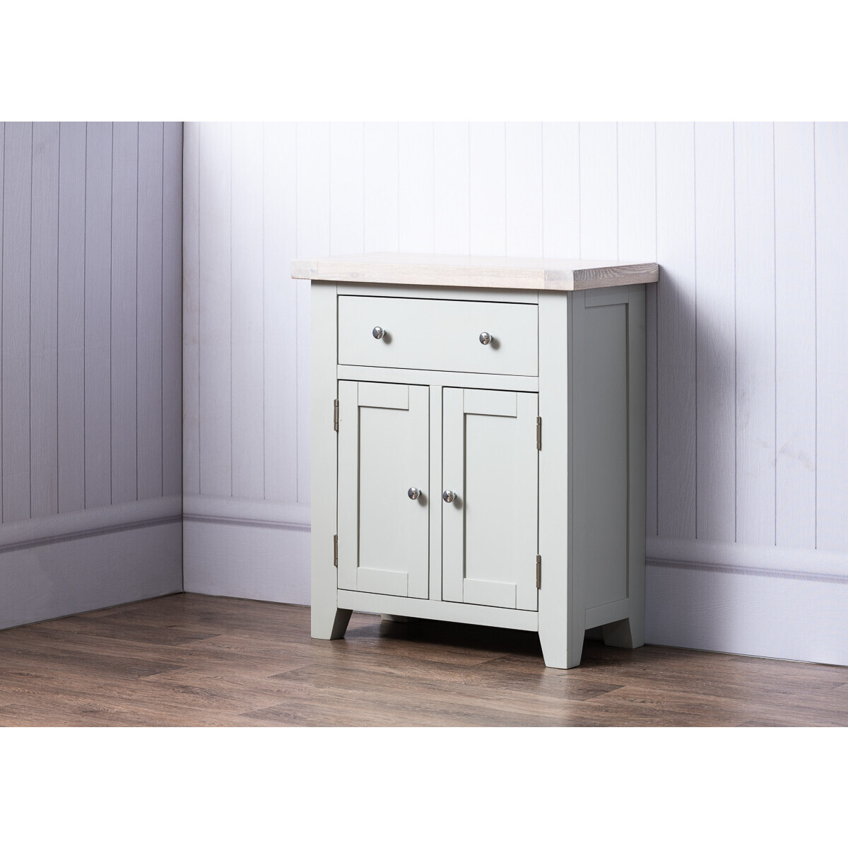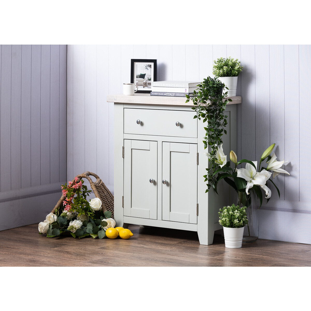 The most compact sideboard from our Felix range, the one drawer and two door sideboard makes the perfect addition to any living space. The entire Felix range is crafted from beautiful high quality solid oak, oak veneer and solid pine - painted a subtle soft grey and topped with an oak veneertop, this elegant sideboard makes the perfect addition to any living or dining area. Subtle grey painted finish. Crafted from high quality oak, pine and oak veneer. Matches with other items from the Felix range