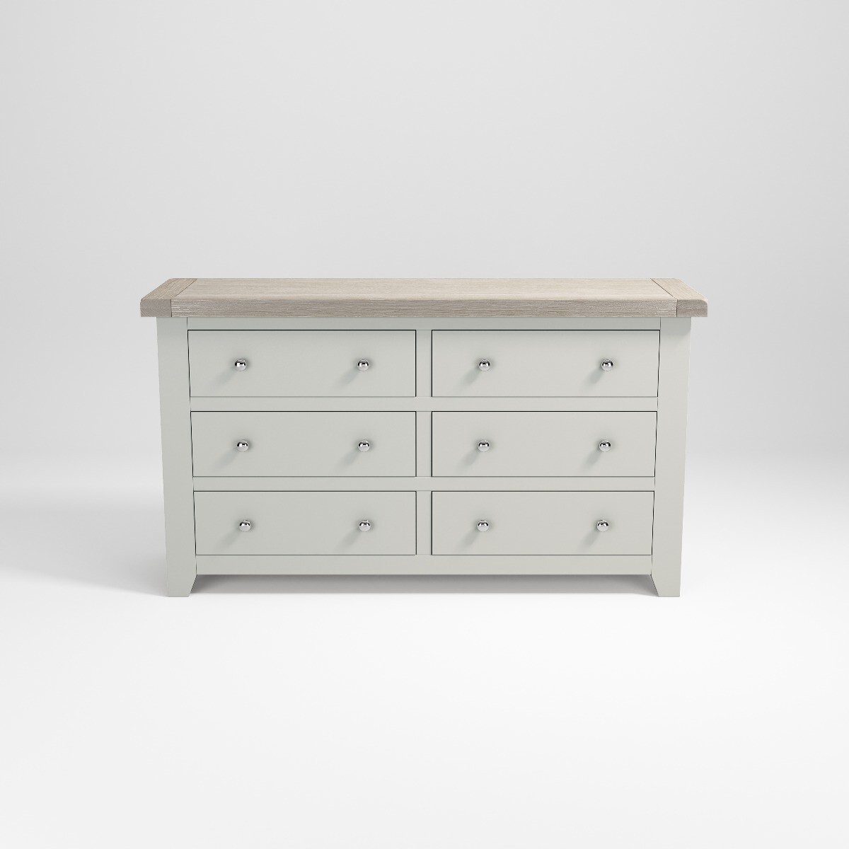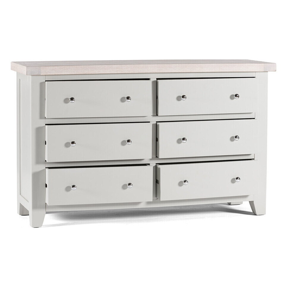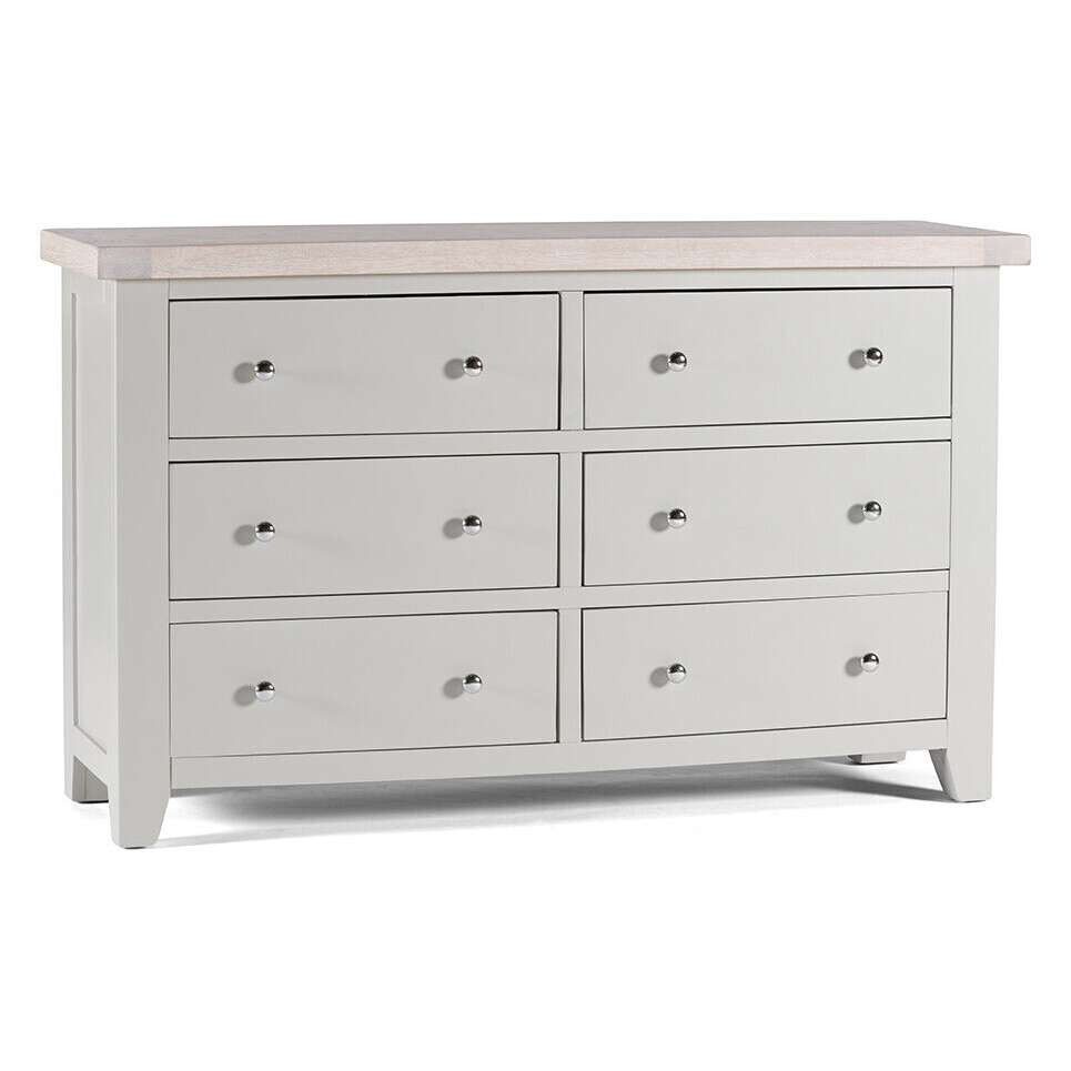 The chest of drawers with six drawers is a large and spacious storage option, ideal for spaces where additional storage is always appreciated. Featuring a fresh, modern design this piece looks beautiful when teamed with the other items in the Felix bedroom range. A simple dove grey painted finish gives the piece a minimalist and modern look, despite its size. Stylish and modern soft grey finish. Crafted using high quality oak, pine and oak veneer. Six spacious and functional drawer compartments. Clean lines enhance the contemporary look of your home