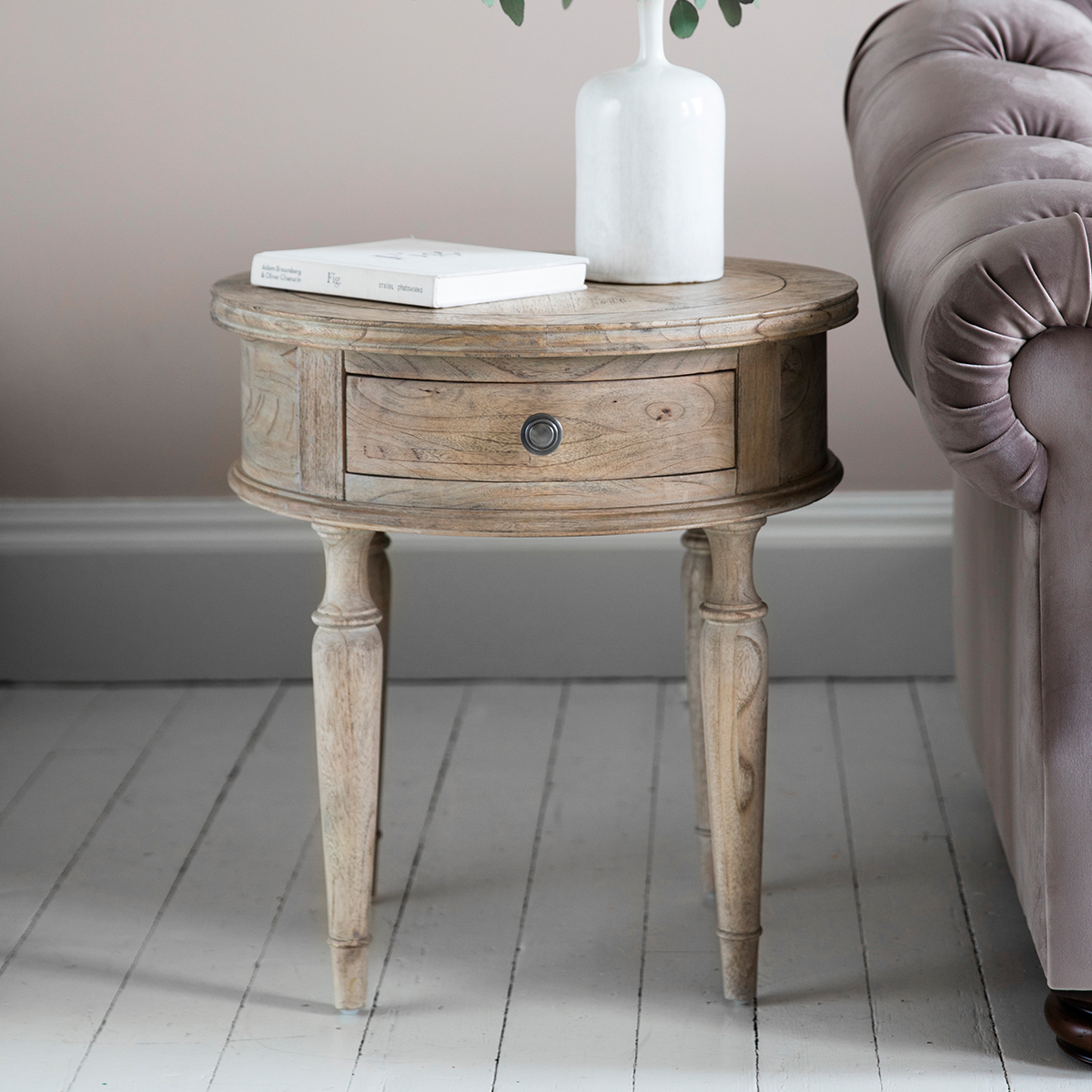 French Colonial style with a hint of classical inspiration, the Ivy Round 1 Drawer Side Table is part of a gorgeous range of furniture. The rounded legs and natural markings within the wood emphasise its strong character with a truly solid traditional style. A useful drawer to store away coasters and other small objects.