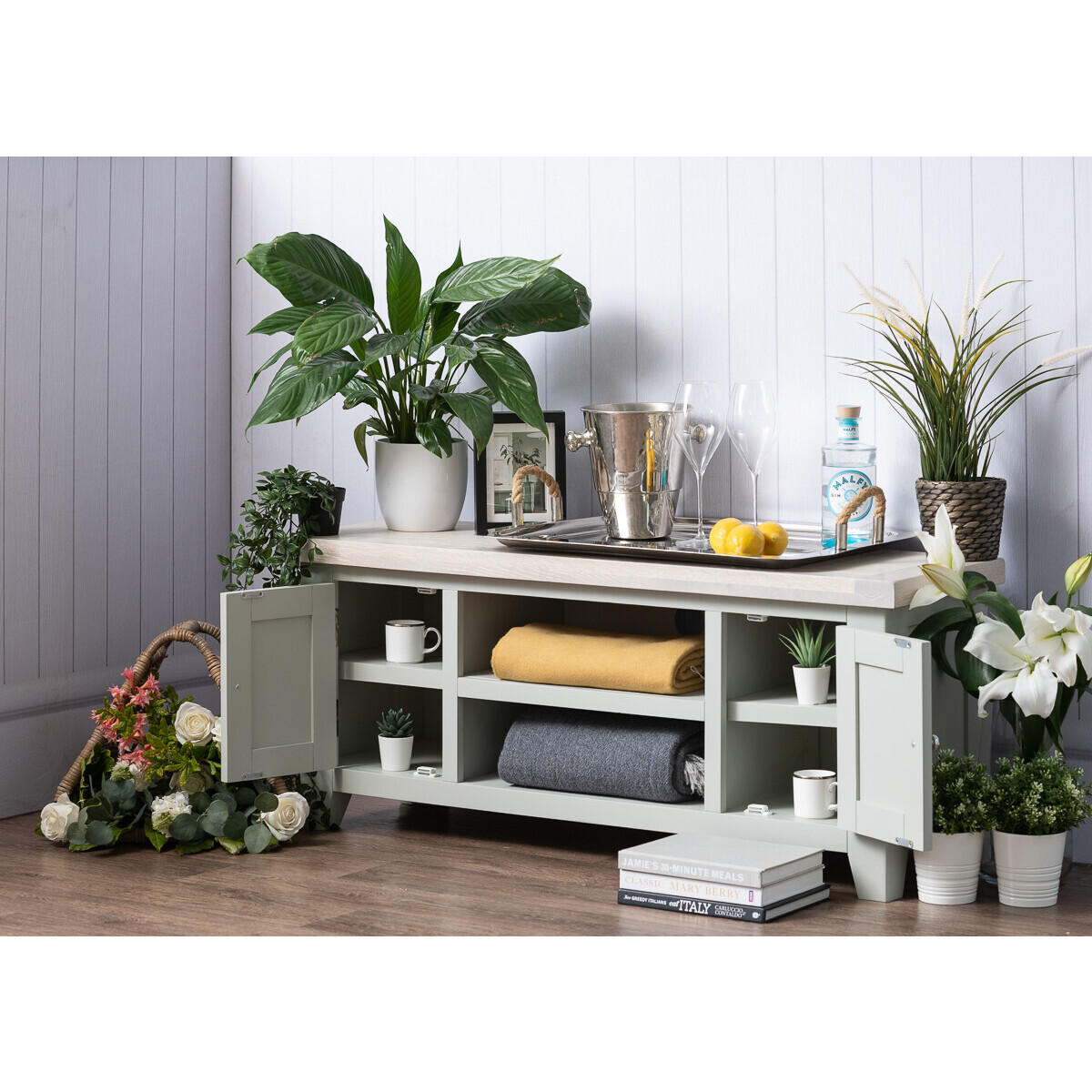 The large TV unit from the Felix range is perfect for a modern or traditional living space - with storage space hidden behind two doors, and two shelves which are the ideal space to put a set top box or games console. The Felix range is crafted from stunning solid oak, oak veneer and solid pine. Each item is finished with a contemporary grey paint and adorned with simple handles, allowing it to match with decor of any style or type. High quality oak, pine and oak veneer construction. Hidden storage space. Space for a set top box and a games console. Contemporary grey painted finish.