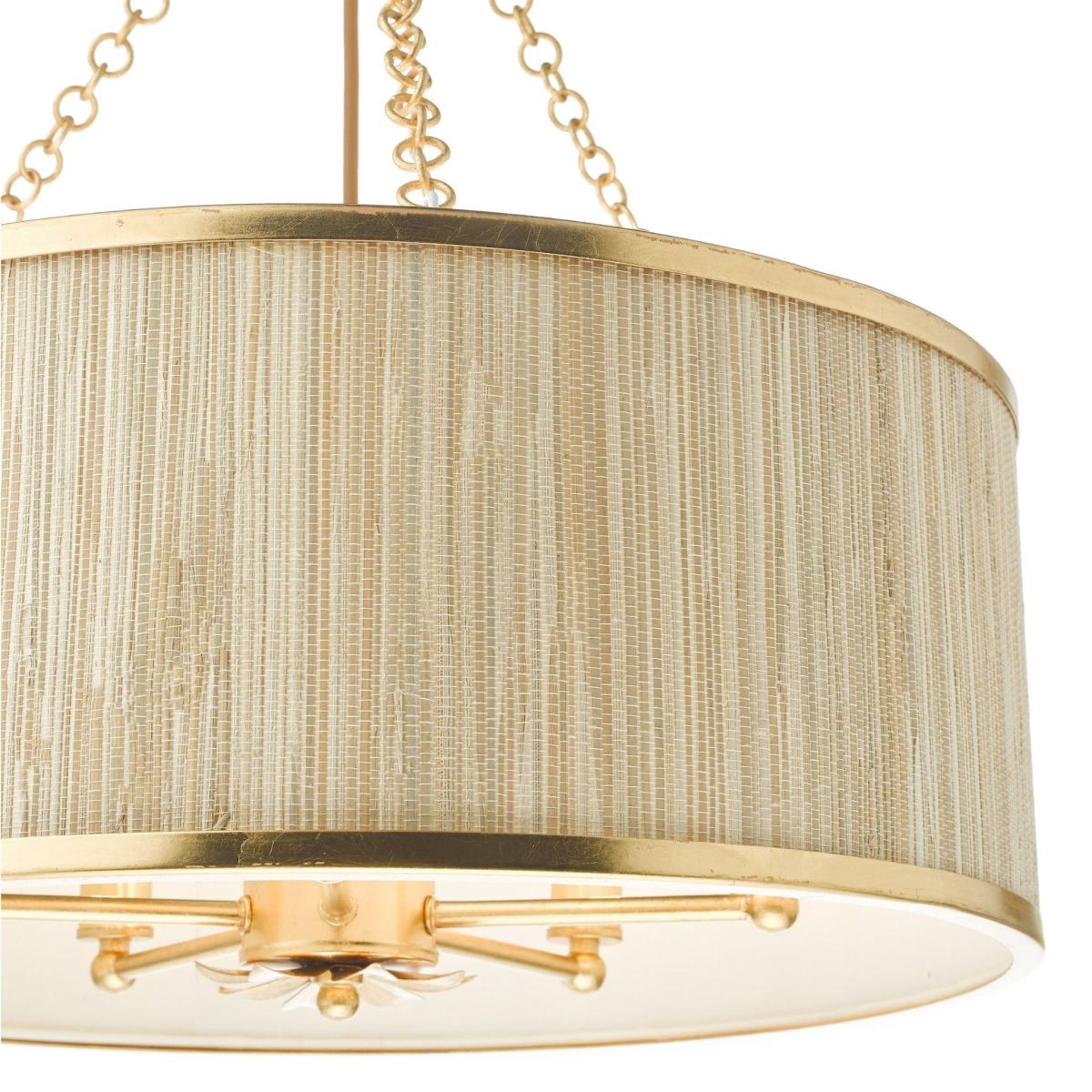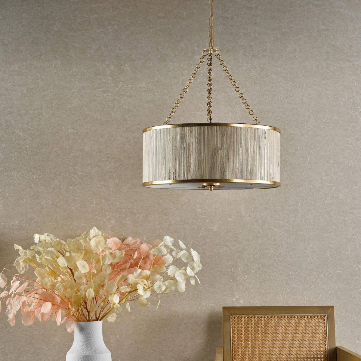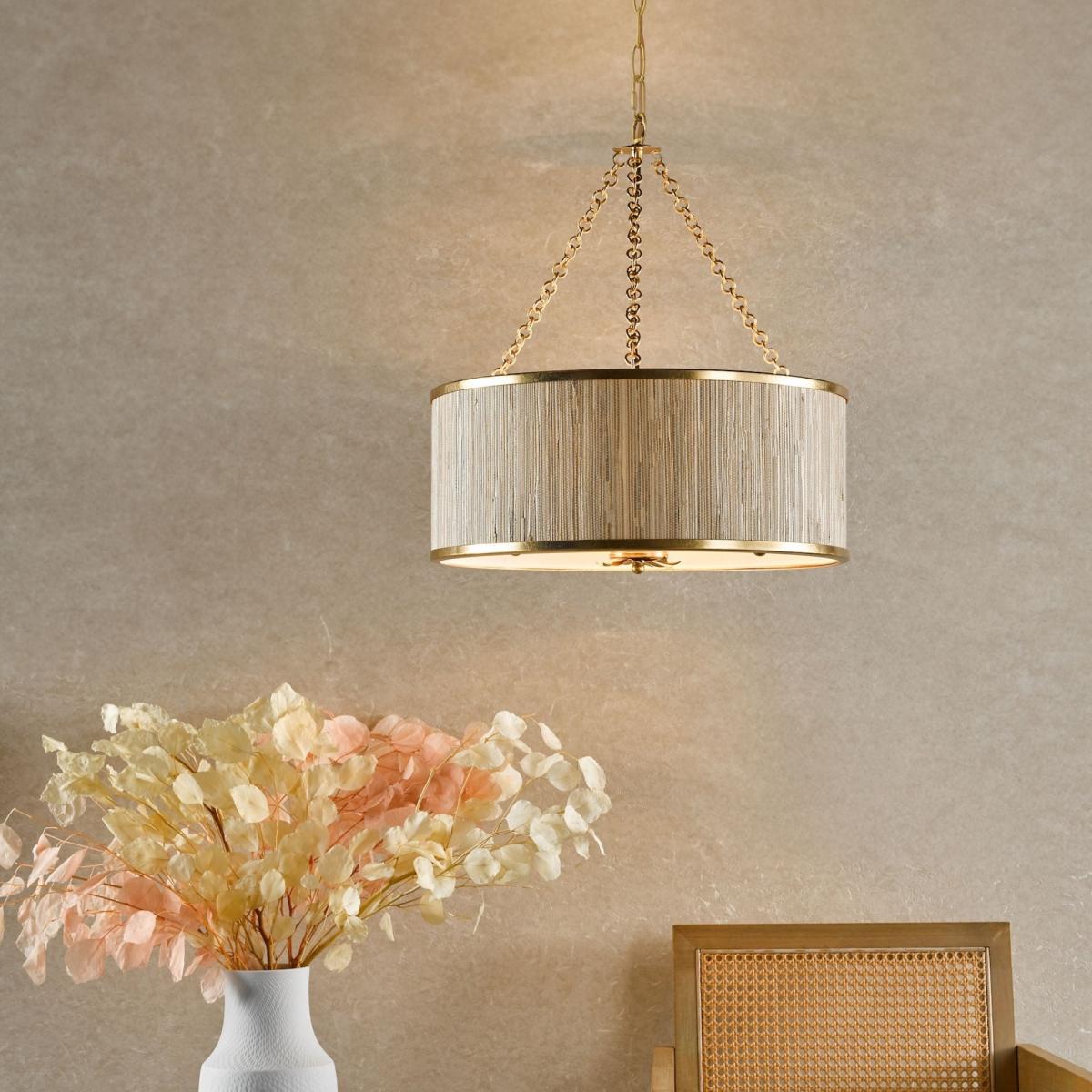 Fenella 5-light pendant ceiling light, featuring a linen-lined drum shade with natural seagrass, covering a five arm pendant finished with gold leaf rims and chain. The Fenella pendant ceiling light brings a golden elegance to any space. Featuring a linen-lined drum shade adorned with natural seagrass, this pendant light offers a relaxed yet sophisticated aesthetic. The soft texture of the seagrass contrasts beautifully with the sleek, five-arm structure, finished with gold leaf rims for an added touch of luxury. Suspended from a matching gold chain, the Fenella pendant light creates a warm and inviting glow, perfect for dining areas, living rooms or entryways. Its combination of natural materials and refined gold detailing makes it an ideal statement piece, blending coastal charm with timeless elegance in any interior. Fenella 5-light pendant ceiling light, featuring a linen-lined drum shade with natural seagrass, covering a five arm pendant finished with gold leaf rims and chain. The Fenella pendant ceiling light brings a golden elegance to any space. Featuring a linen-lined drum shade adorned with natural seagrass, this pendant light offers a relaxed yet sophisticated aesthetic. The soft texture of the seagrass contrasts beautifully with the sleek, five-arm structure, finished with gold leaf rims for an added touch of luxury. Suspended from a matching gold chain, the Fenella pendant light creates a warm and inviting glow, perfect for dining areas, living rooms or entryways. Its combination of natural materials and refined gold detailing makes it an ideal statement piece, blending coastal charm with timeless elegance in any interior.