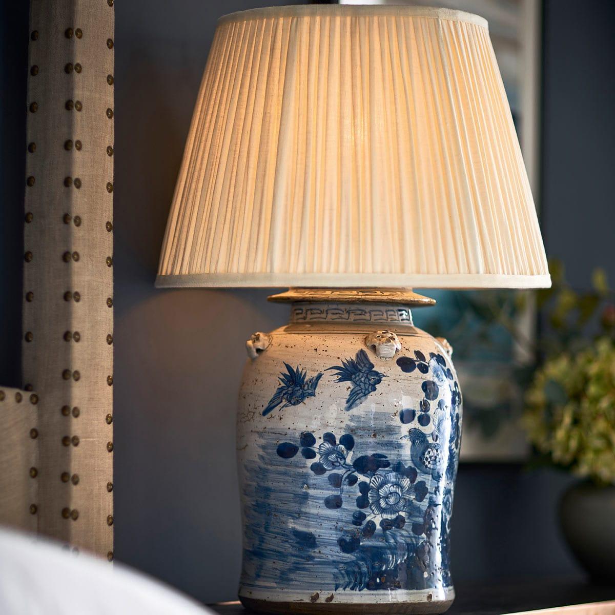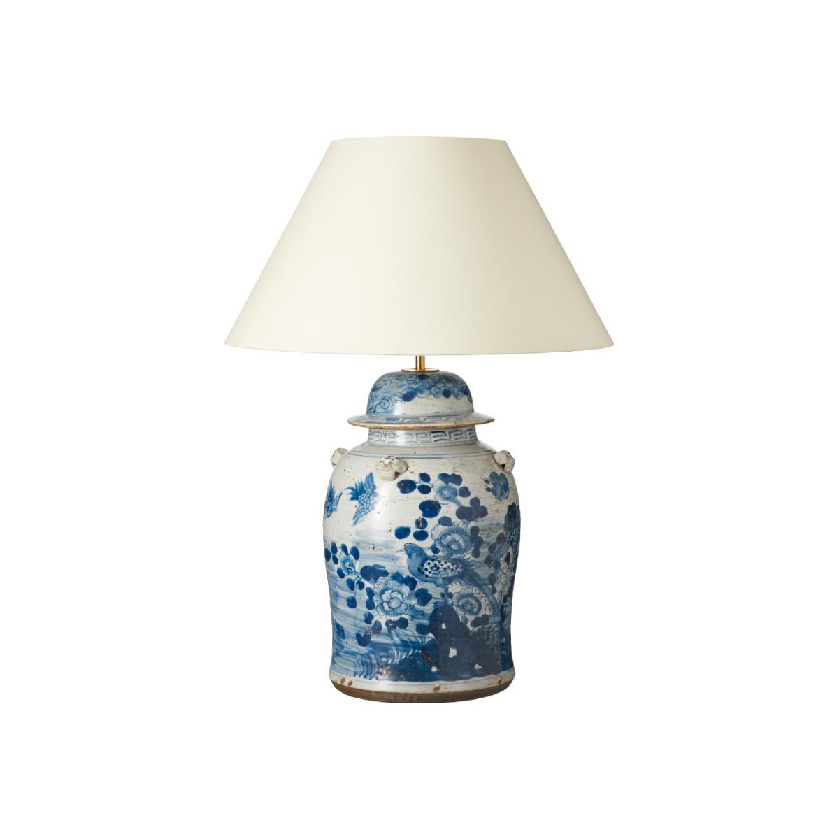 This beautiful ceramic lamp is inspired by the traditional ginger jar. It is hand-decorated with gargoyles and birds in a classic Chinese landscape scene. The hand-painted birds have a mythical quality about them, which is why we named it after the immortal birds in Chinese mythology that reigned over all others. A purposefully distressed finish makes the Fenghuang look antique. Fenghuang Table Lamp - Blue