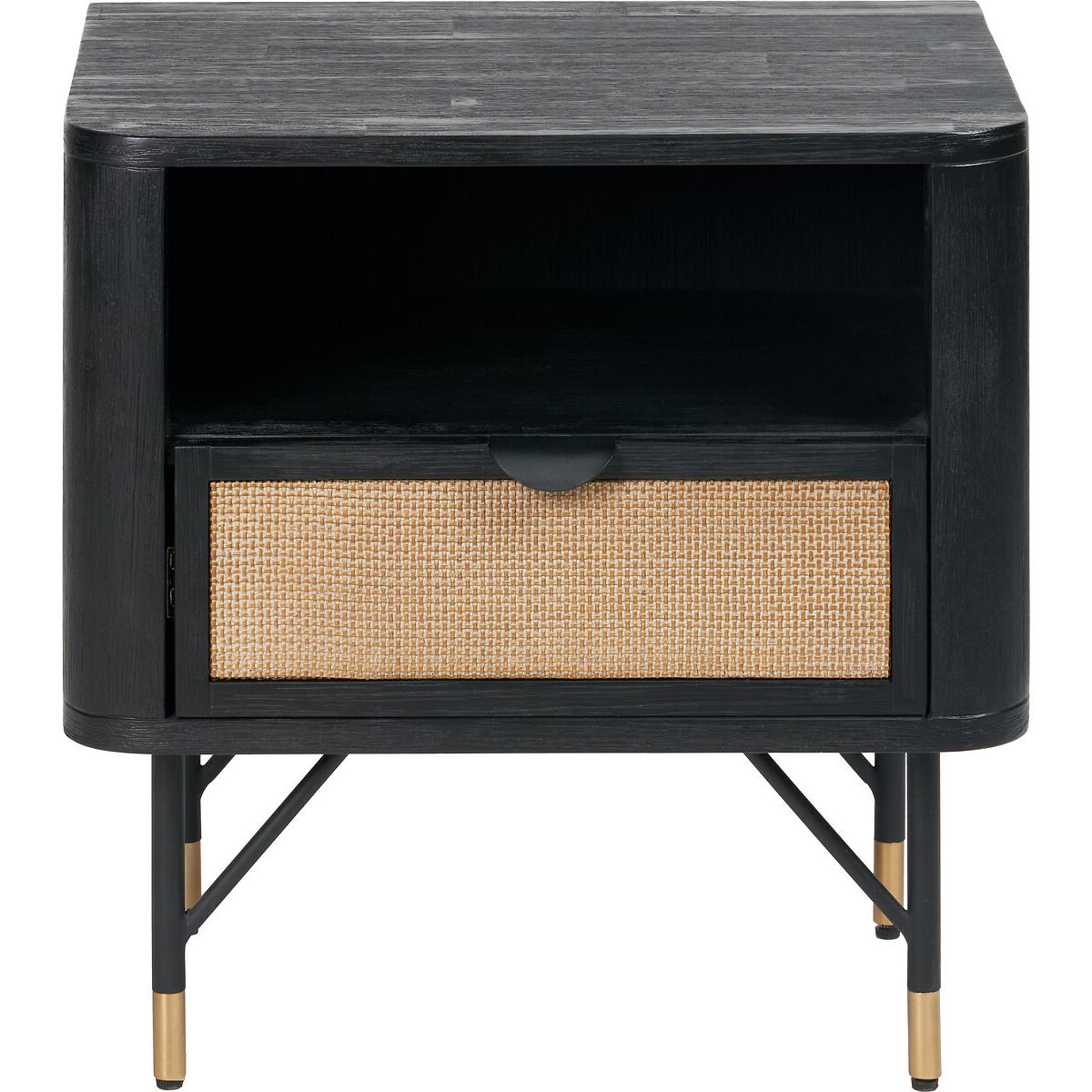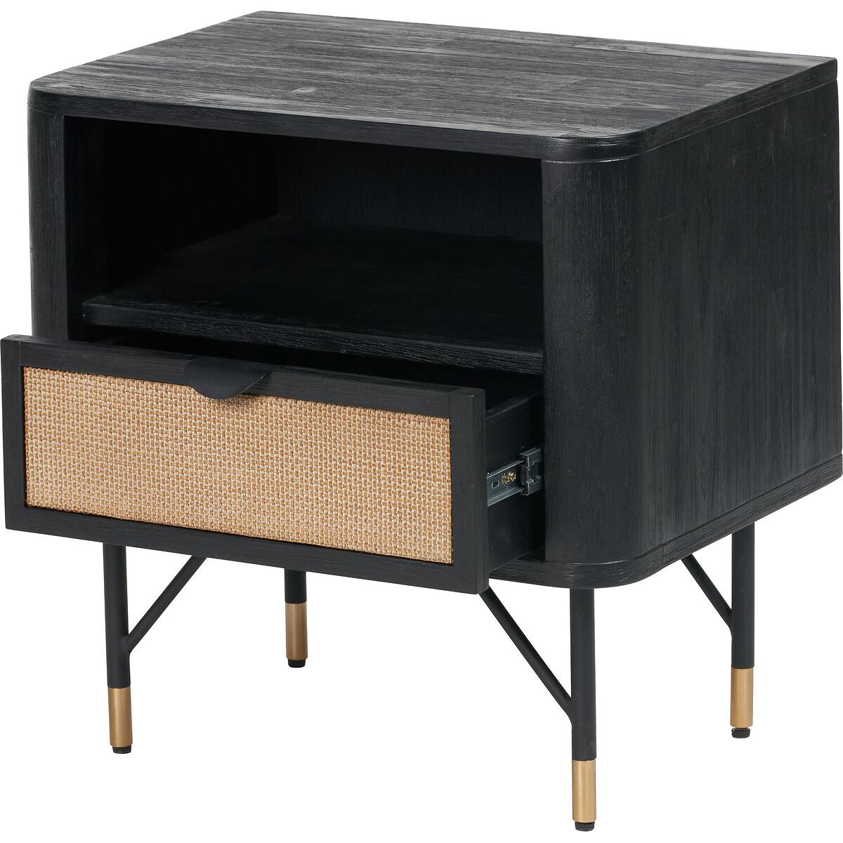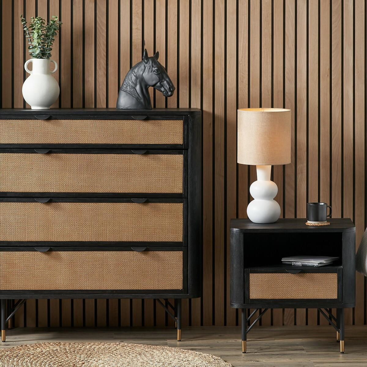 The Fenix Bedside Table blends contemporary style with organic texture, making it a standout addition to any bedroom. Handcrafted in Vietnam, it showcases a striking contrast of black-finished acacia wood and a woven natural rattan drawer front, all perched atop of matte black metal legs tipped with gold to add a touch of luxury. Subtle matte black handles complete the look. With its woven rattan detailing and wood grain finish, this bedside unit is the perfect nod to the neutral trend. Product Details• Single drawer• Contrasting rattan and wood finish• Woven rattan detail• Sleek matte black metal legs tipped with gold • Subtle matte black handles• Interior shelf• Partial assembly required (legs/feet only)• Wall fixings included• 1 year manufacturers warranty. Product Composition - Acacia wood 90%, Rattan 7.5%, Iron 2.5%Product Dimensions - 55 cm x40 cm x56 cm , Weight - 14 KG• Shelf size: 51 x 37 x 16 cm Package Dimensions - 62 cm x 62 cm x 48 cm, Weight 19 kg. This product will be dispatched by one of our trusted suppliers. You’ll be contacted by their selected courier about your delivery.
