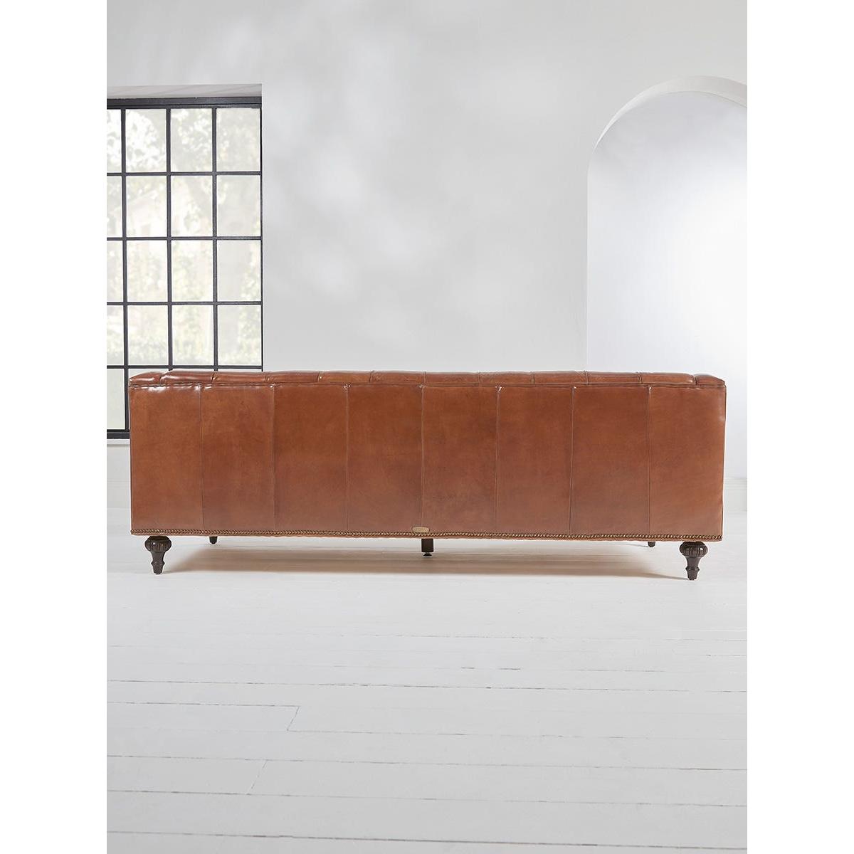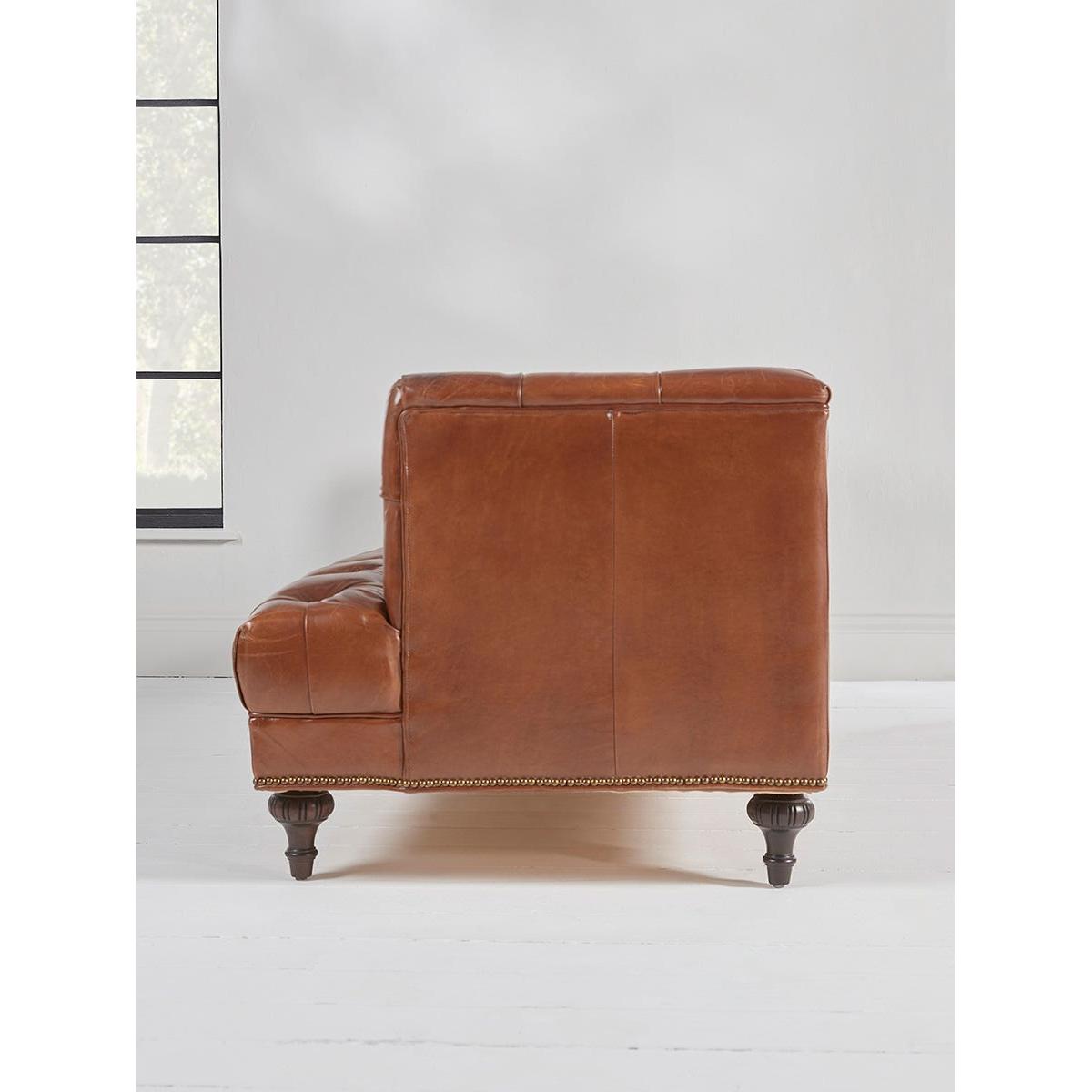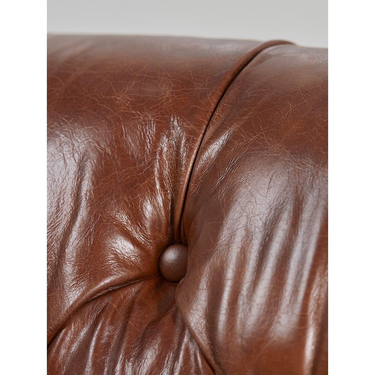 In deep glossy conker-coloured leather, our Fenn Sofa is the embodiment of sophisticated luxury and premium quality. Classic Chesterfield styling with a contemporary twist makes this a great seating option for richly decorated traditional homes as well as clean-cut contemporary spaces. The deep buttoned back and seat of this three-seater leather sofa are finished with a brass studded trim and ornate carved dark wood legs.
