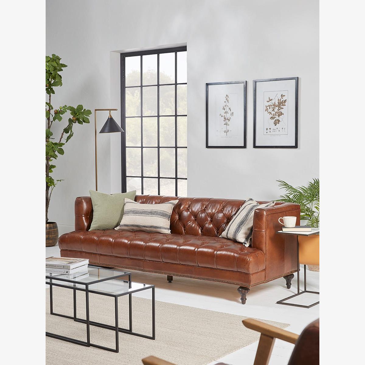 The Fenn sofa in tan leather is a classic piece that injects warmth and sophistication into a variety of interiors. I love how its rich hue adapts well both in traditional settings with antique accents and in modern spaces with minimalist decor. Its leather fabric is not only durable but ages beautifully, developing a unique patina over time. For styling, I suggest pairing it with neutral-toned cushions and throws to keep the look cohesive, or add a pop of colour with some patterned accessories for a more eclectic vibe. Practical tips include using a leather cleaner to maintain its finish and placing it away from direct sunlight to prevent fading, making this sofa both a stylish and functional focal point.