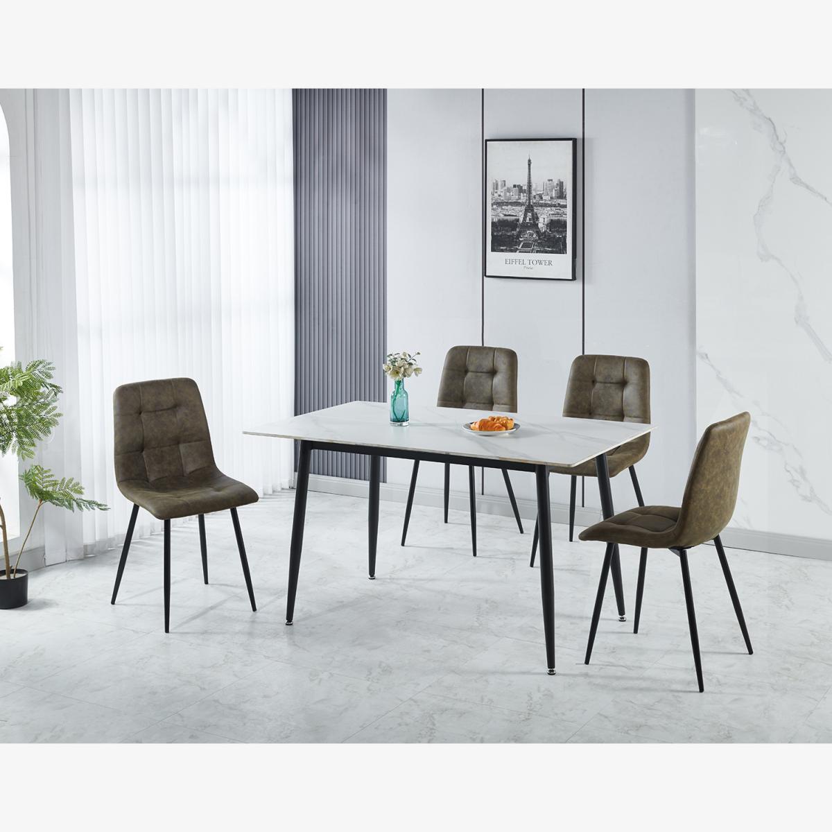 Upgrade your dining space with the Fenton Dining Set, a stylish and contemporary choice for modern homes. Featuring a stunning white marble stone-effect tabletop, this set brings an elegant touch without the high maintenance of real stone. The chairs are available in olive green suede, dark grey suede, and light grey fabric, allowing you to choose the perfect match for your decor. Designed for both comfort and durability, they provide a soft and inviting seating experience. Perfect for family meals or entertaining guests, the four-chair set effortlessly blends style and practicality. UK Mainland delivery only, between 9 am and 9 pm (weekdays) the courier will contact you on the day of delivery to offer a time slot. This takes place within 10 working days (Ground floor only). Please also ensure that we have a note of your up-to-date address and contact information, to be passed to the couriers.