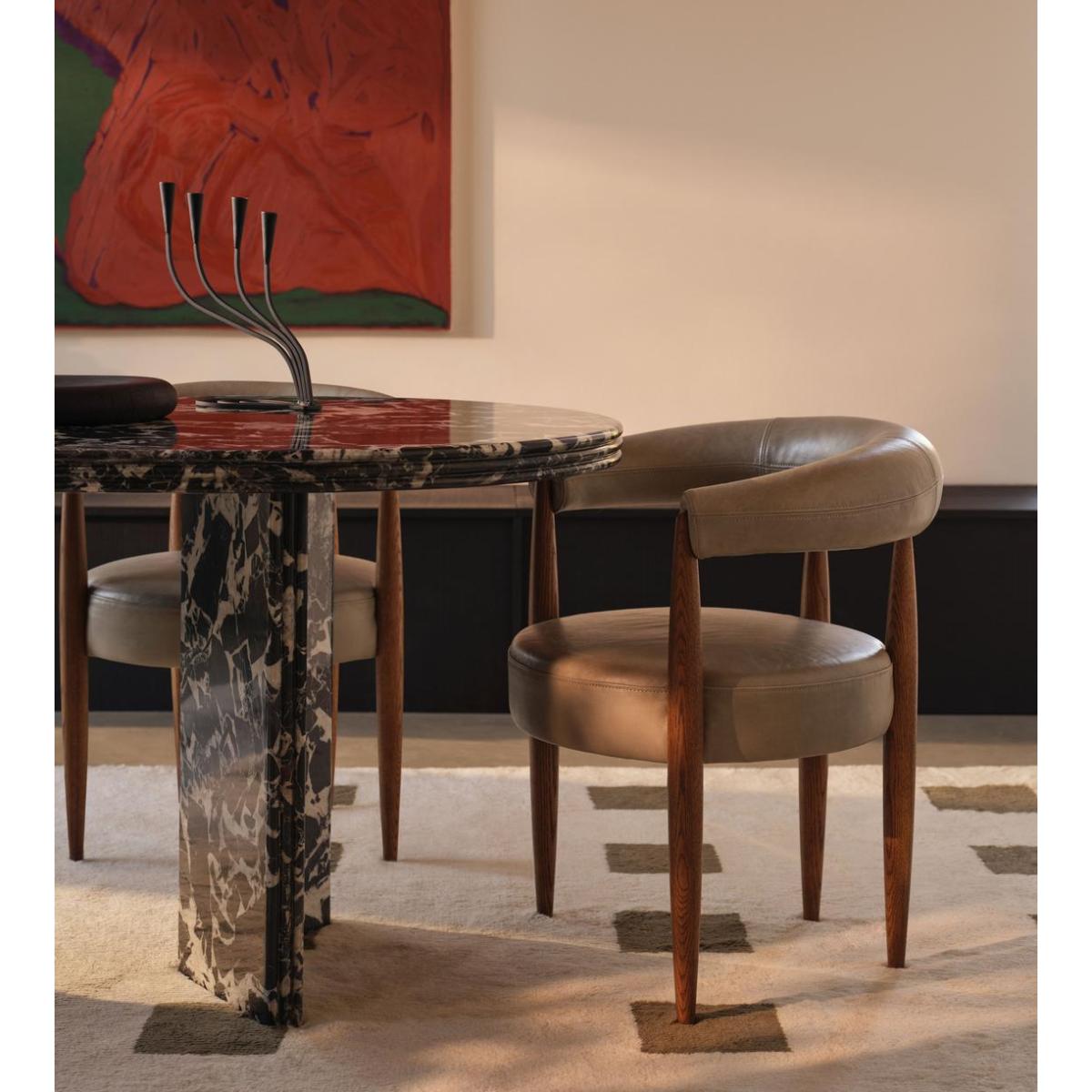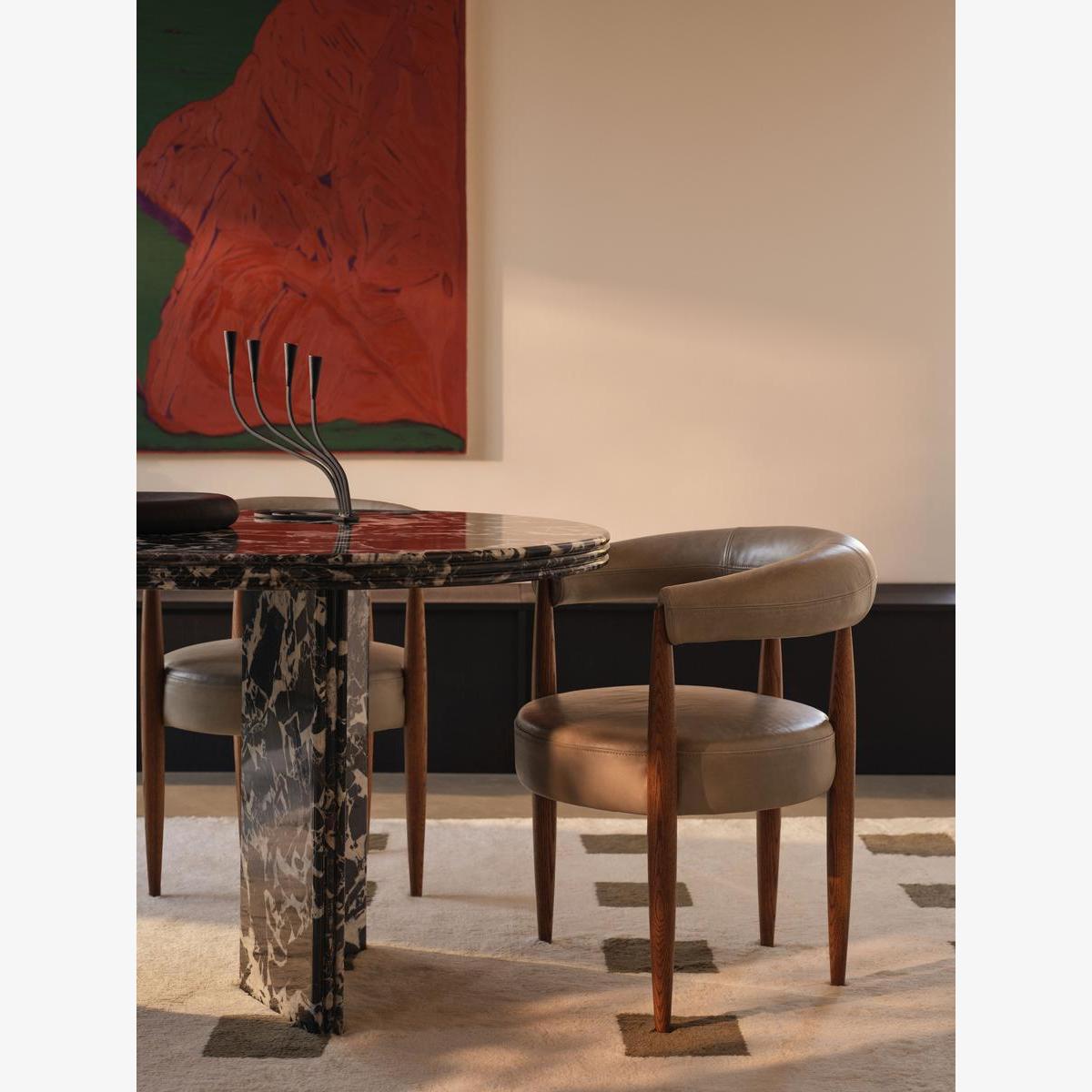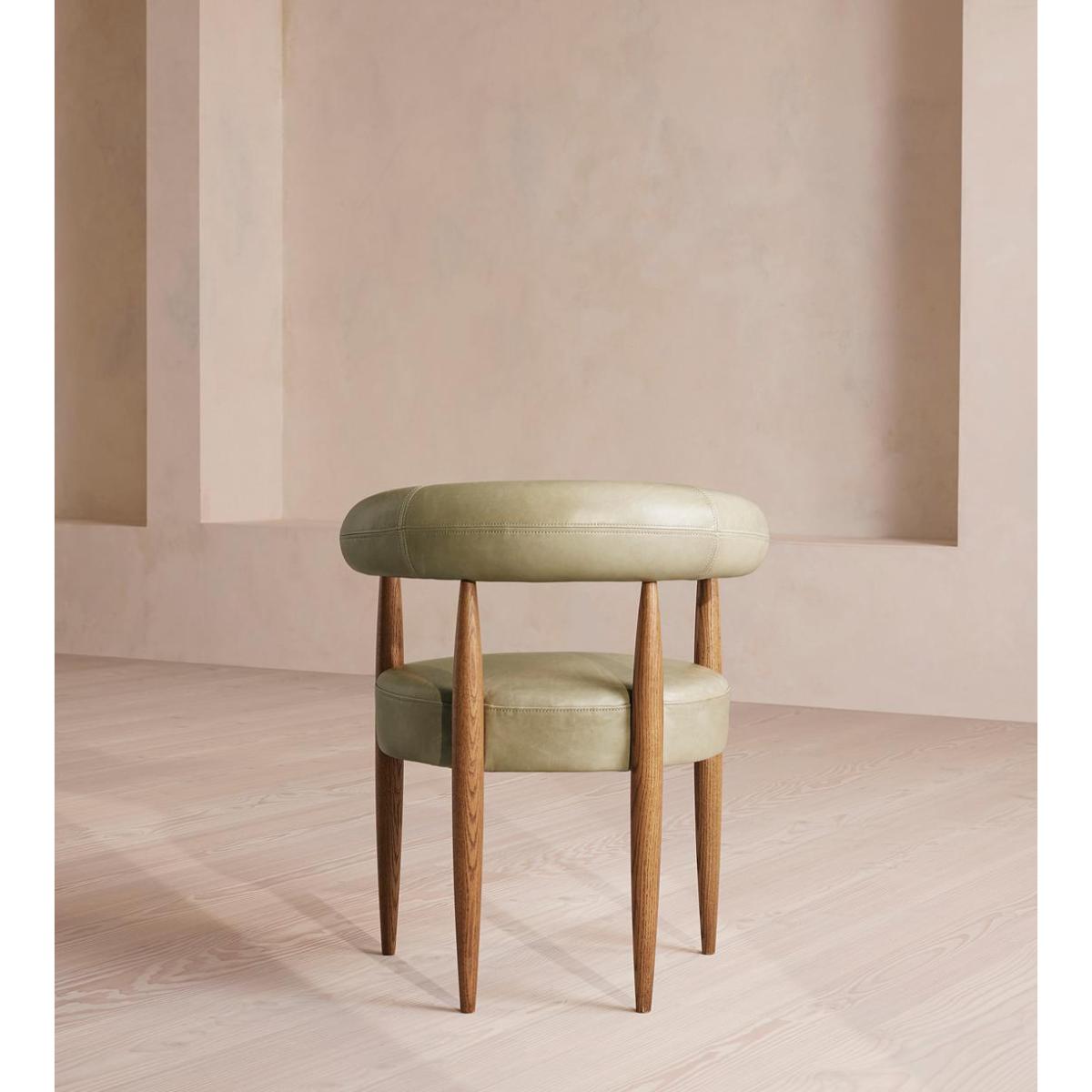 Elongated spindle legs made from oak create a curved silhouette enhanced by a hugging backrest. A curved backrest and circular seat are supported by slender spindle legs carved from oak, creating the architectural but comfortable silhouette of our Fergus dining chair. Both the backrest and padded seat are finished with muted leather upholstery.