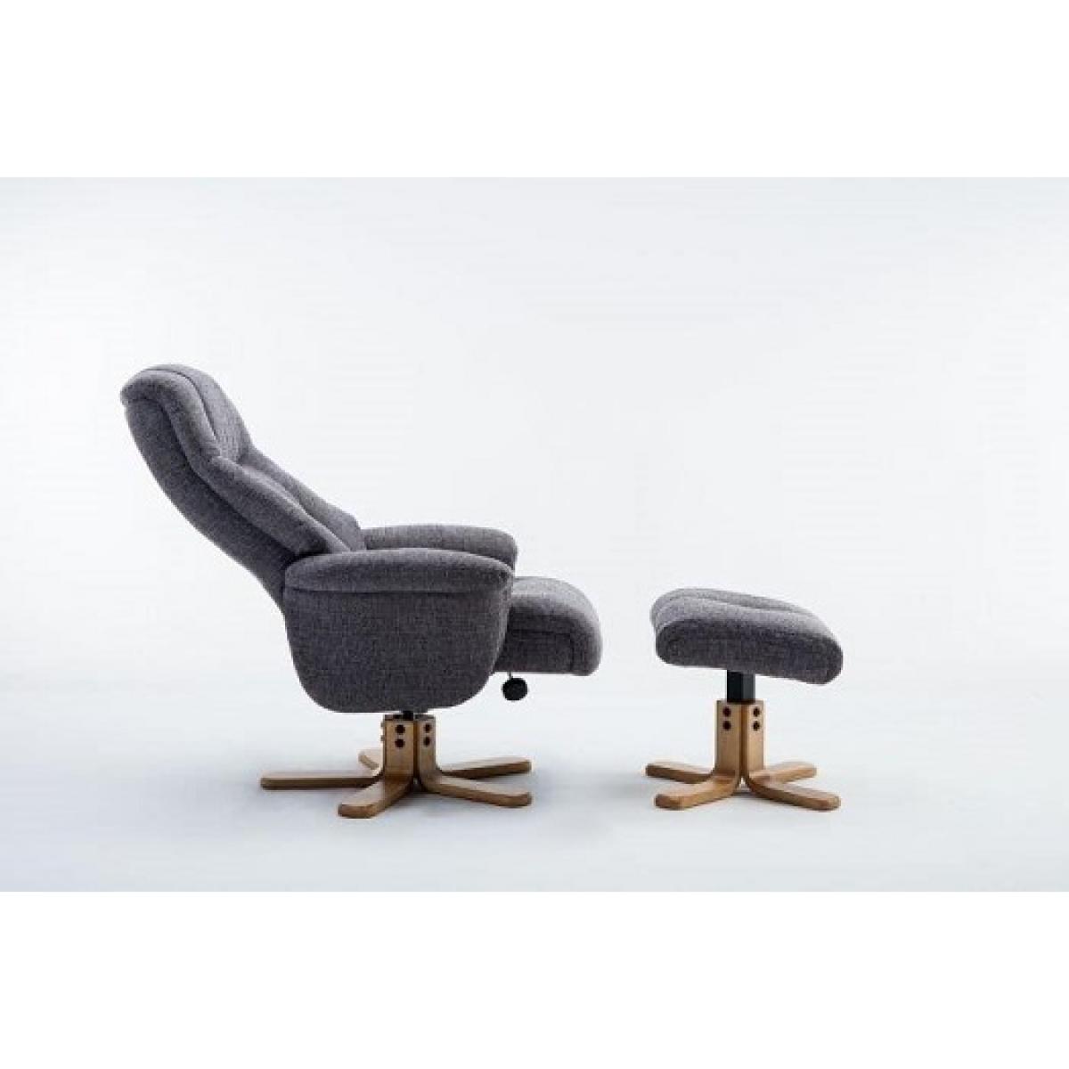 The popular and comfortable Fergus Swivel Recliner is nicely upholstered in a hardwearing fabric Upholstery. This model has been meticulously developed to produce a comfortable and supportive recliner chair, providing strength, durability, supreme comfort and high-quality workmanship. This model has a supportive upholstered round base design which offers extra stability when reclining. This Recliner is supplied with a matching complimenting footstool. This recliner is simple to recline. By leaning back your body weight will recline the chair and, as you lean forward, the chair will return to its original upright position. This model is fitted with a recline tensioner under the front of the seat cushion. This Swivel Recliner is ideal for the user who wants to put their feet up and relax while allowing the stresses of the day to melt away. Material: Fabric. Colour: Grey.