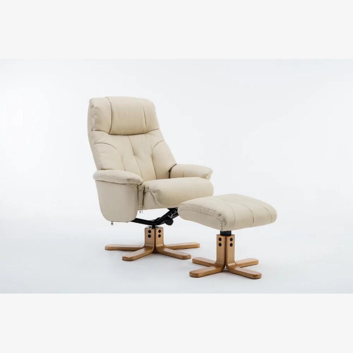 The popular and comfortable Fergus Swivel Recliner is nicely upholstered in a hardwearing fabric Upholstery. This model has been meticulously developed to produce a comfortable and supportive recliner chair, providing strength, durability, supreme comfort and high-quality workmanship. This model has a supportive upholstered round base design which offers extra stability when reclining. This Recliner is supplied with a matching complimenting footstool. This recliner is simple to recline. By leaning back your body weight will recline the chair and, as you lean forward, the chair will return to its original upright position. This model is fitted with a recline tensioner under the front of the seat cushion. This Swivel Recliner is ideal for the user who wants to put their feet up and relax while allowing the stresses of the day to melt away. Material:Faux Leather. Colour: Cream. Reclining Action:Yes. Reclining Type: Manual.