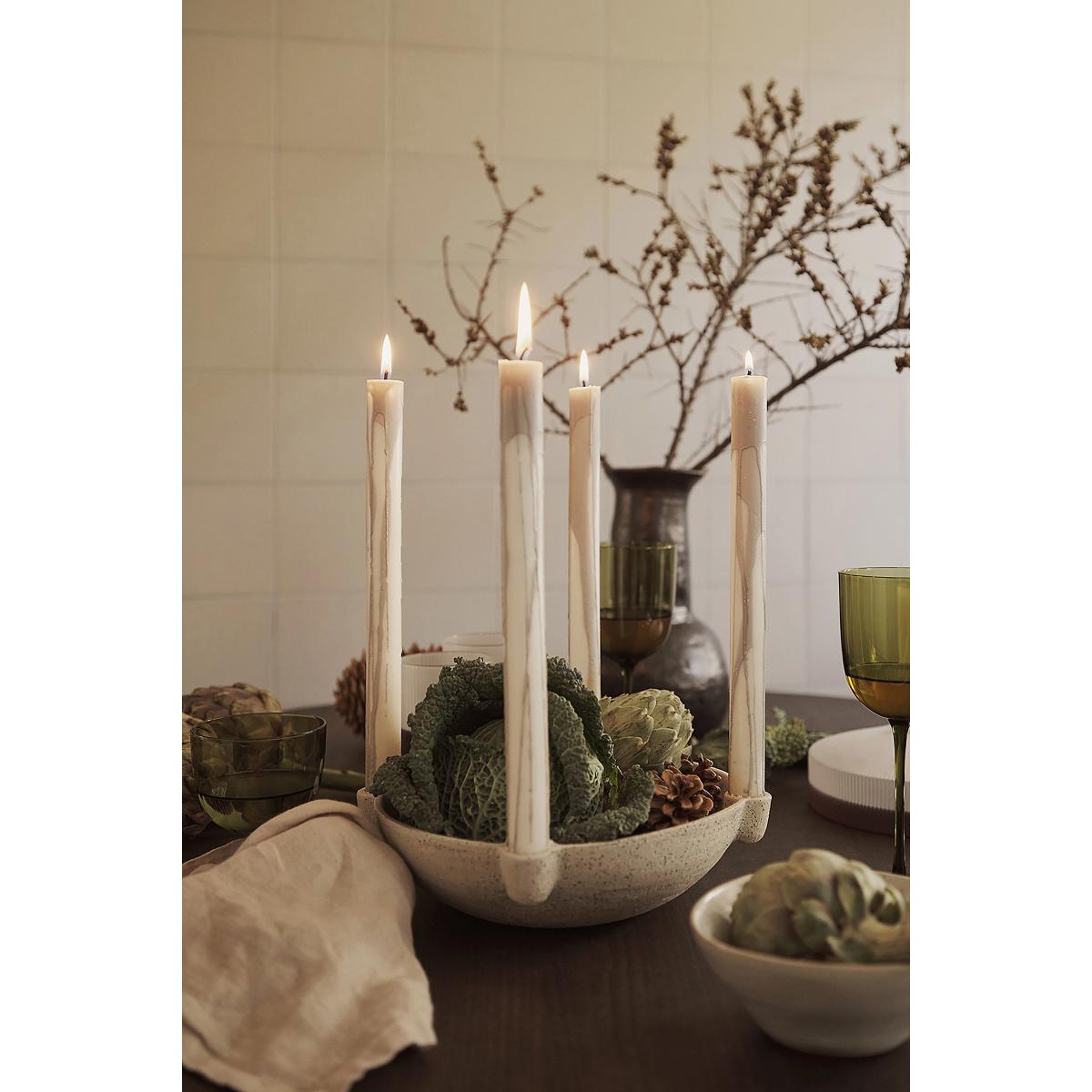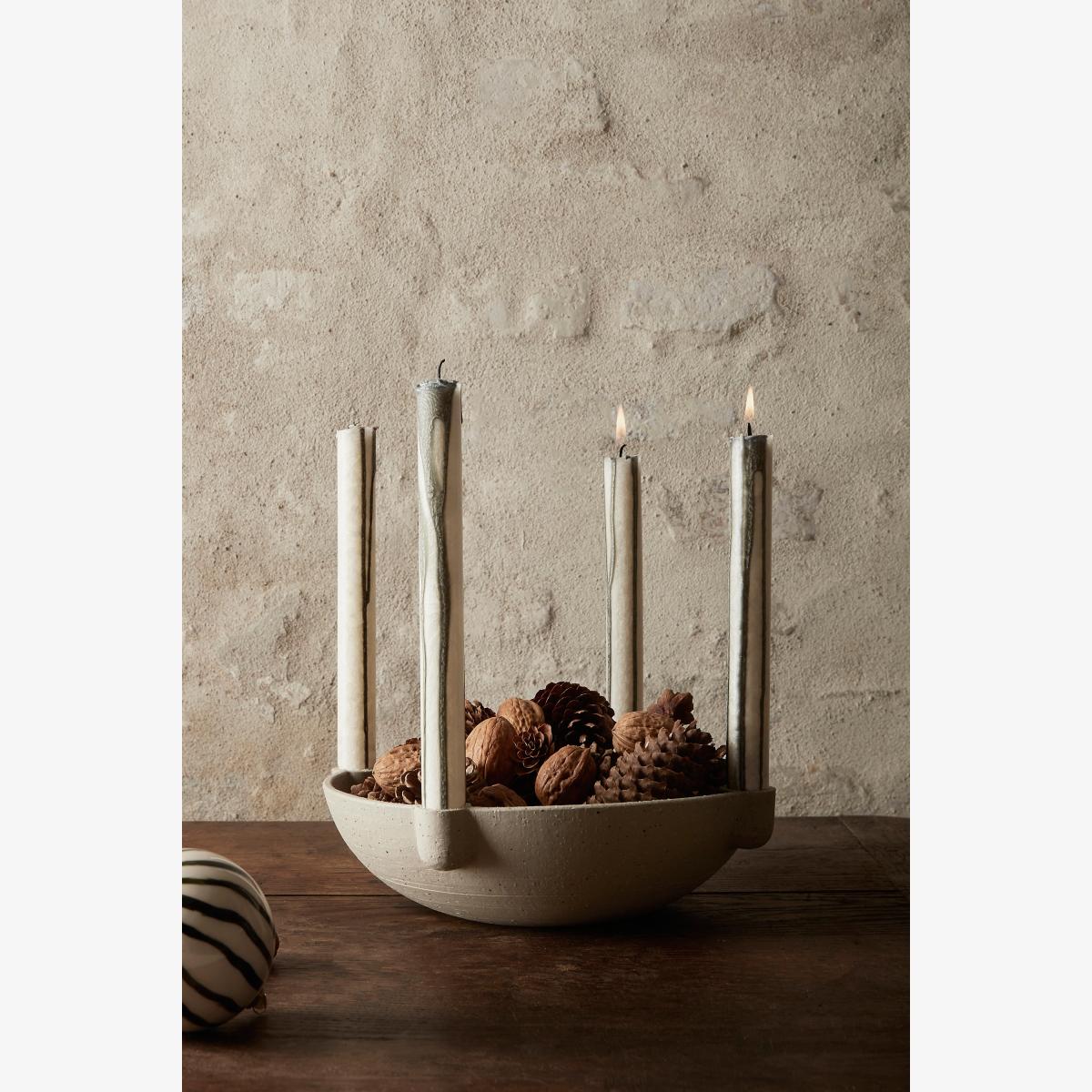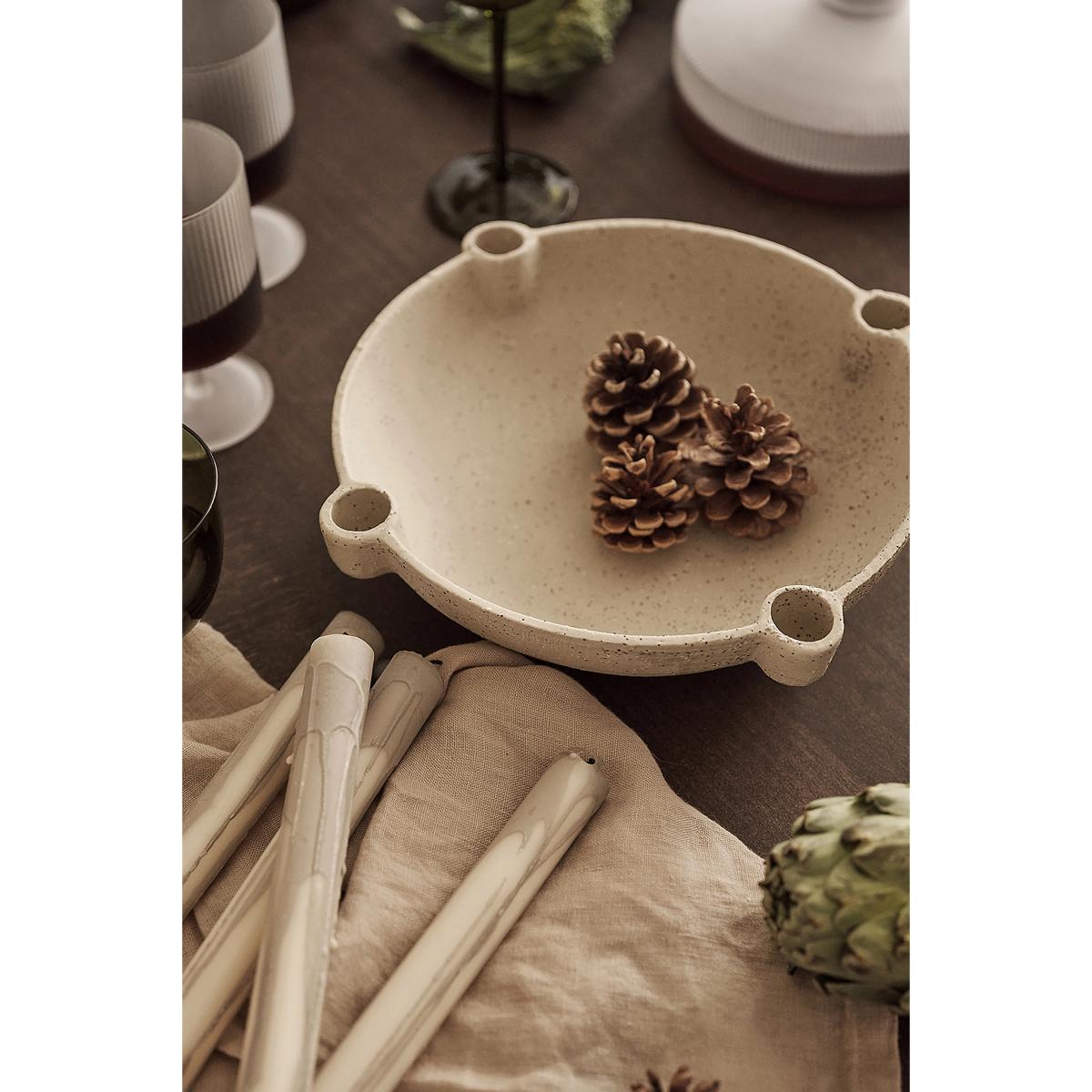 Decorative yet multifunctional, the Bowl Candle Holder is a unique way to display elegant taper candles while storing small items in the centre. * By Ferm Living * Unglazed grainy stoneware * Fits small max 1cm candles * Wipe clean with a damp cloth * Imported