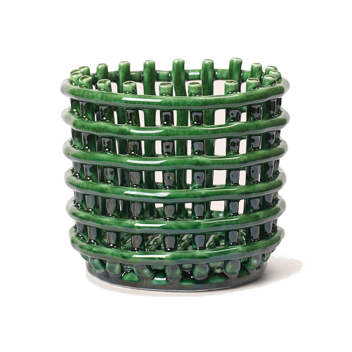 I really like this ceramic basket for its bold colour and textured design, which makes it a standout piece in both modern and eclectic interiors. It works well as a functional storage solution for organising bits and bobs, or as a decorative accent on open shelving or side tables. Its vibrant green adds a pop of colour to neutral schemes, but it can also complement other jewel tones or earthy palettes. Practical styling tips include using it to hold small plants for a fresh look, or to store accessories like keys or jewellery. Its chunky ceramic construction makes it durable, while the open weave design keeps it visually light, making it versatile for a variety of spaces and styles.