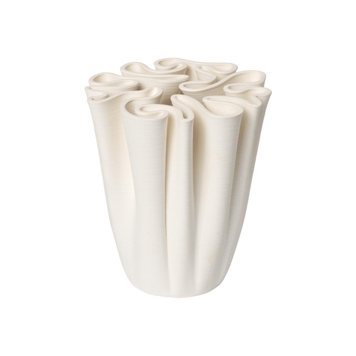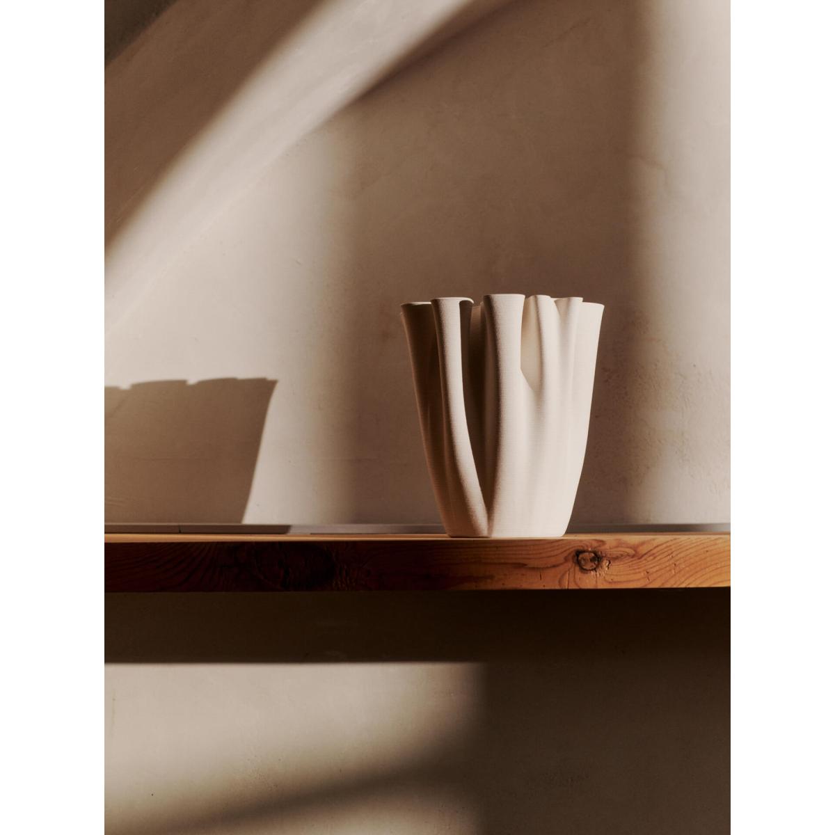 I love this vase for its sculptural yet understated design, making it a versatile piece that can complement a wide range of interiors. Its off-white colour and organic, ruffled texture work beautifully in both modern and Scandinavian-inspired spaces, adding a subtle touch of elegance without overpowering other decor elements. In practical styling, I recommend using it as a standalone statement on a mantel or side table, or pairing it with dried grasses or minimalist blooms for a fresh take. Its shape is ideal for showcasing larger, statement stems or even a small bouquet, making it both functional and stylish.
