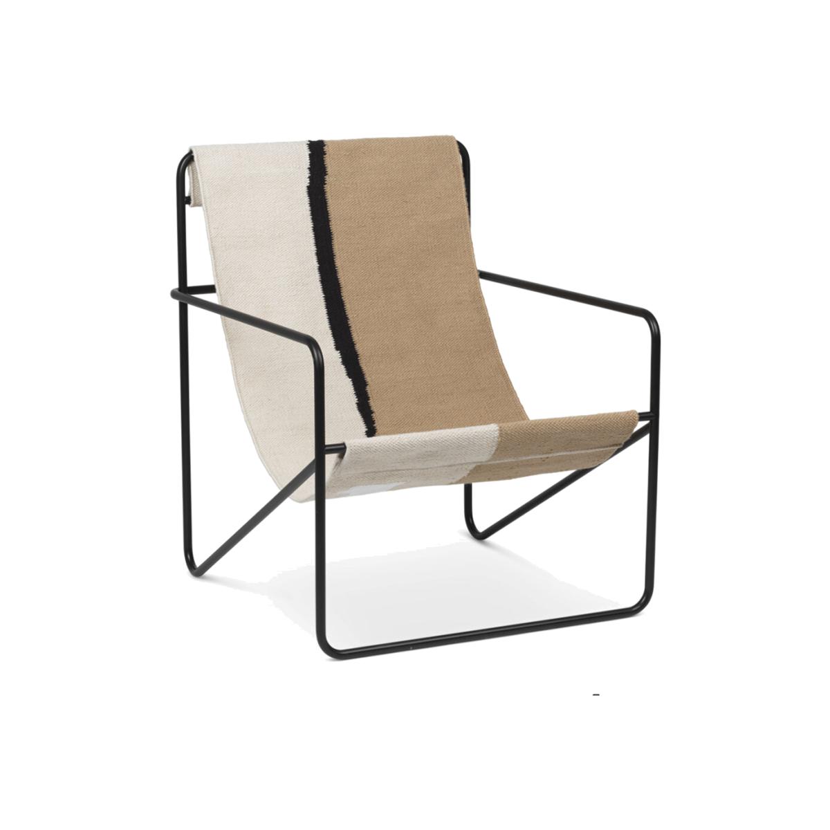 Give your interior a modernist update with the Desert lounge chair from ferm LIVING. Crafted from tubular powder-coated steel frame, in a choice of black or cashmere colours, it holds an interchangeable woven textile seat made from recycled plastic bottles. Suitable for use both indoors and out, the Desert lounge chair is the perfect place to sit back and relax. Key features: * Material: powder coated metal, fabric seat * Dimensions: W63xH77.5xD66cm * Hand-woven fabric seat * Made from recycled plastic bottles * Black coloured frame * With off-white, neutral & black seat * Suitable for outdoor use * Wash at 30°C * Seat removable for washing at 30°C, dry flat