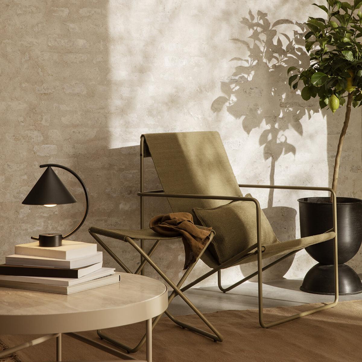 Give your interior a modernist update with the Desert lounge chair from ferm LIVING. Crafted from tubular powder-coated steel frame, in a choice of black or cashmere colours, it holds an interchangeable woven textile seat made from recycled plastic bottles. Suitable for use both indoors and out, the Desert lounge chair is the perfect place to sit back and relax. Key features: * Material: powder coated steel, recycled plastic * Dimensions: W63xH77.5xD66cm * Seat height: H20cm * Olive green colour * Handwoven from PET yarn * Made up of post-consumer plastic * The equivalent of 53 plastic bottles * Sustainable and durable * Suitable for indoor and outdoor use * Wipe clean with a damp cloth * Machine wash seat at 30°C