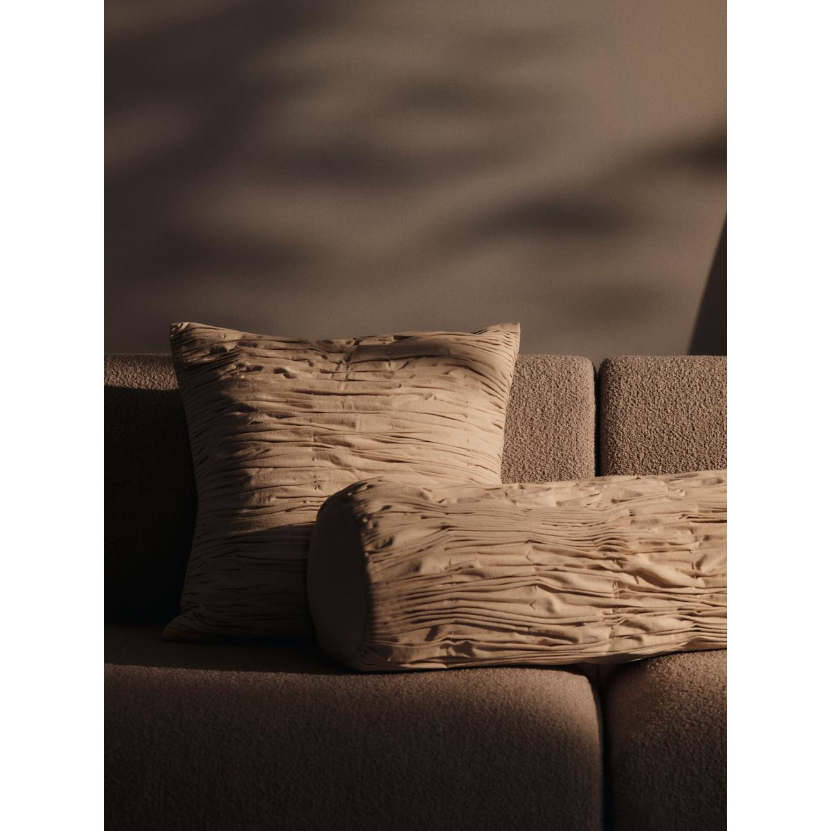 Falda smocked bolster cylinder cushion from Ferm Living is a long bolster cushion in GOTS-certified organic cotton filled with feather and down. The traditional smocking technique gives the fabric a beautifully gathered surface that feels soft and inviting. Each bolster cushion is unique thanks to the craftsmanship and becomes a tactile detail that adds warmth and character to the sofa or bed.