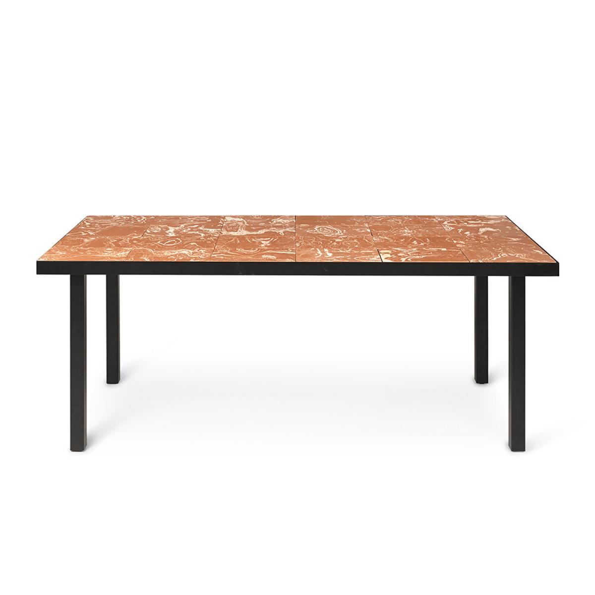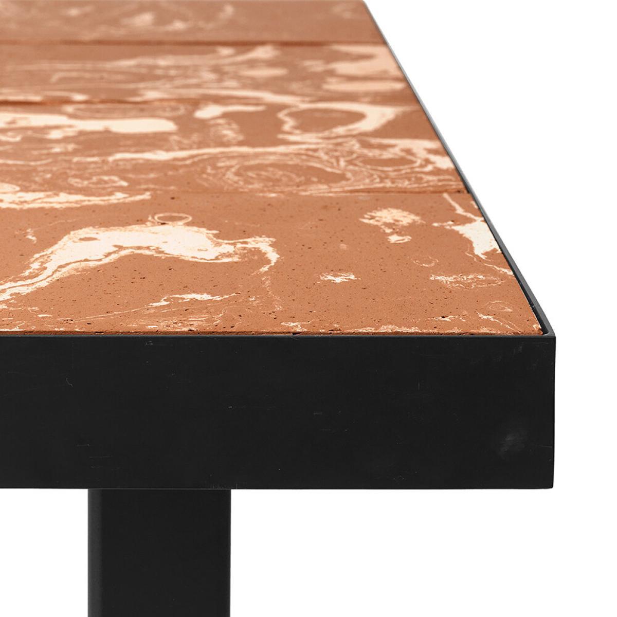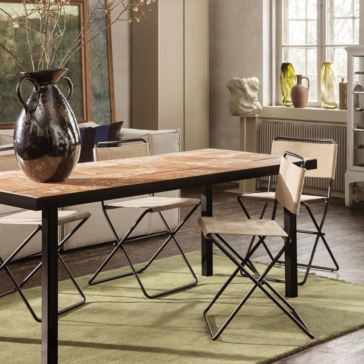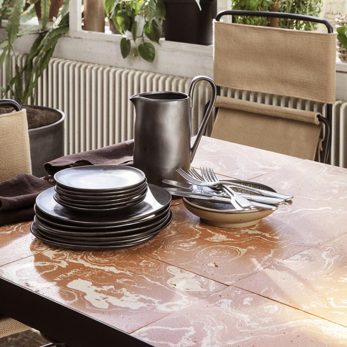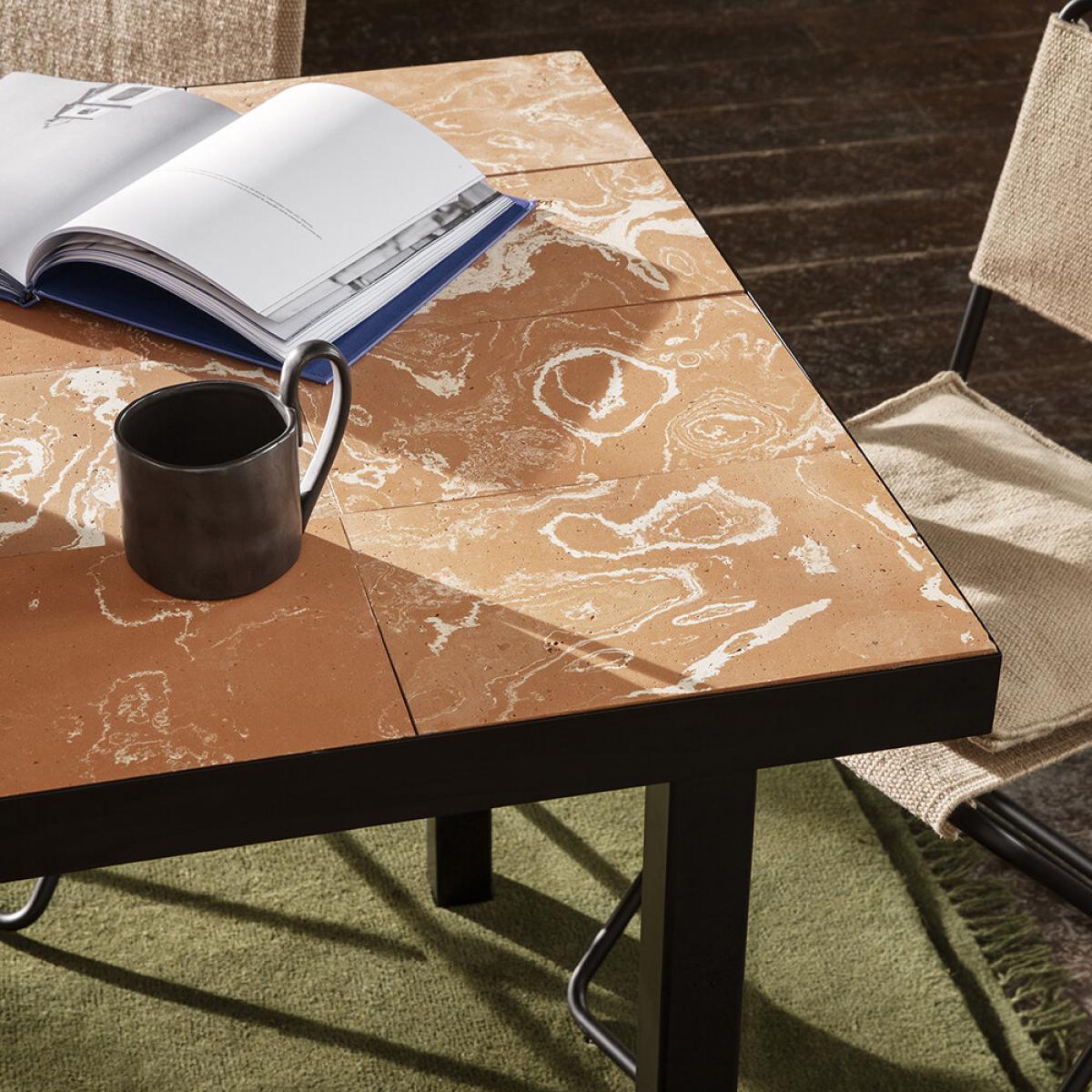 This Flod dining table from Ferm Living is perfectly adapted for indoor-outdoor living. Featuring a graphic, streamlined galvanized steel frame, it is contrasted perfectly by the warm, natural texture of the ceramic tiles. Made in Italy using the finest clay from the River Po, the tiles have a rich tactility and have been expertly crafted using only water, fire and human hands. The tiles are placed into the frame unsealed, allowing any rain or moisture to pass in between the tabletop and the frame. It’s a wonderful addition to your home or garden.