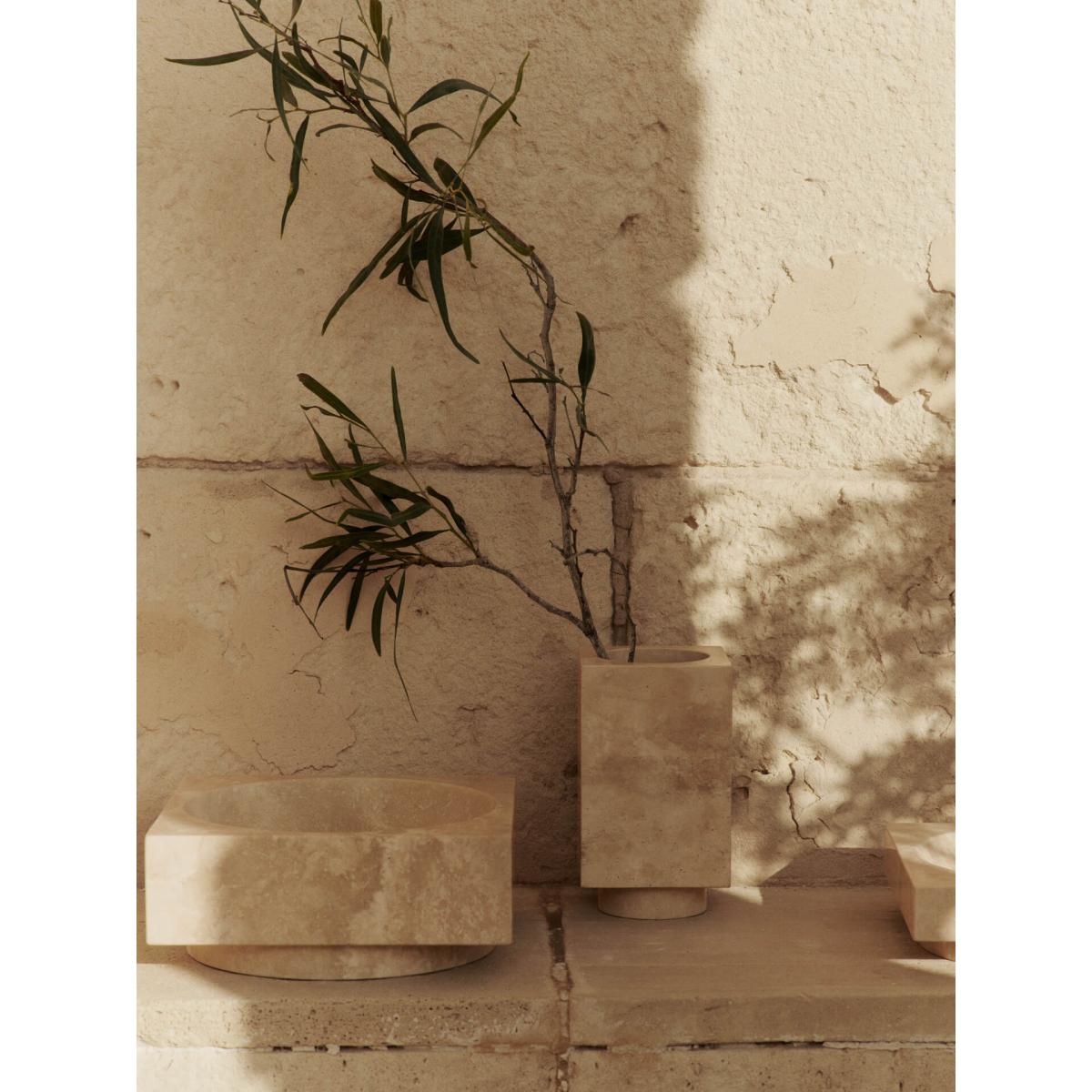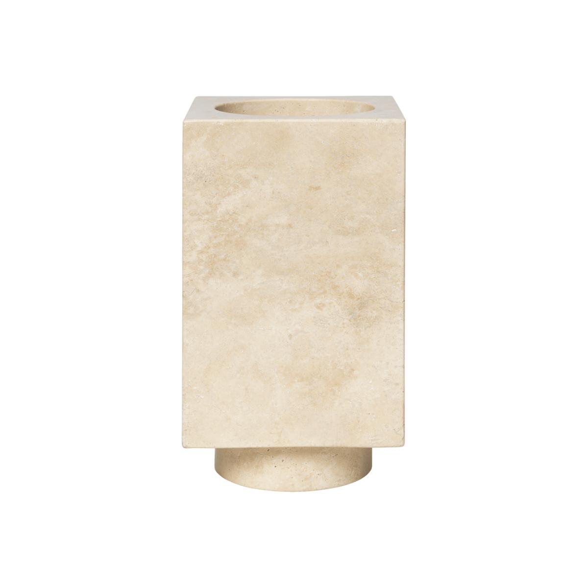 Hew vessel 21 cm from Ferm Living is a sculptural travertine vase that combines minimalist design with the natural beauty of the stone. Its rectangular shape and rounded concave centre create a unique balance between soft and angular lines. As it is made of solid travertine, each piece has its own unique character. A sleek and exclusive detail for modern interiors.
