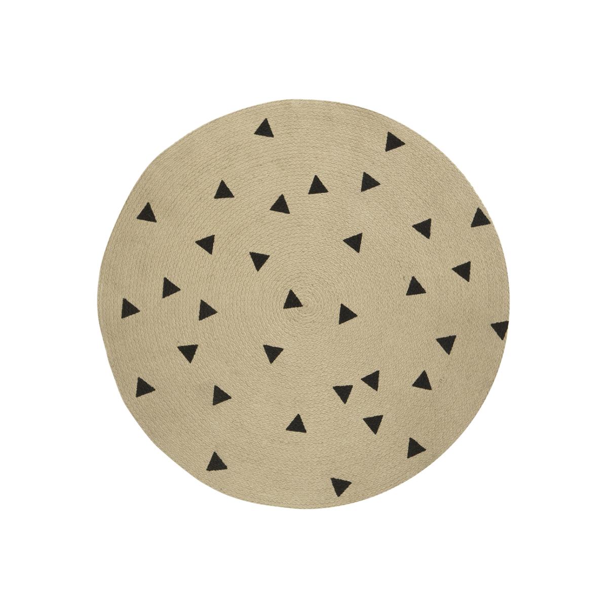 Create a calming space for your little treasures with this Jute round rug from Ferm Living. Made from 100% jute in a natural shade, it is adorned with a scattered black triangle design across the surface. Distinctly Scandinavian in design, it will infuse the space with subtle pattern. Key features: * Dimensions: Ø100cm * Material: 100% jute * Round rug * Natural coloured rug * With a scattered black triangle print * Foam wash only