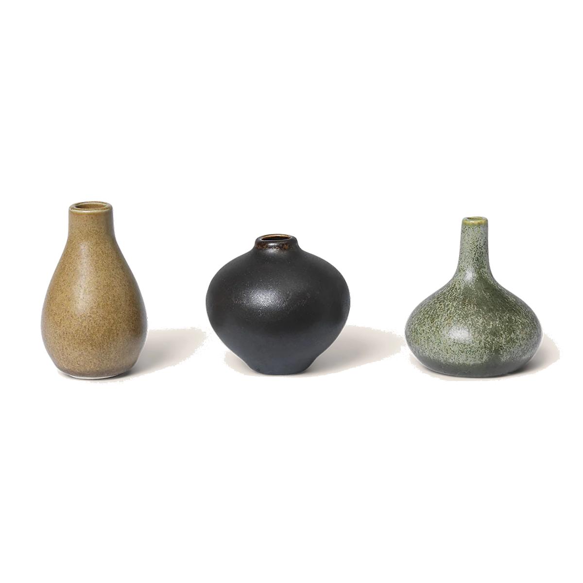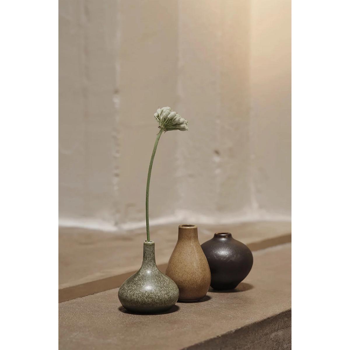 Create a decorative still life with the family of Komo Mini Vases. Extending the series, this trio of charming vases features subtly rounded, chubby forms that exude warmth and whimsy. Position them on your favourite bookshelf alongside other cherished objects, on the table with single-stem flowers or place a tray underneath to use them for incense sticks. * By Ferm Living * Set of three mini vases * Glazed stoneware * Spot clean with lukewarm water * Imported