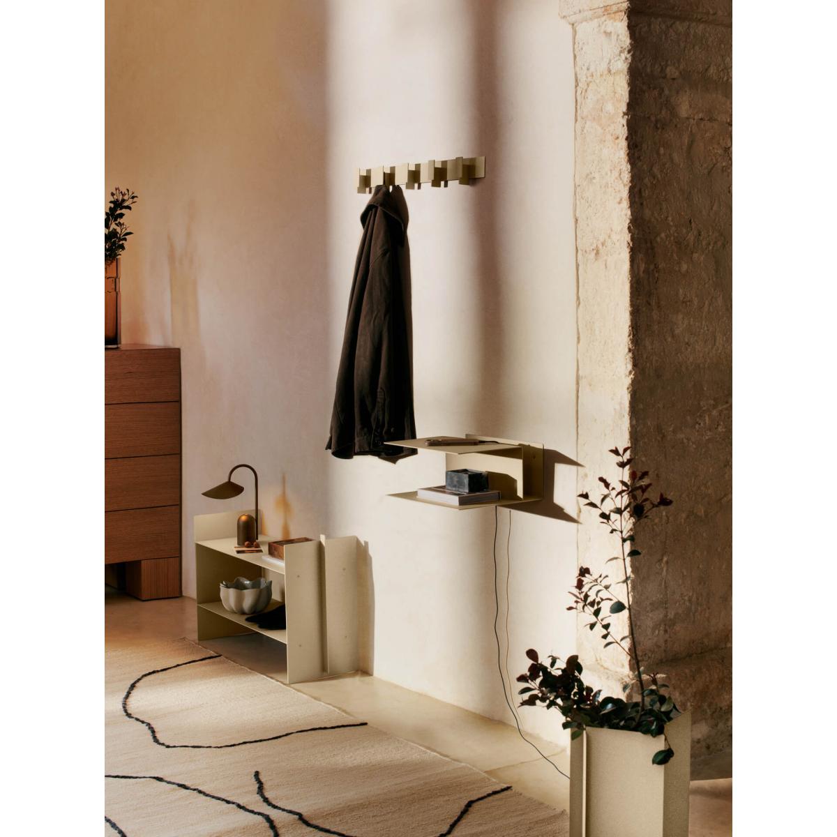 The Lager bedside table 15.5x35x30 cm from Ferm Living is a wall-mounted iron bedside table that combines functionality and aesthetics. Made of powder-coated iron sheet, it offers practical storage with shelves for books and small items, as well as a smart cable hideaway for electronics. A stylish solution to maximise space in the bedroom.