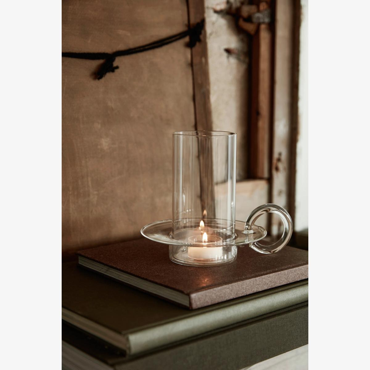 Crafted from heat-resistant glass, Luce's shape and round handle allude to antique candle holders. * By Ferm Living * Mouth-blown, heat-resistant glass * Wipe clean with damp cloth * Can fit tealight up to 6.4cm * The height of the glass cylinder will protect your candle from winds or drafts * Imported