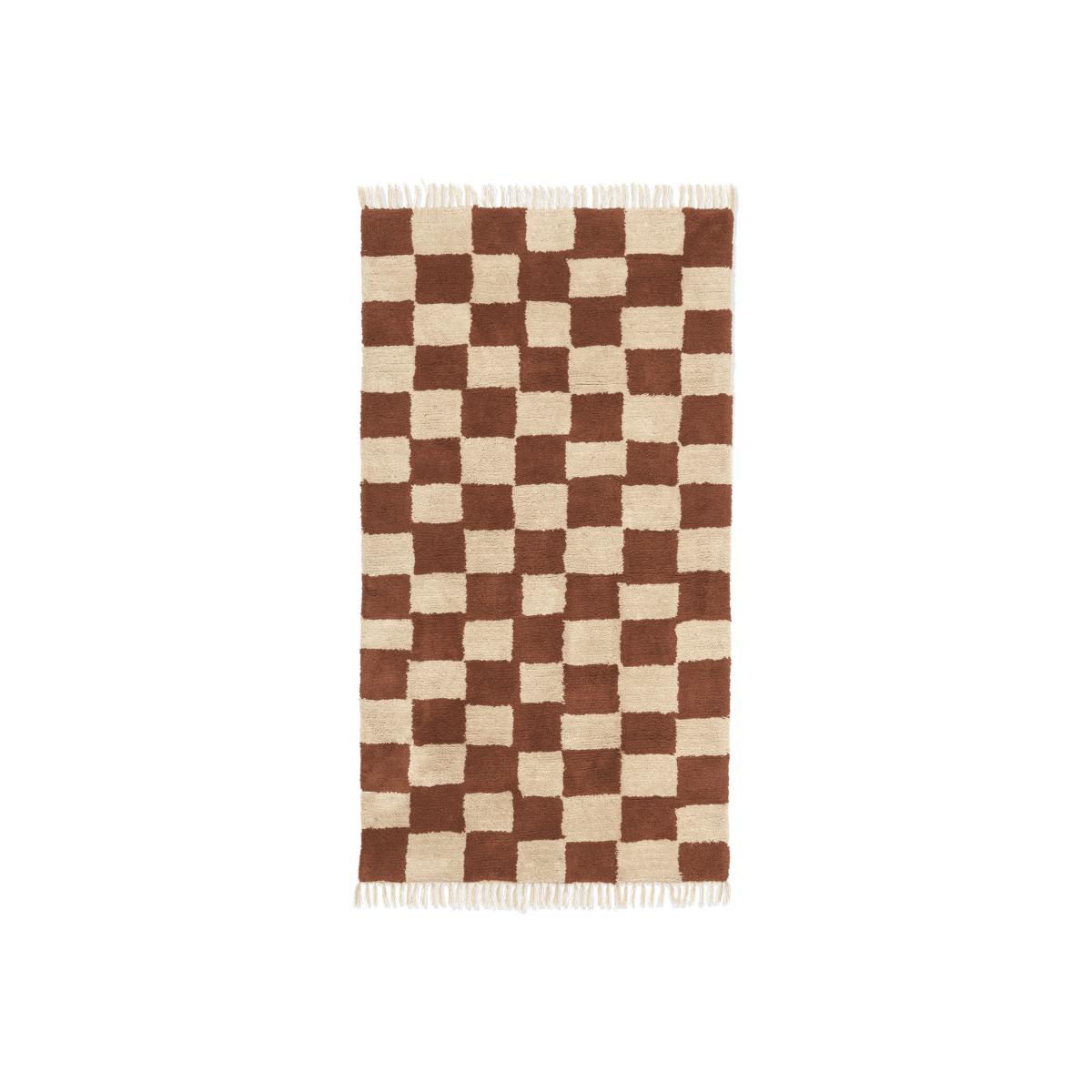 I love this piece because of its warm, earthy tones and playful checkered pattern, which make it versatile for various interiors. It works particularly well in Scandinavian or modern minimal spaces where it can add warmth and texture, as well as in eclectic settings that embrace bold patterns. Practical styling tips include layering it with other textiles in neutral tones to soften a room, or placing it under a coffee table or dining area to define the space. Its cotton material also makes it easy to maintain, making it suitable for high-traffic areas like living rooms or kitchens. Overall, it’s a smart, understated choice that brings both comfort and personality to your home.