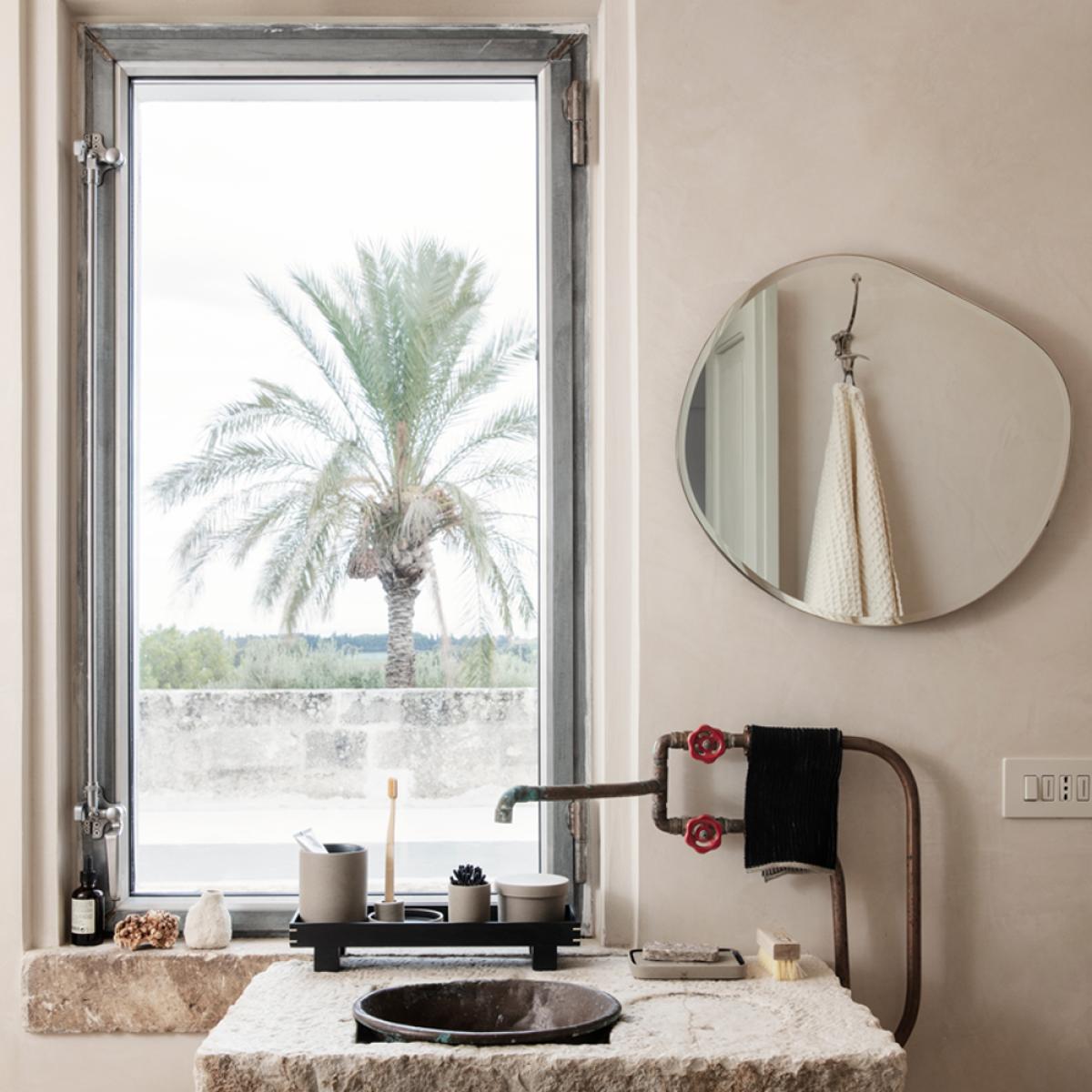 This pond mirror in dark chrome has a contemporary, organic shape that adds visual interest without overwhelming a space. I love how its reflective quality can brighten and enlarge a room, making it ideal for small bathrooms or snug corners. It pairs well with minimalist, Scandi, or industrial interiors, adding a sleek detail that’s both functional and stylish. To style, consider placing it above a vanity or console for everyday practicality, or use it as a statement piece on a feature wall. Pairing it with muted tones or textured surfaces can really let its unique shape and dark chrome finish stand out, while also creating a balanced, cohesive look.