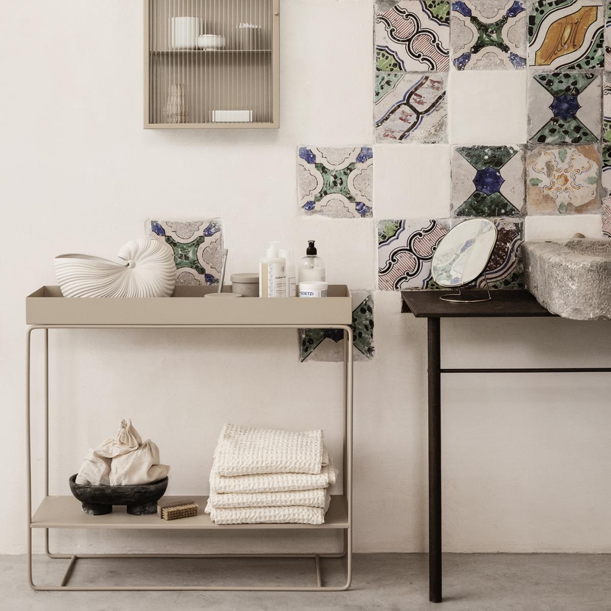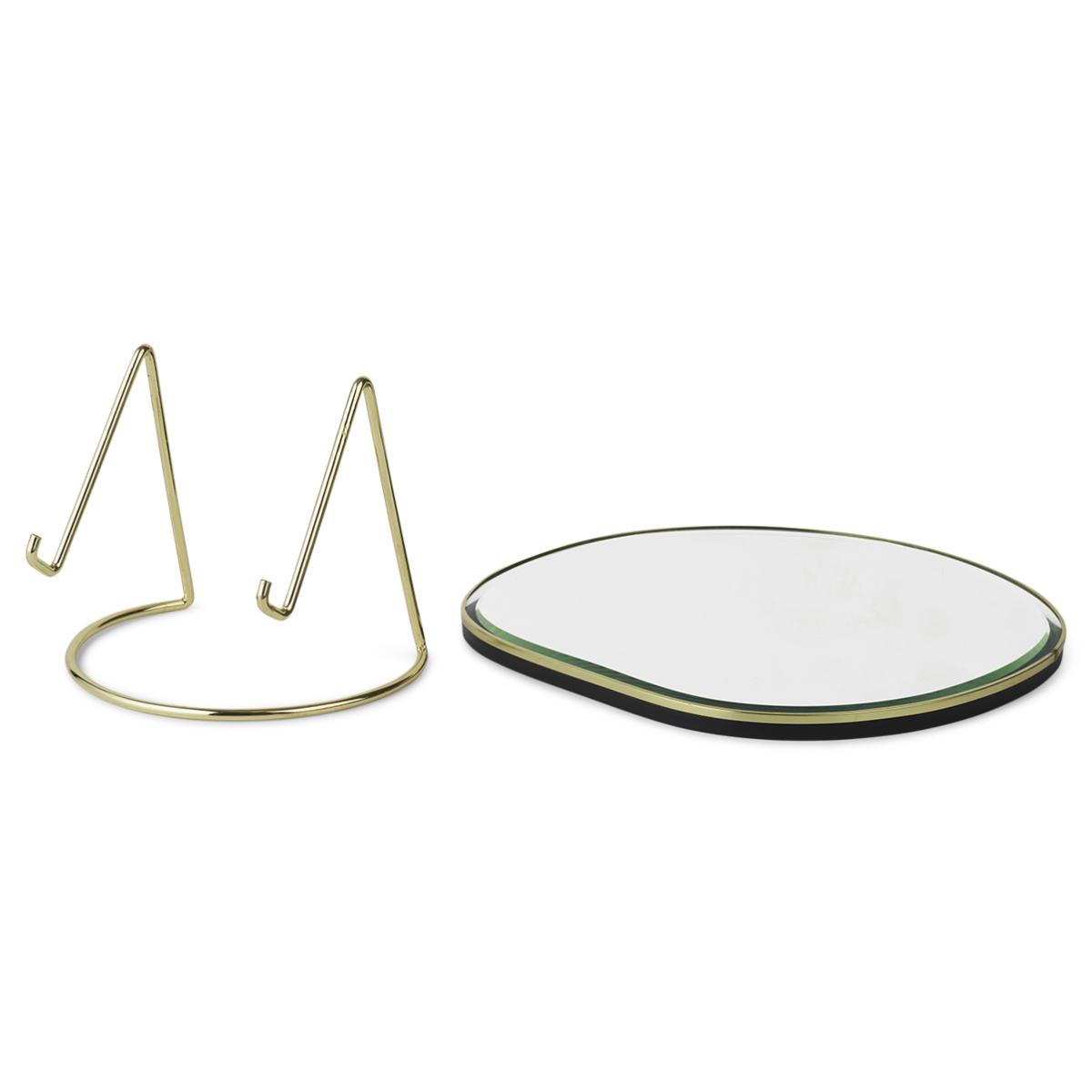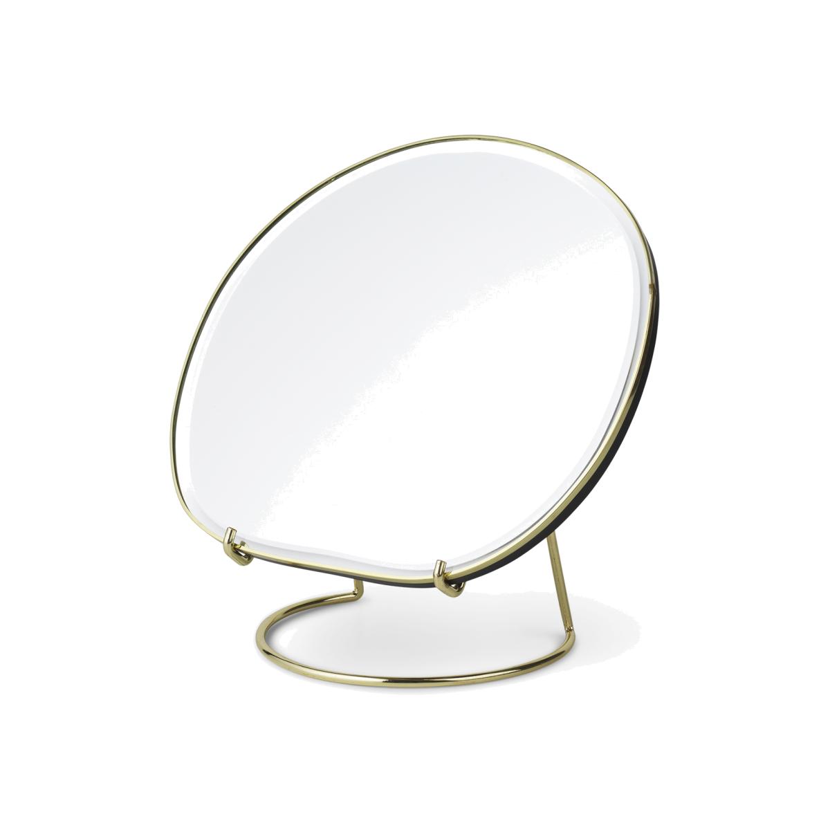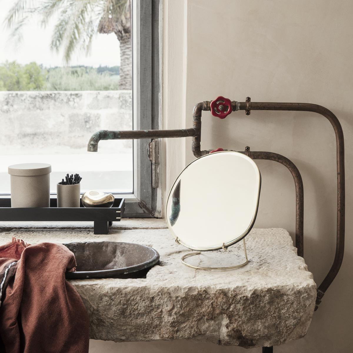 Table mirror Pond from Ferm Living is an elegant and practical tool for your daily routine. The table mirror is tilted on a stand and has been inspired by flowing water. The mirror has a round shape with a flat line along the underside and is suitable in the bathroom or in the hall.