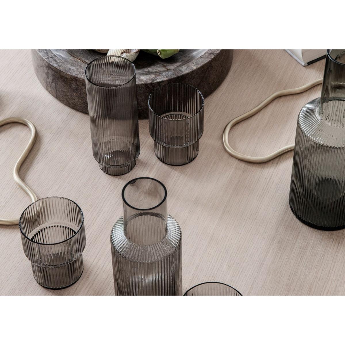 Individually shaped and mouth-blown into the mould, the Ripple Glassware set in Smoke Grey features beautifully textured surfaces and smooth lines. The vertical ripples add a strong and sophisticated look and the varied geometric shapes give a dynamic touch to any dining scenario. Some pieces in the set include a stackable design feature, adding contemporary style and functionality through depth.