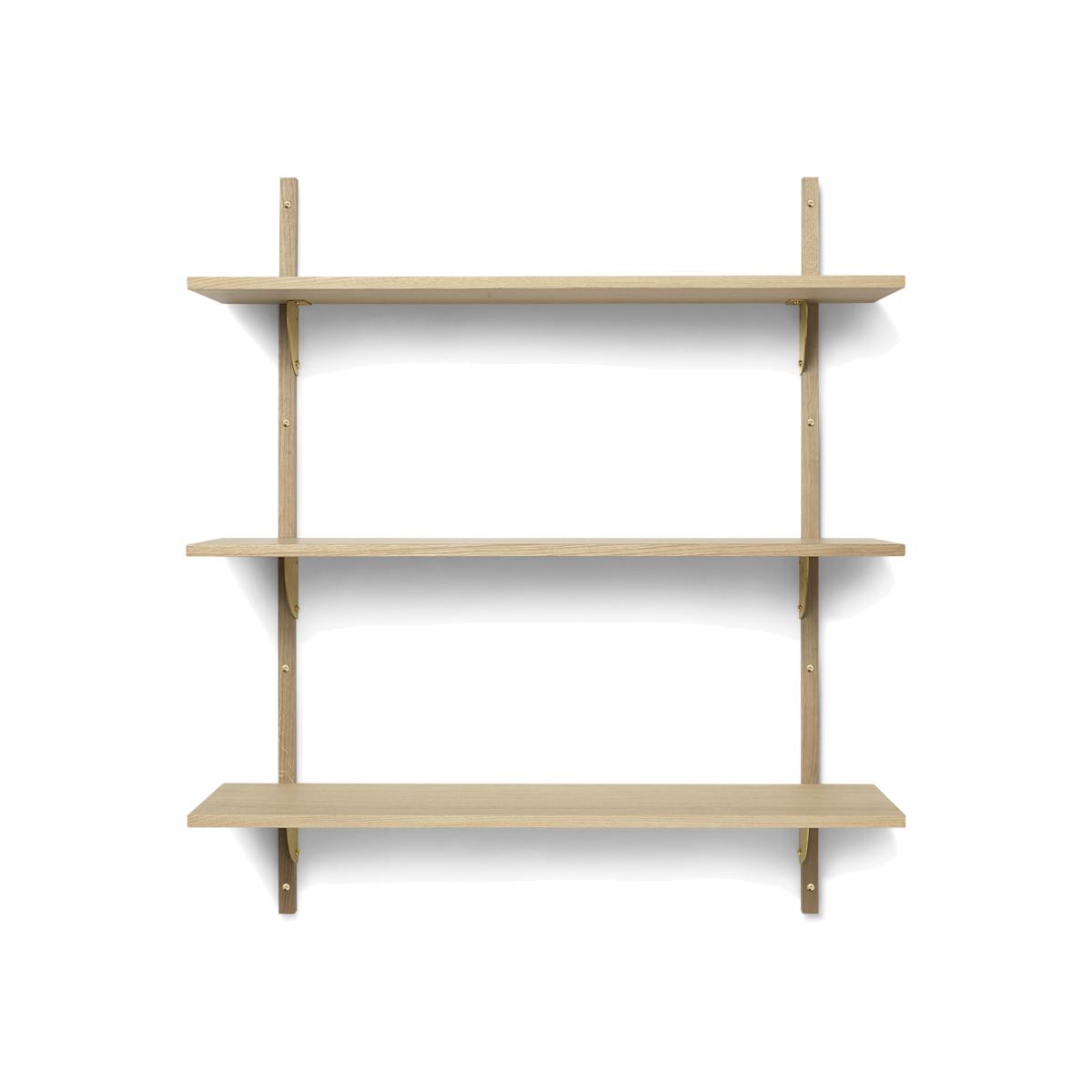 The Sector shelf L/L from Ferm Living is made of wood with details in colored or polished brass. This wide and tall shelf has three shelves and fits in several rooms of the home. Use it for porcelain in the kitchen or to display your favorite items in the living room. Choose between different color combinations.