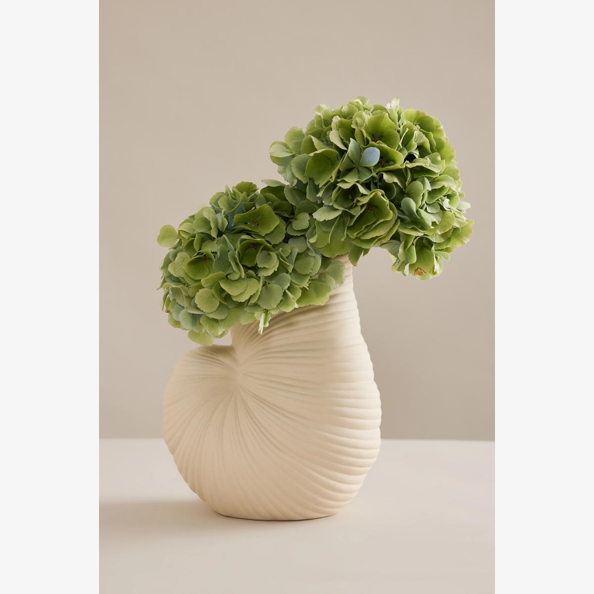 The Ferm Living shell vase has a sleek, sculptural shape that makes it a versatile statement piece. I love how its organic, rounded form can complement both minimalist and more eclectic interiors, adding a contemporary touch without feeling overly fussy. It works especially well in neutral colour schemes or paired with textured, natural materials. For styling, consider using it with fresh or faux greenery, like the hydrangeas shown, to bring in a pop of colour and life. Practical tip: use it as a standalone decorative piece on your sideboard or coffee table, or incorporate it into a centrepiece with seasonal flowers for a more layered look. Its sculptural silhouette lends itself to both modern and rustic settings, making it a flexible addition to various interior styles.