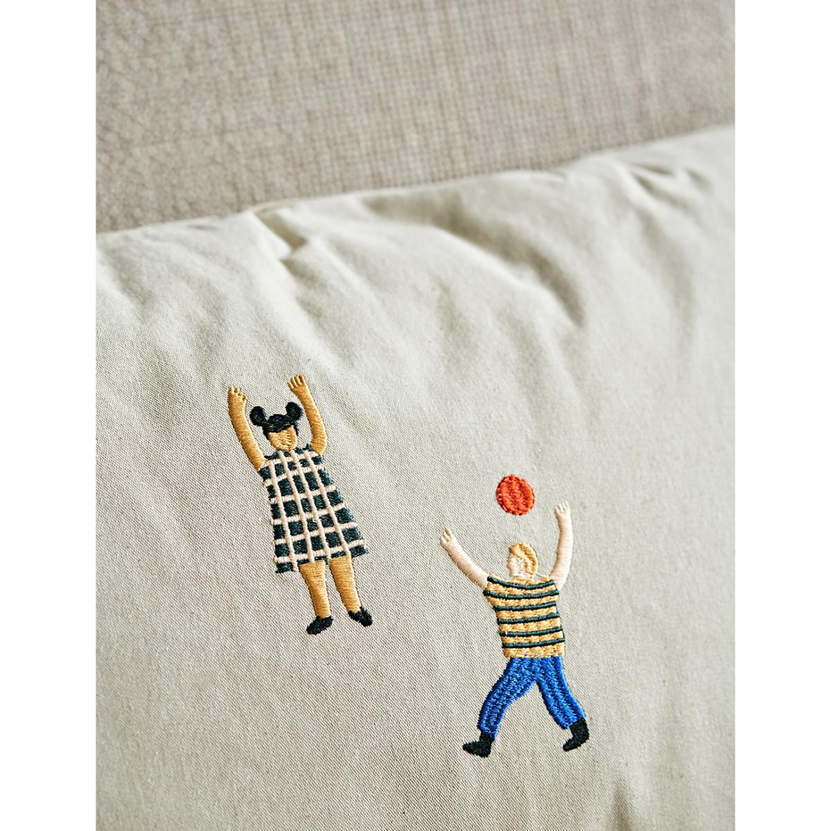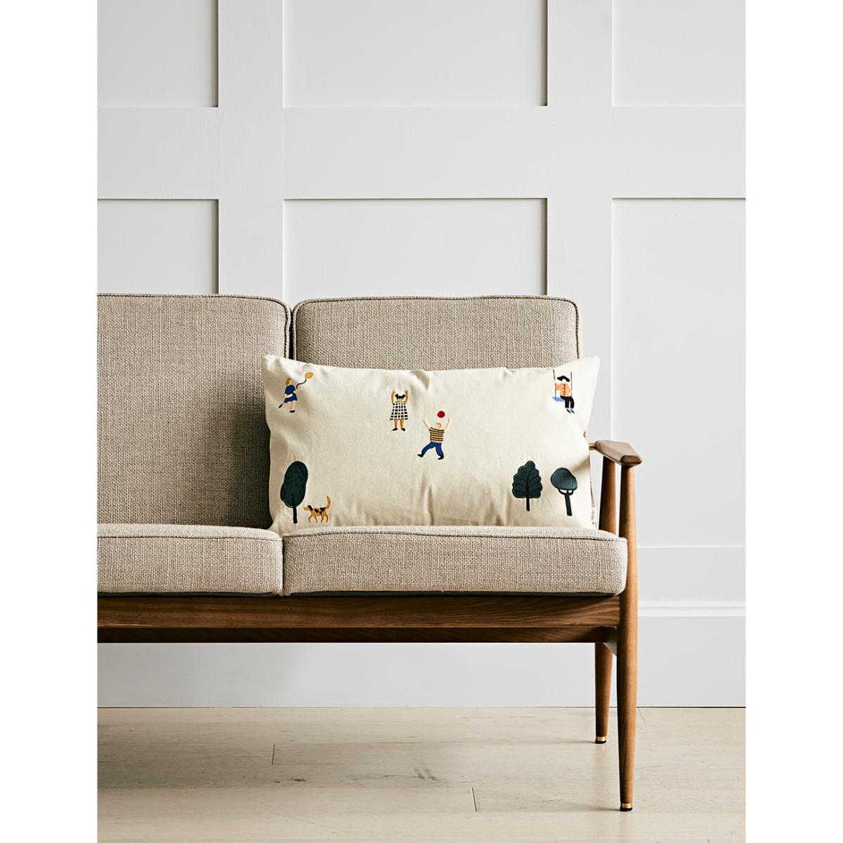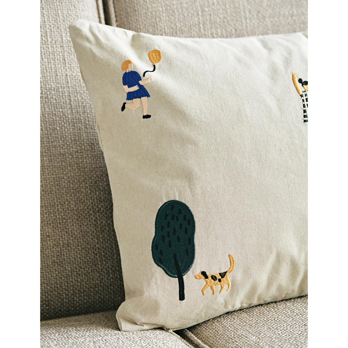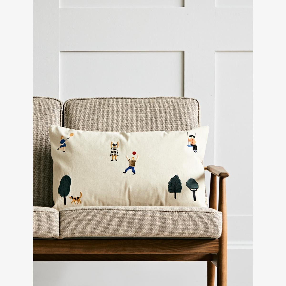 We love this beautifully designed embroidered cushion for a child's playroom or adding a fun touch to your sofa. The cushion features embroidered images of children in a park. A caramel coloured cushion is also available. Mix and match with our other cushions.