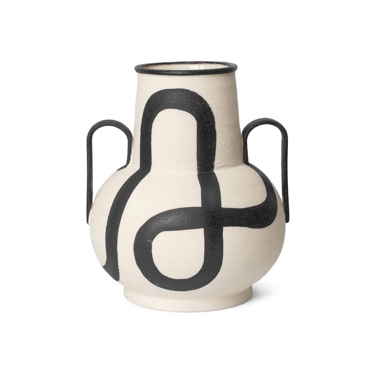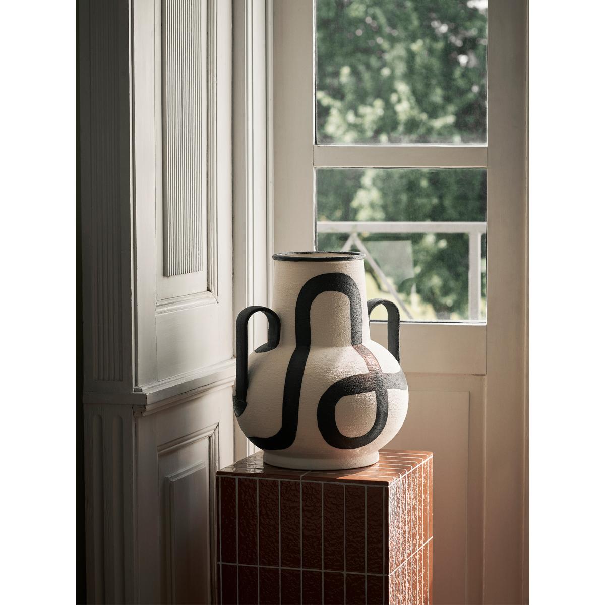 I love this vase for its modern, sculptural aesthetic and versatility. Its off-white tone and bold black line work make it a statement piece that works well in contemporary, Scandinavian, or minimal interiors. It’s particularly effective when styled with simple, understated flowers or greenery to highlight its graphic design. Practical tips include using it as a standalone accent or pairing it with other monochrome or natural textures for a cohesive look. Its substantial shape also makes it ideal for placing on sideboards, shelves, or as a centrepiece on dining or coffee tables, adding visual interest without overwhelming the space.
