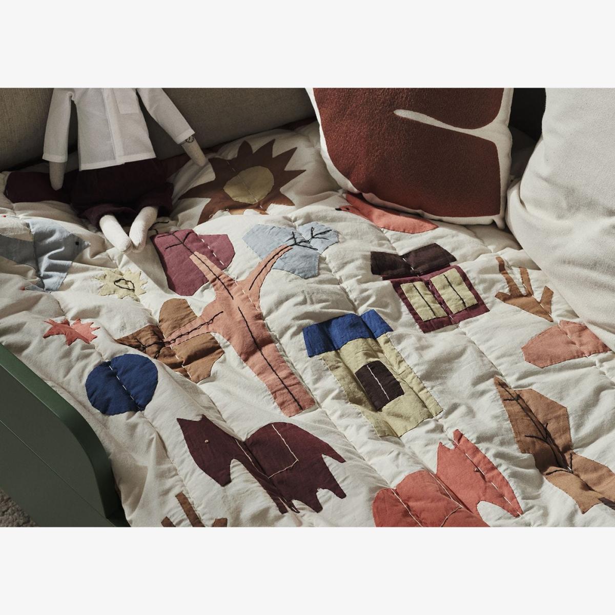 The Village Quilted Blanket features handmade appliqué that portrays an array of delightful characters, charming houses and quirky wildlife. Each element has been hand appliquéd onto the blanket, which consists of an organic cotton cover and recycled polyester filling.