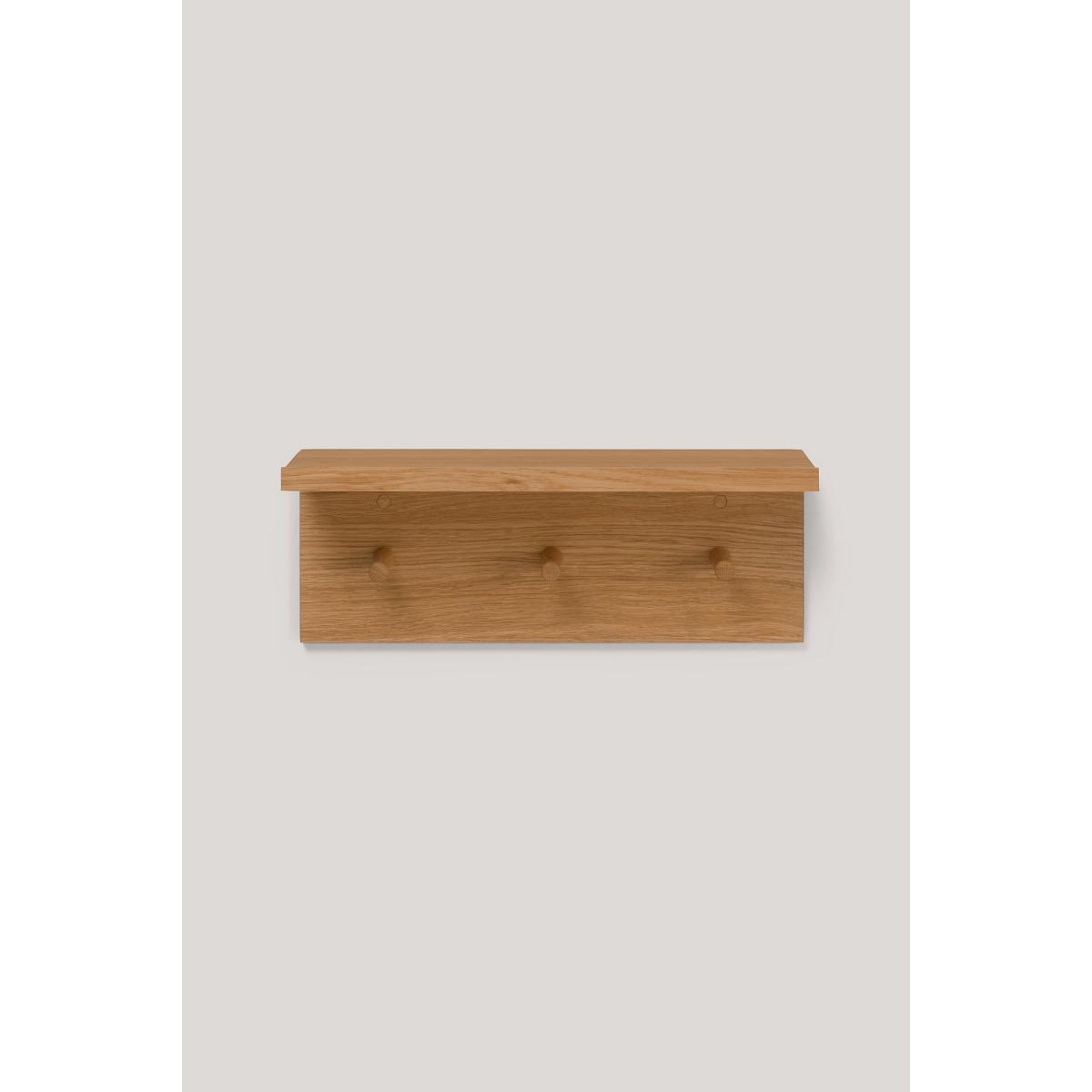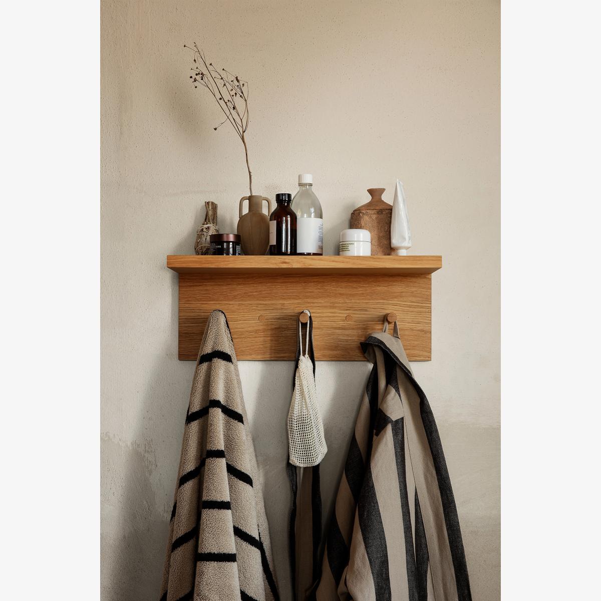 Easy to mount, the Place Rack is an easy storage solution for accessories in the hallway, tea towels in the kitchen, or even little knick-knacks in your little one's room. * By Ferm Living * Shelf: Oiled oak veneer with MDF core * Hooks: Oiled solid oak * Removable wooden caps for easy mounting onto the wall * Wipe clean with damp cloth * Imported
