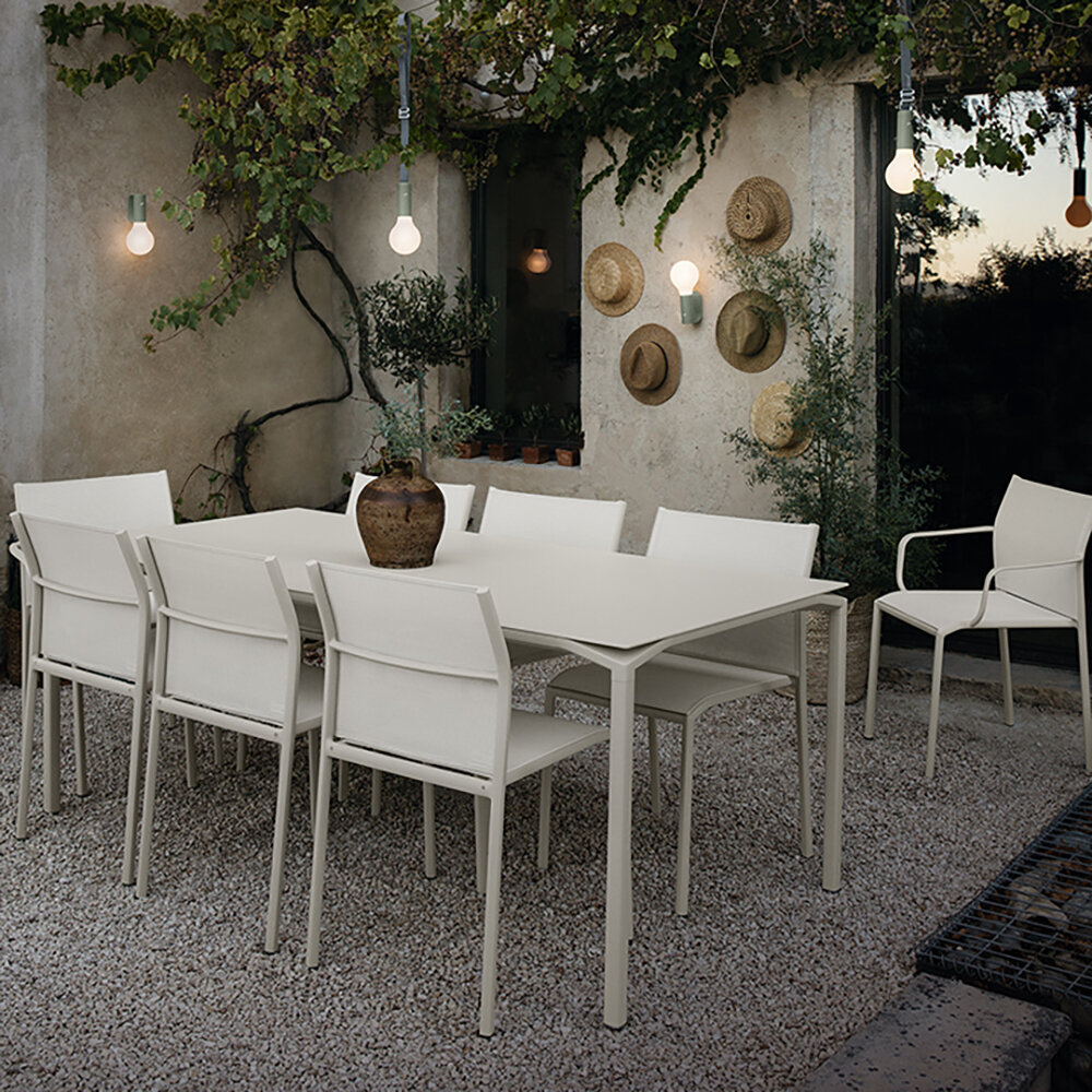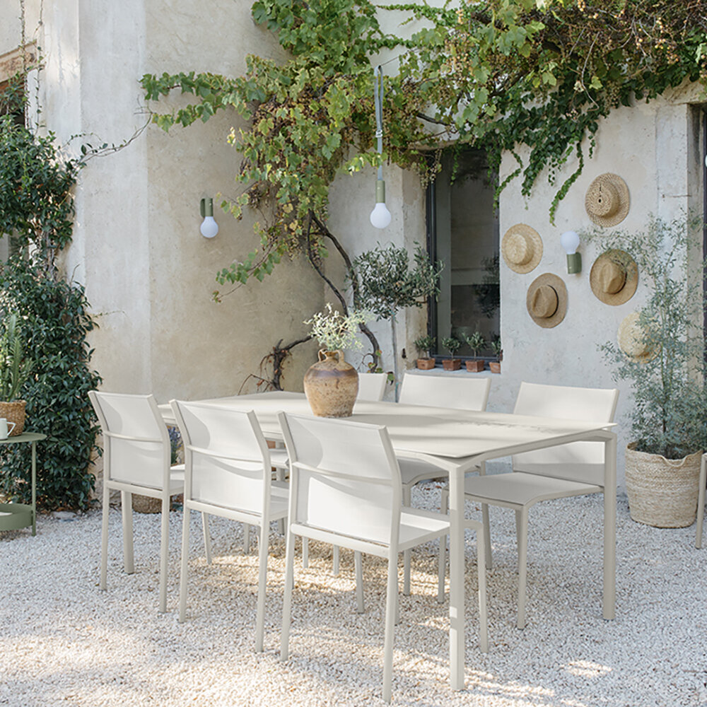 Enjoy al fresco dining in style with this Calvi garden dining table from Fermob. Crafted from aluminium, the tabletop appears to float above the base. Available in three charming colours, this large table comfortably seats up to ten people, with two sat at each end. Suitable for using both indoors and outdoors, a leg riser is included to allow rain to run off the top. Key features: * Material: aluminium * Dimensions: H74xL195xW95cm * Warm grey colour * UV resistant * Comfortably seats up to 10 people * Tabletop appears to float * Includes a leg riser to allow rain to run off * Suitable for indoor and outdoor use