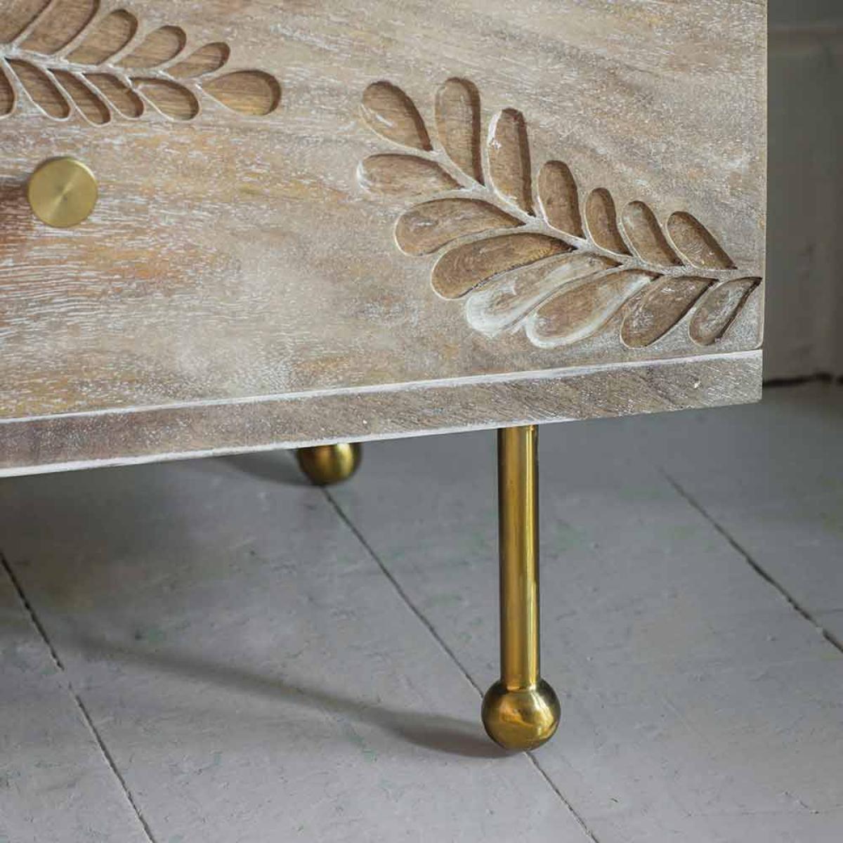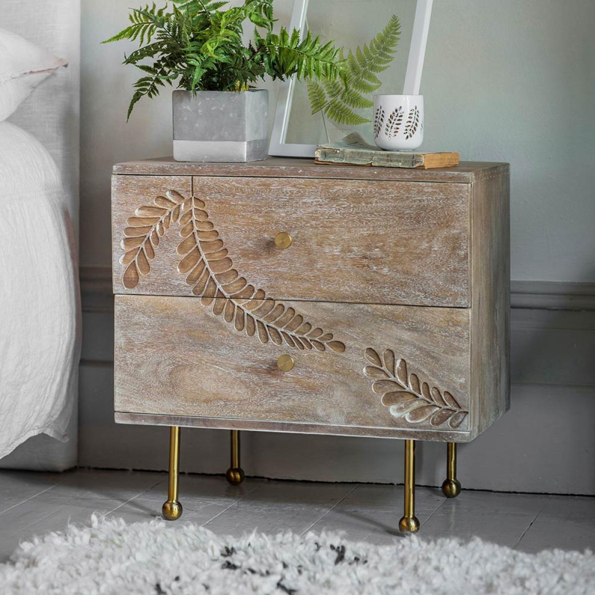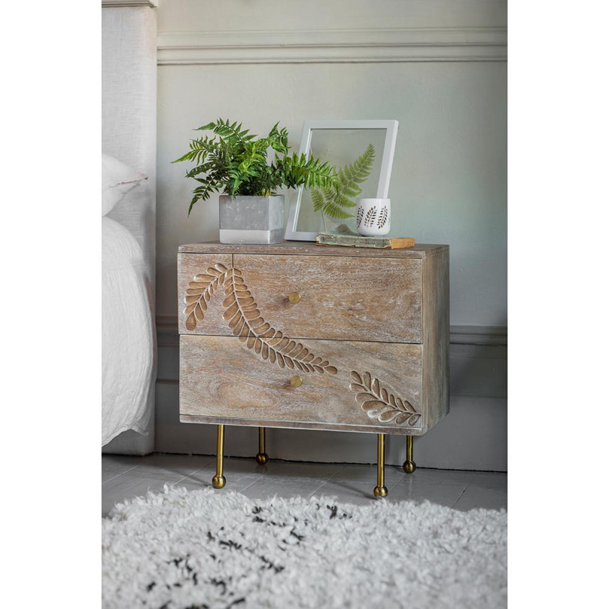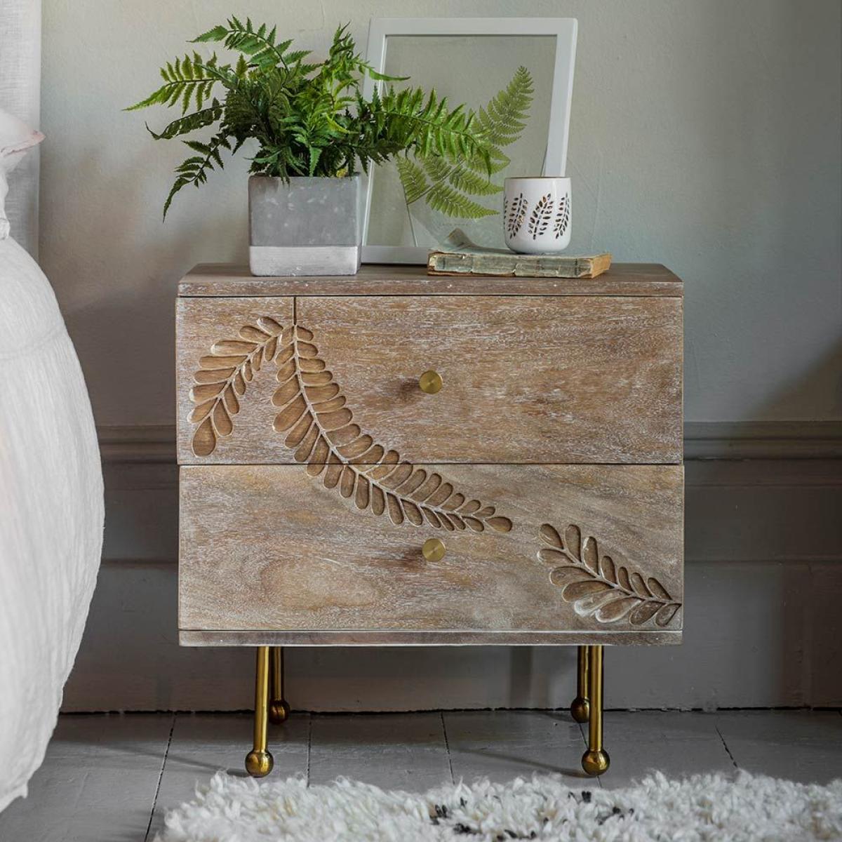 With an elegant hand carved fern design, our mango wood Fern Bedside Drawers have a light whitewash finish and matt brass-finish legs and handles. Distinctive yet understated, it’s a great option for bedrooms and guest rooms and will enhance all styles of décor and colour schemes.