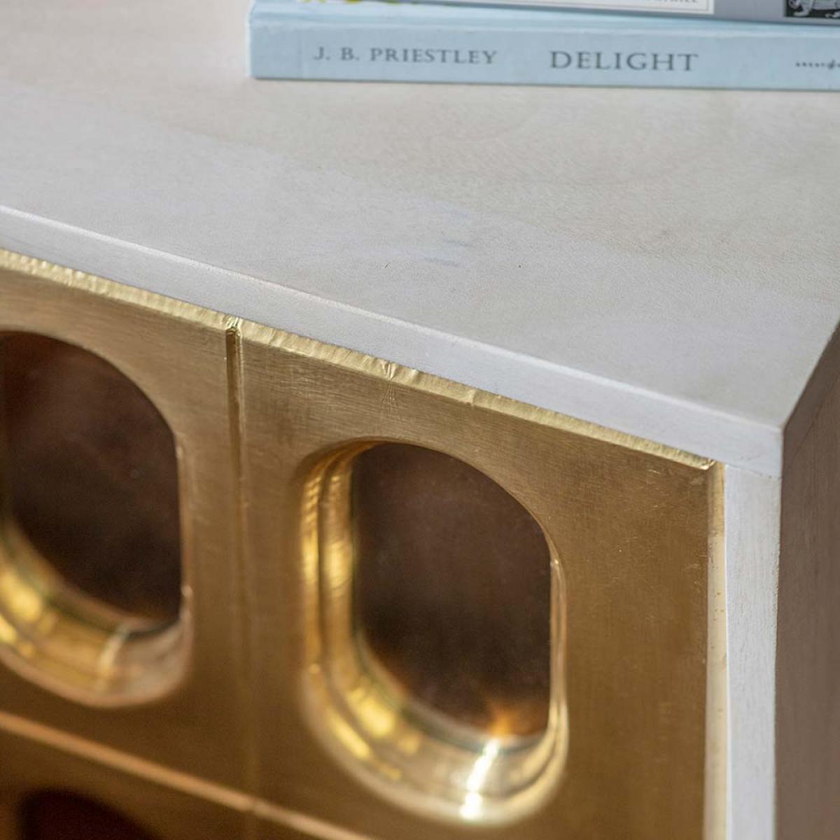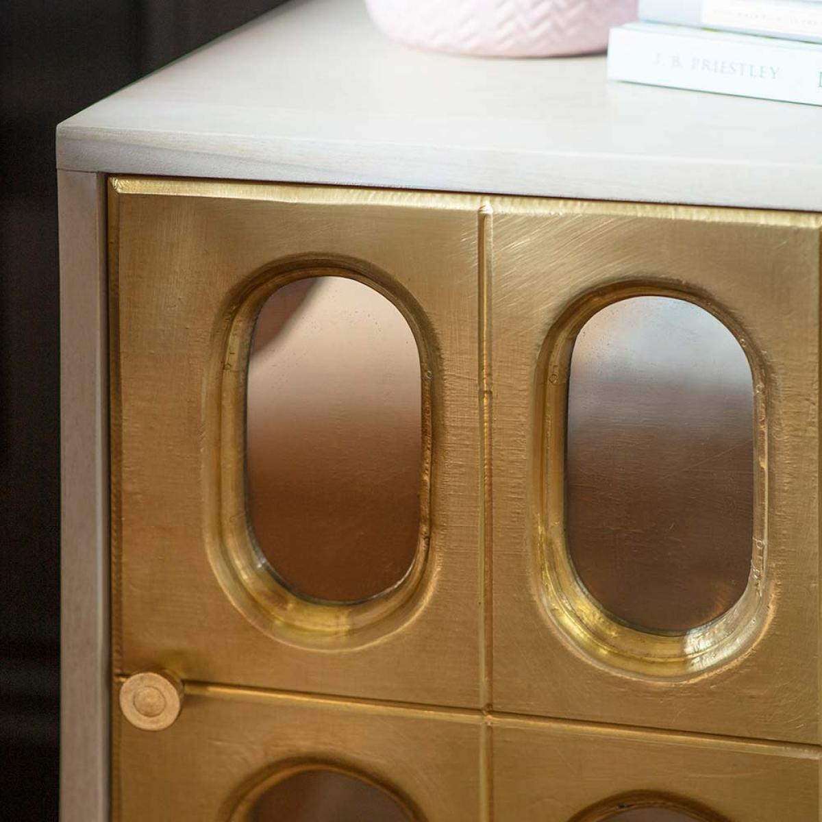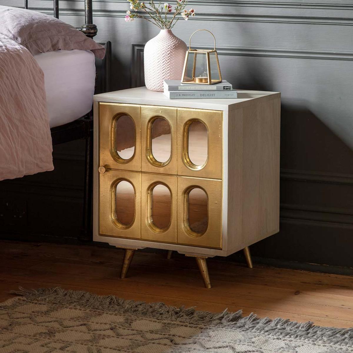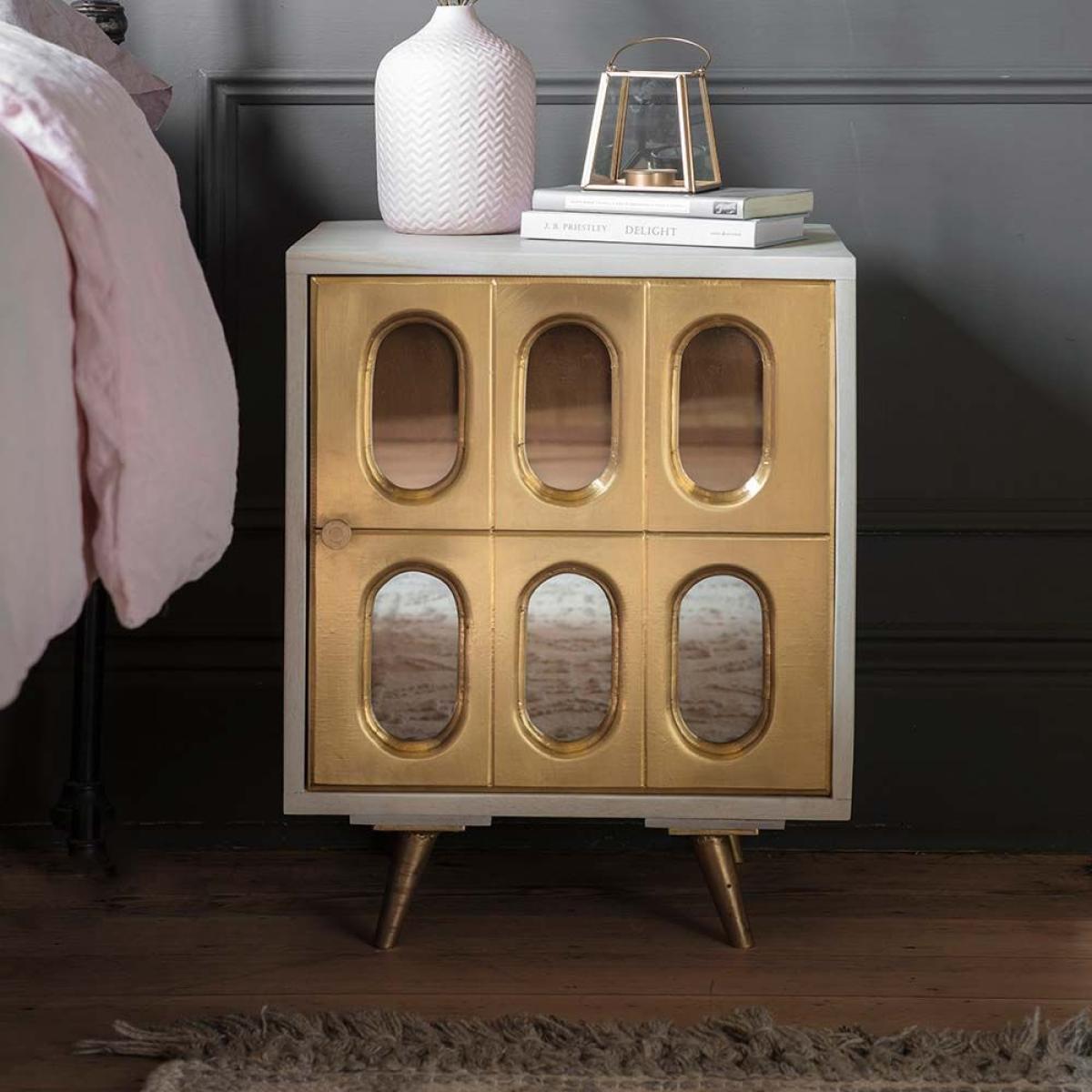 Our Fernando Bedside Cabinet is finihed in whitewashed mango wood with brass cladded, mirrored doors and brass plated legs and handles, these cute, compact units have a middle shelf with plenty of space inside the cupboards for books and night-time essentials. Ideal for guest rooms too, they suit all interior design schemes.