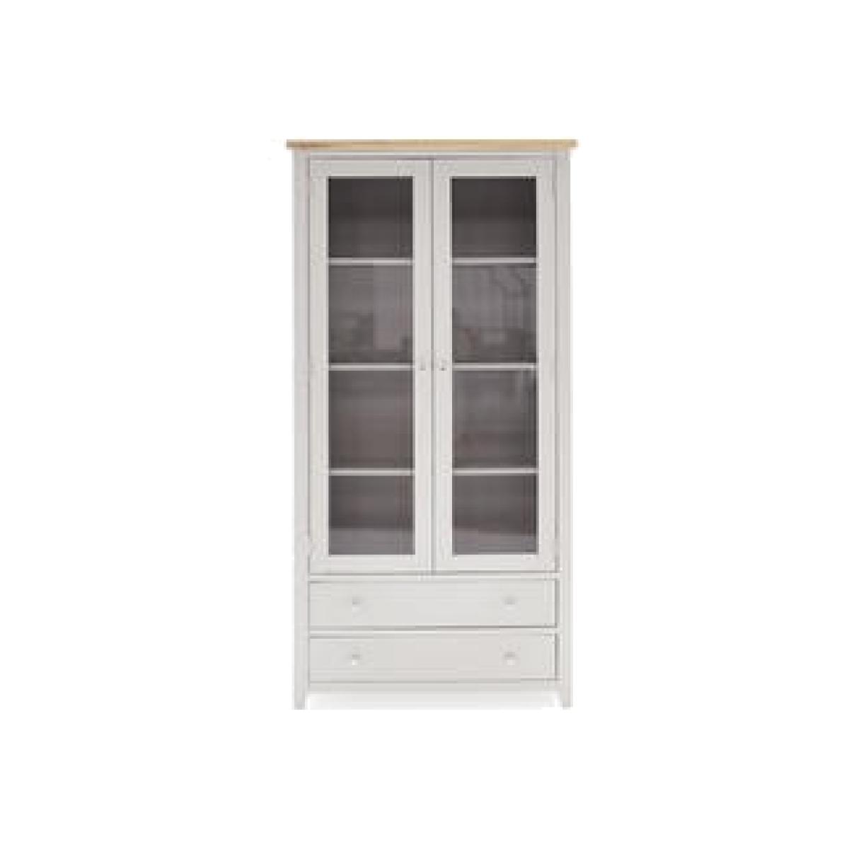 I love this display cabinet for its versatile two-tone design and practical layout. Its combination of grey and solid oak makes it adaptable to various interior styles, from contemporary coastal to rustic country. It works particularly well in classic or shabby chic settings, where the contrast adds visual interest, but it can also bring a touch of softness to modern spaces. When styling, consider using the glass front to showcase cherished ceramics, glassware, or decorative objects, keeping clutter minimal for a clean look. For added personality, you could layer items with different heights and textures inside, and use the drawers at the bottom for hidden storage to keep the display tidy. This piece is a smart choice for anyone wanting to combine function with a subtle touch of character.