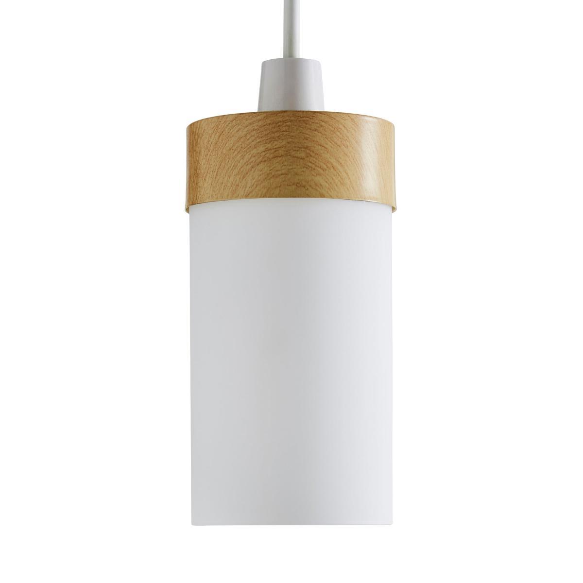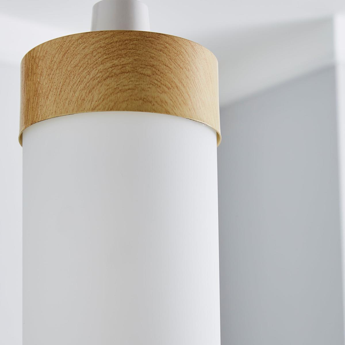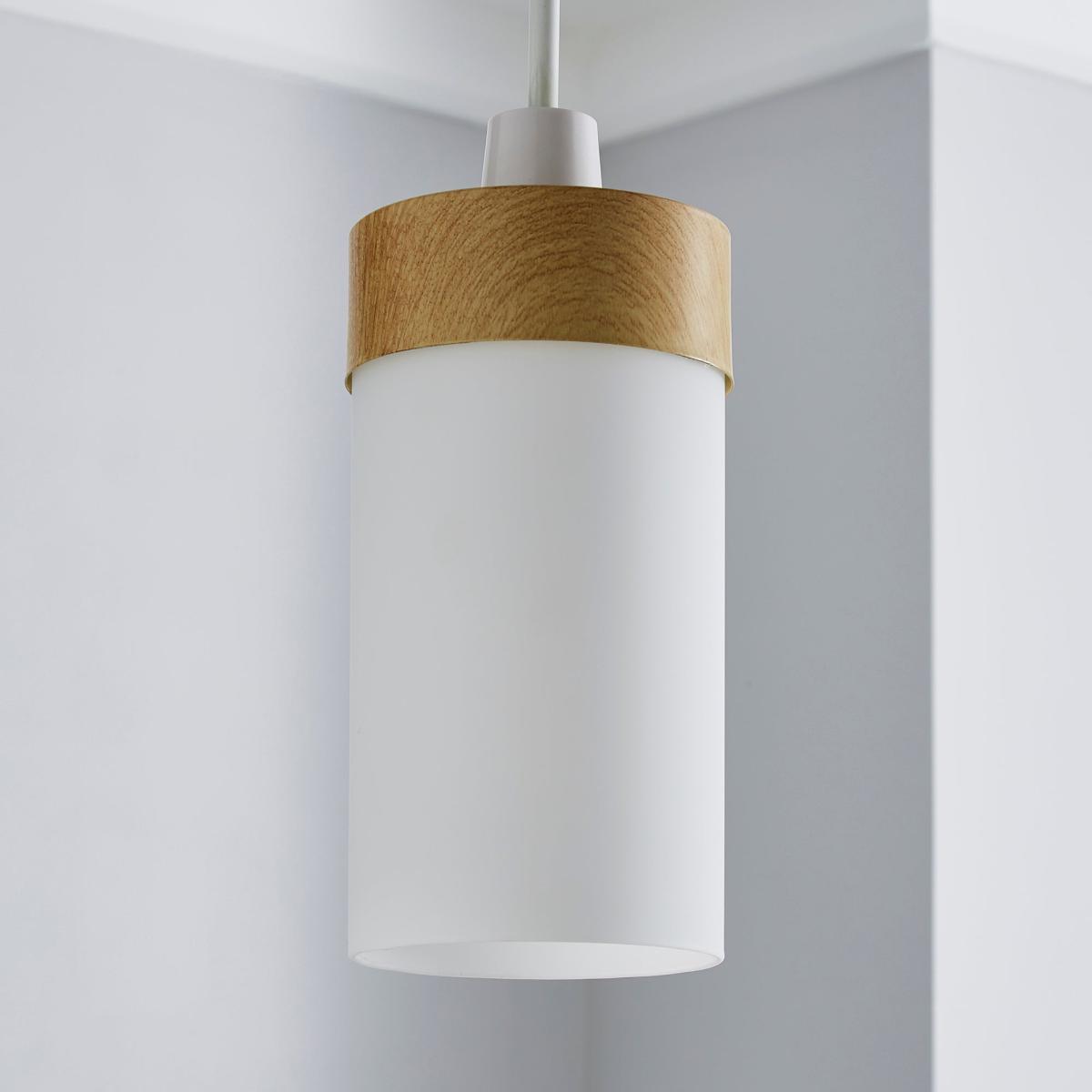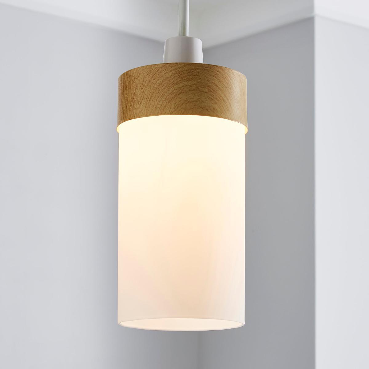 Simple yet stylish, the Ferris pendant fitting offers a unique modern design. This light shade features an opaque, cylindrical glass shade, complete with a wood-effect finished metal top.