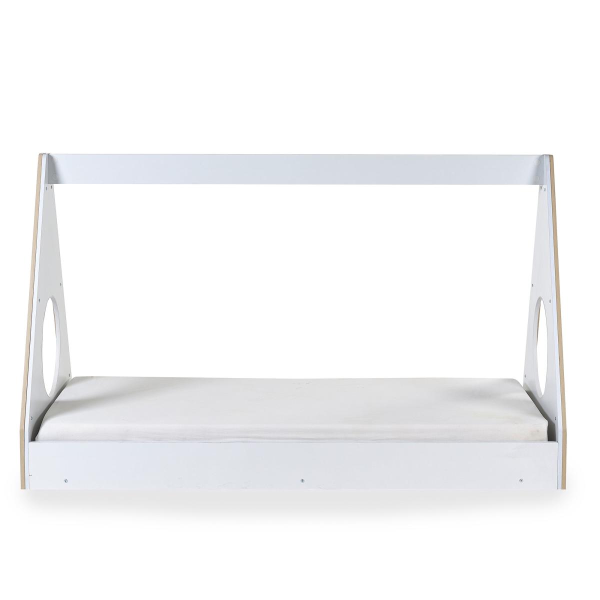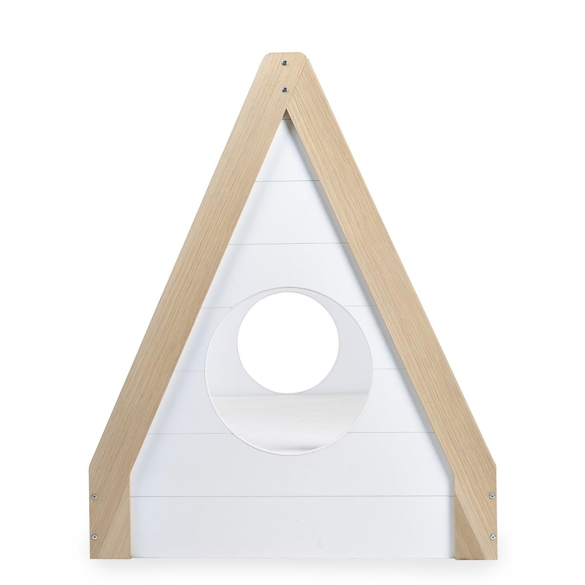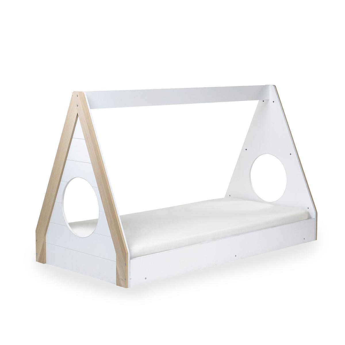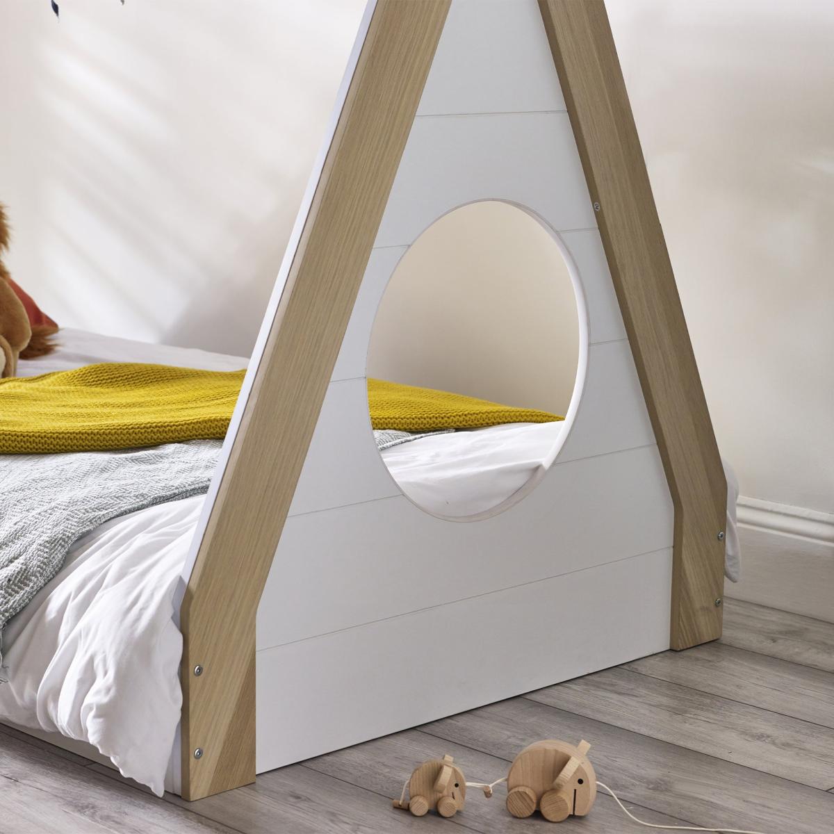 * Wooden frame* Teepee style With its charming white and woodgrain finish, this teepee-style bed offers a cosy and imaginative environment perfect for play and rest. The unique circle detail adds a playful touch, sparking curiosity and inviting your child to explore their own adventures. Designed with safety in mind, the low sleeper style ensures easy access for little ones, making bedtime an effortless and enjoyable experience.