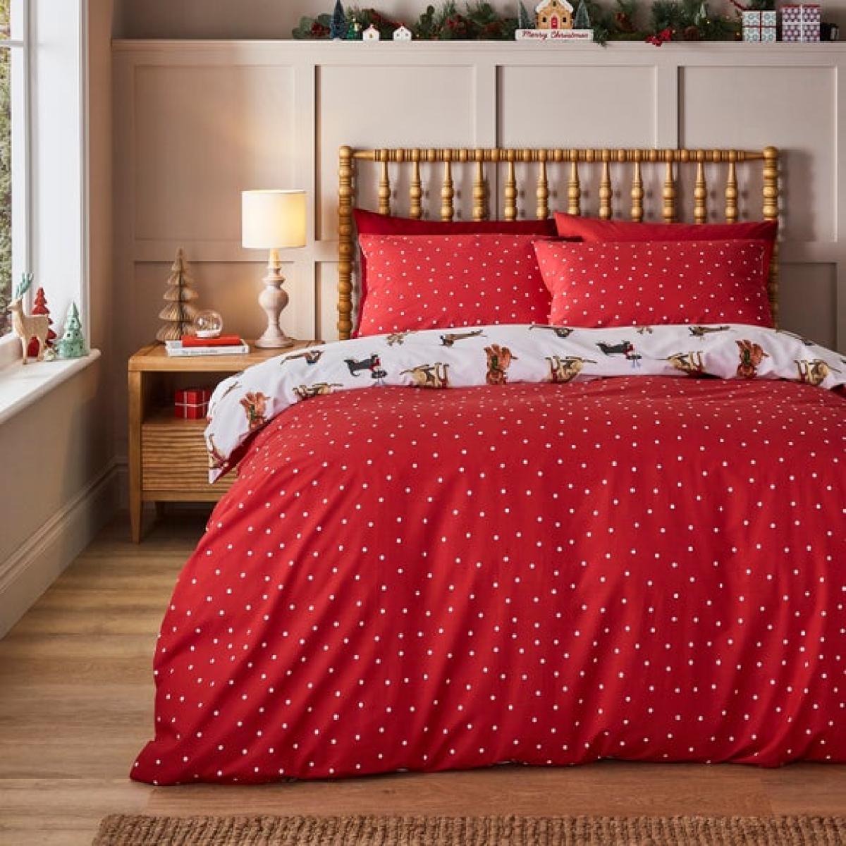 * Crafted from durable polycotton * Adorable doggie design * Button closure * Reversible * Machine washable Make bedtime a little more tail-waggingly joyful with this charming festive dog design, perfect for adding a playful twist to your seasonal decor. Beautifully printed on one side but the fun doesn't stop there, it's reversible too. It's other side is adorned with a lovely rich red on the back for when you fancy switching things up. Crafted from an easy care polycotton blend, it's as fuss free as it is fun, so you can spend less time washing and more time relaxing. Soft, cosy and full of character, it's ideal for those barking mad about their favourite furry friend and Christmas enthusiasts alike. Whether it's for your own room or a guest space, is guaranteed to bring a bit of Christmas cheer long throughout the season. A paws-itively brilliant way to celebrate the season.