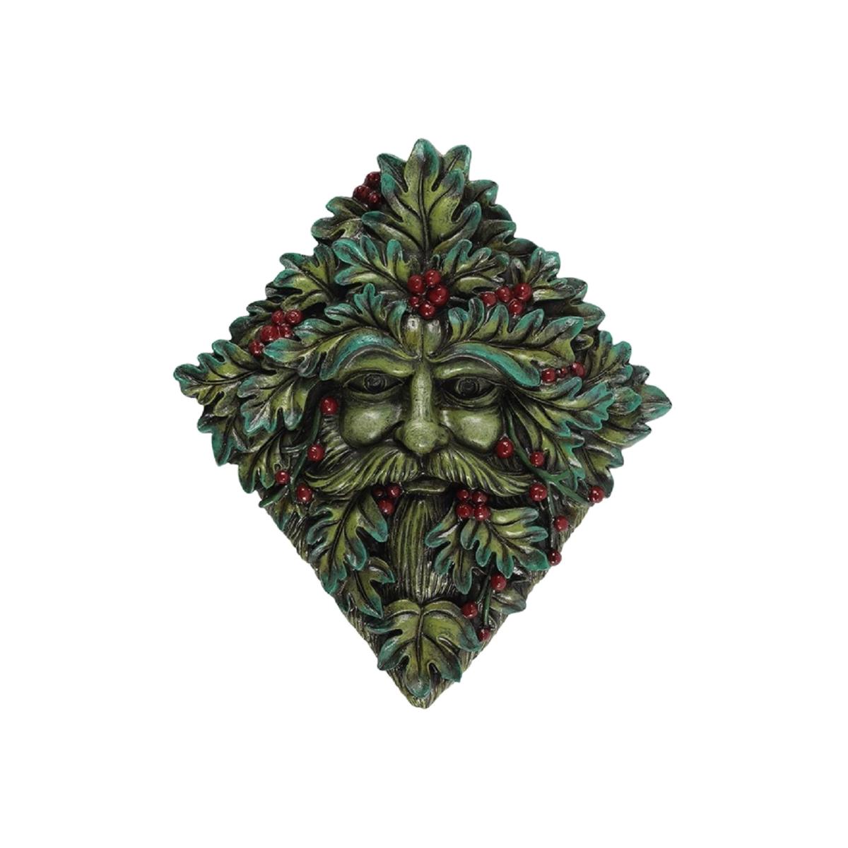A colourful Green Man wall plaque with festive wintery green tones and red berries. The reverse of the plaque has a metal hook ready for hanging.