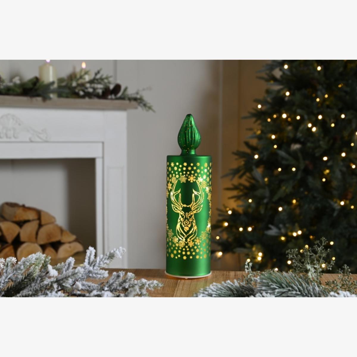 Add a charming and festive glow to your home with the Festive Lit Glass Reindeer Candle. Standing 25cm tall, this delightful battery-operated decoration features 15 static warm white LED lights, perfect for creating a cosy and seasonal ambience. Key Features: Height: 25cm green glass reindeer candle 15 static warm white LED lights for a gentle, inviting glow Battery operated: Requires 3 × AAA batteries (not included) Ideal for indoor use, perfect for mantelpieces, tables, or window displays Why You’ll Love It: This lit glass reindeer candle combines festive charm with elegant lighting, making it a beautiful addition to your Christmas décor. Its compact size and warm illumination bring seasonal cheer to any room.