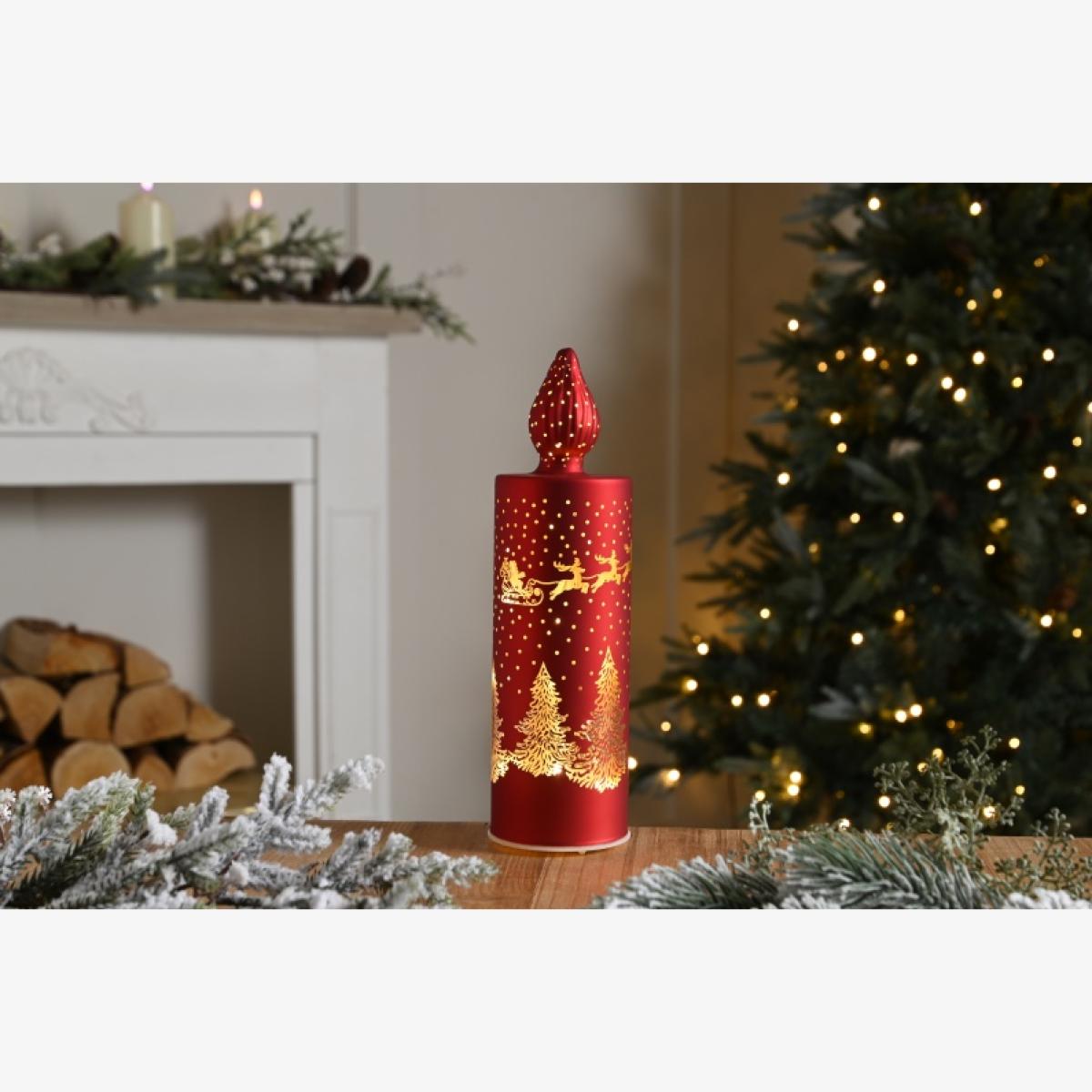 Bring festive cheer to your home with the Festive Lit Glass Santa Sleigh Candle. Measuring 25cm, this charming battery-operated decoration features 15 static warm white LED lights, adding a cosy and magical glow to your seasonal décor. Key Features: Height: 25cm red glass Santa sleigh candle 15 static warm white LED lights for a warm, inviting glow Battery operated: Requires 3 × AAA batteries (not included) Perfect for indoor use, ideal for tabletops, mantels, or window displays Why You’ll Love It: This lit glass Santa sleigh candle combines festive charm with elegant illumination. Its compact size and soft warm light make it a delightful addition to any Christmas décor, bringing joy and seasonal spirit to your home.
