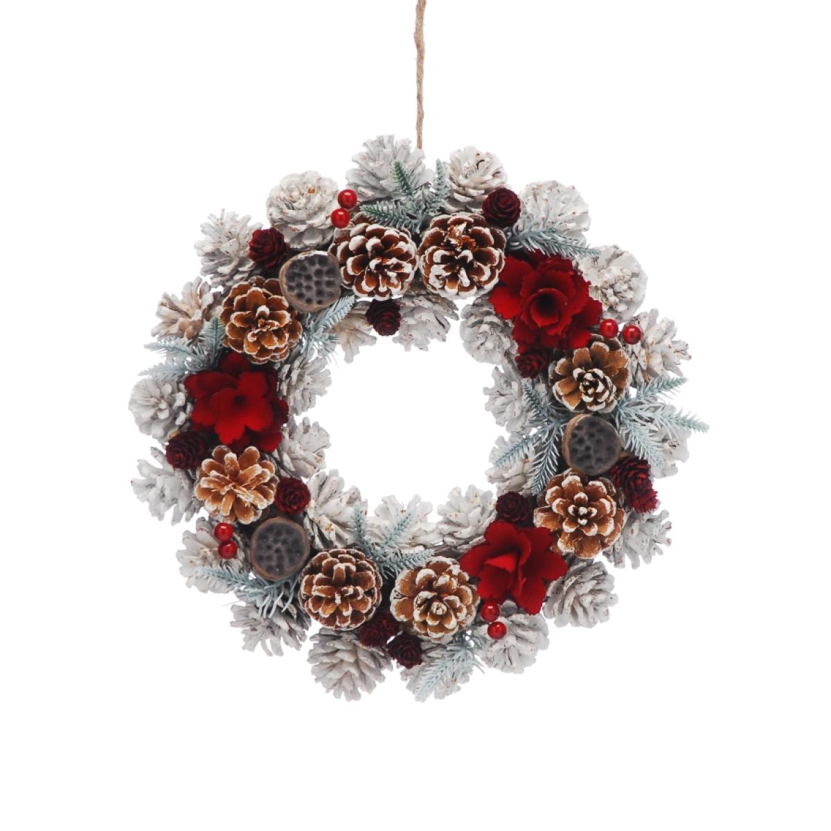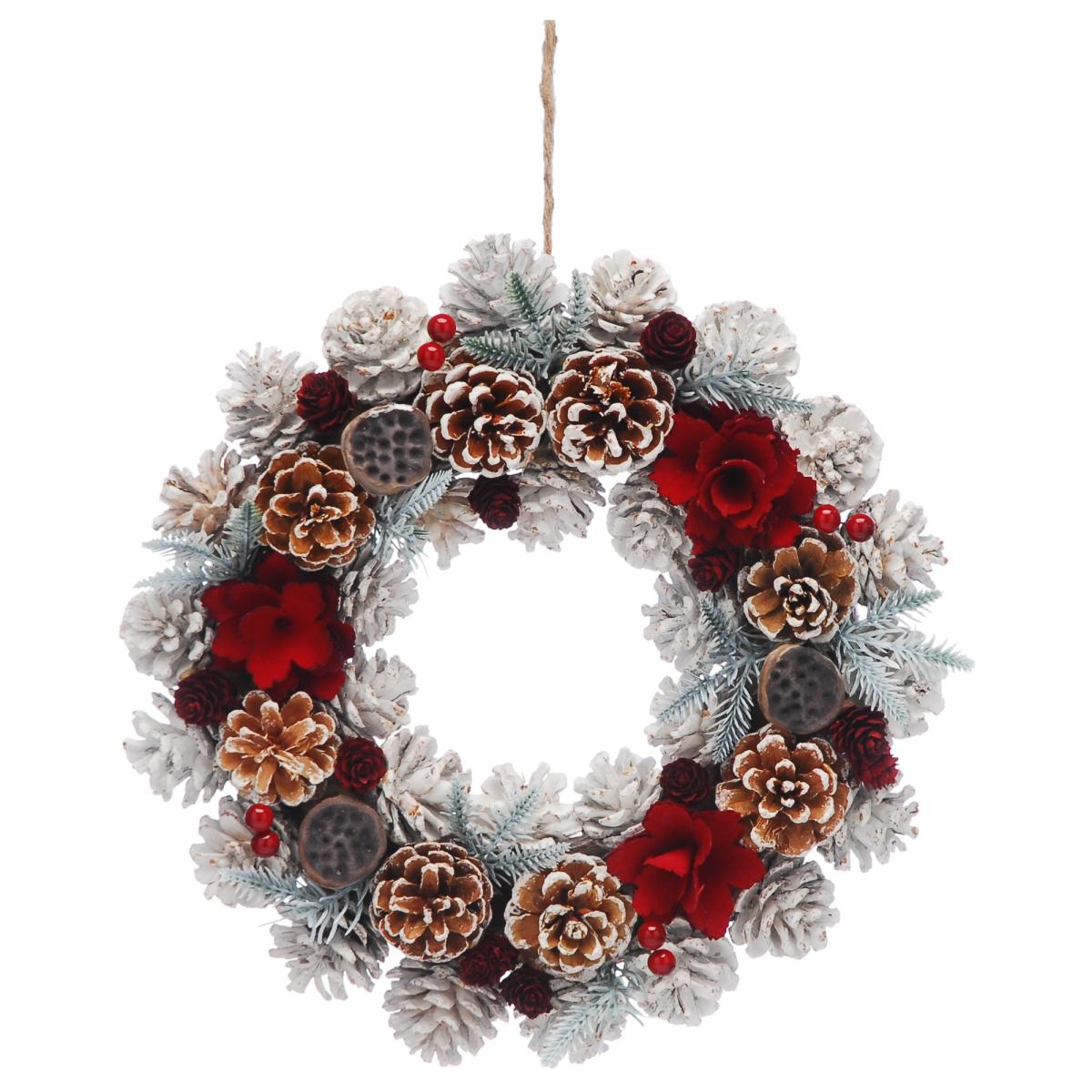 Festive Red Flower and White Pinecone Wreath - 36cm In Red/White