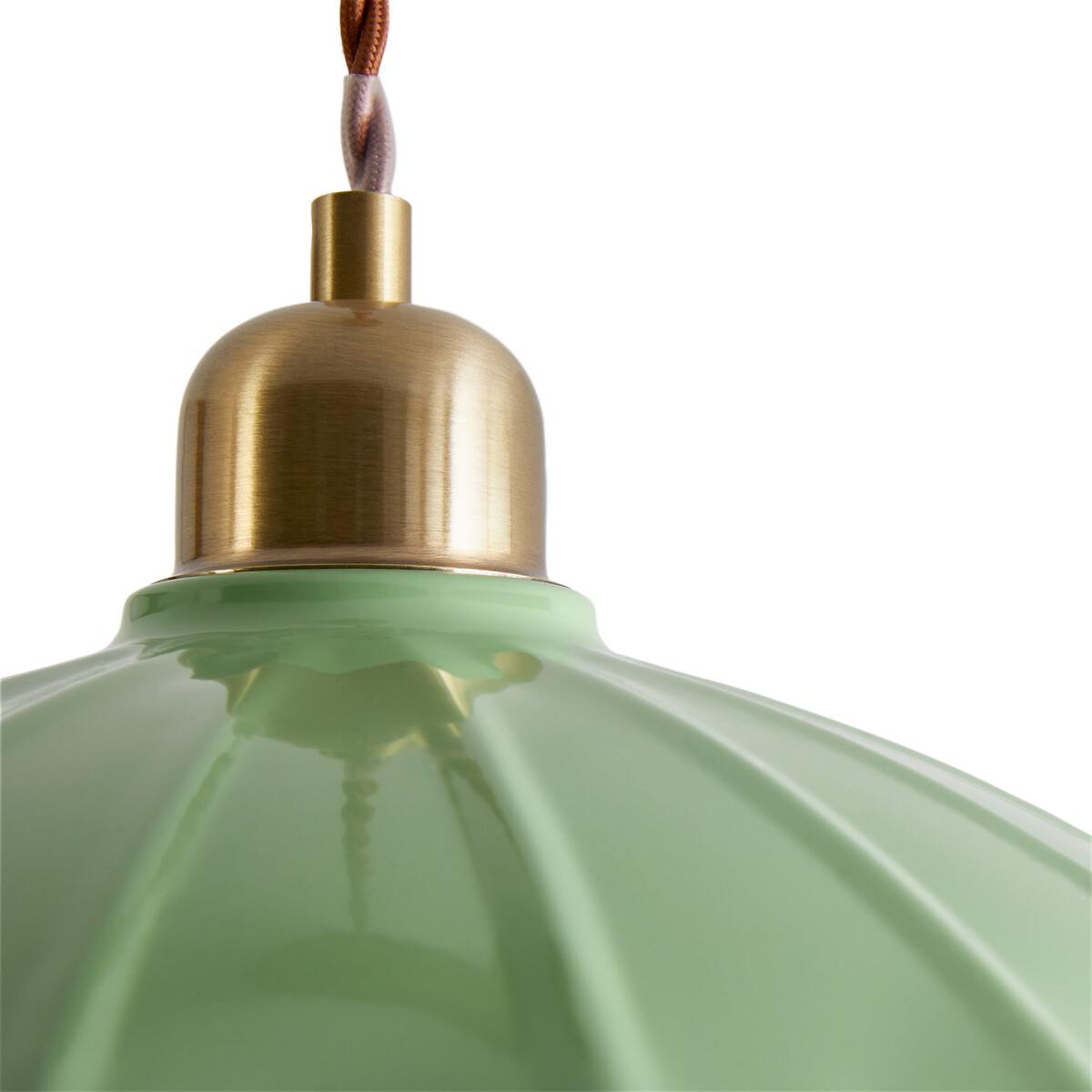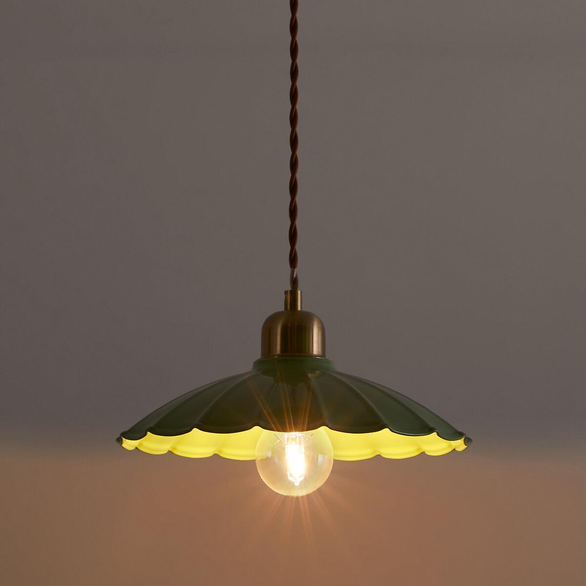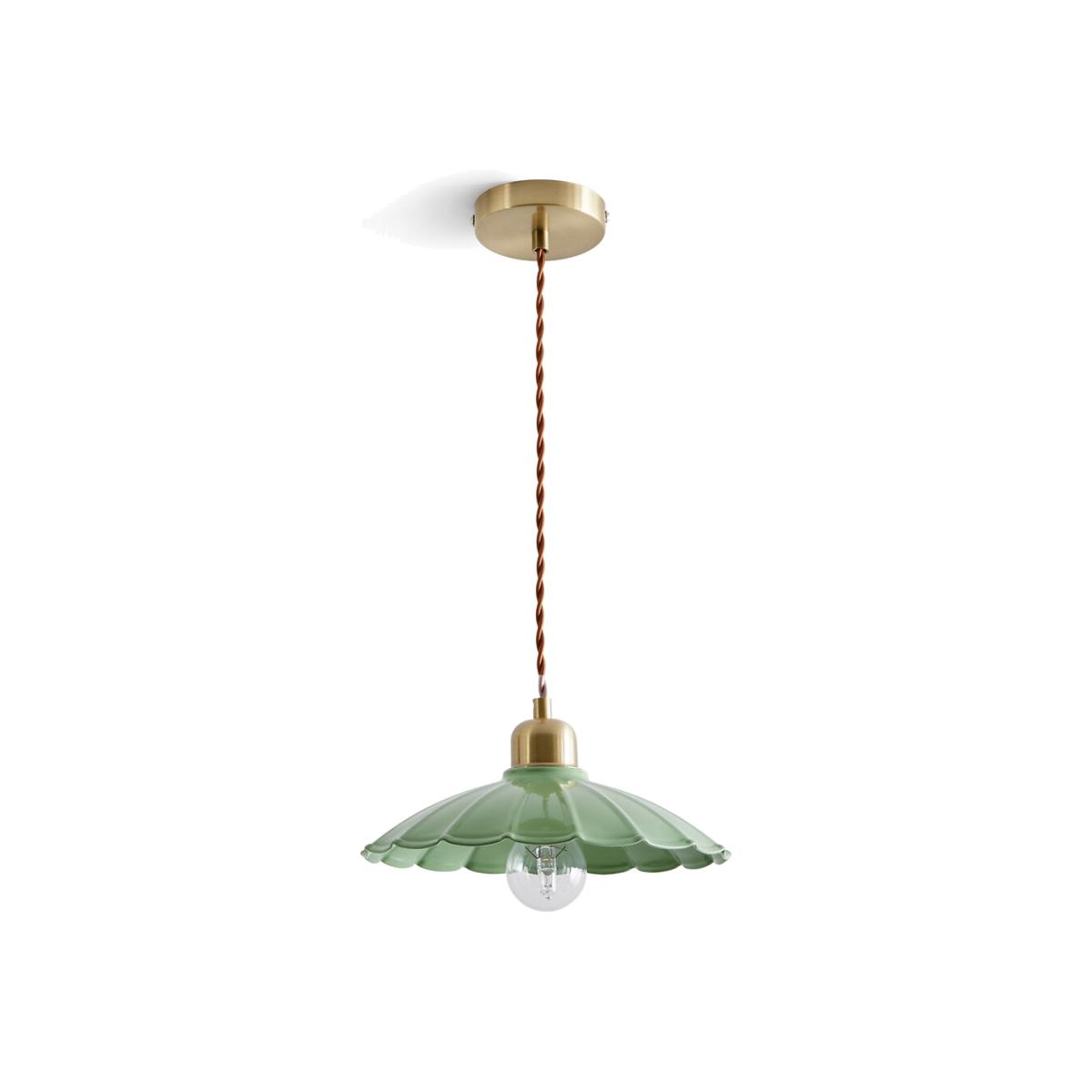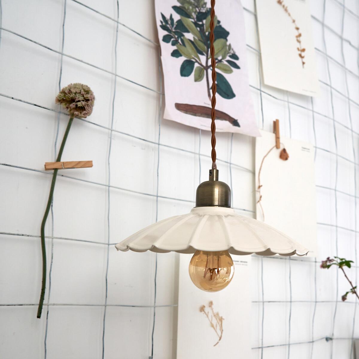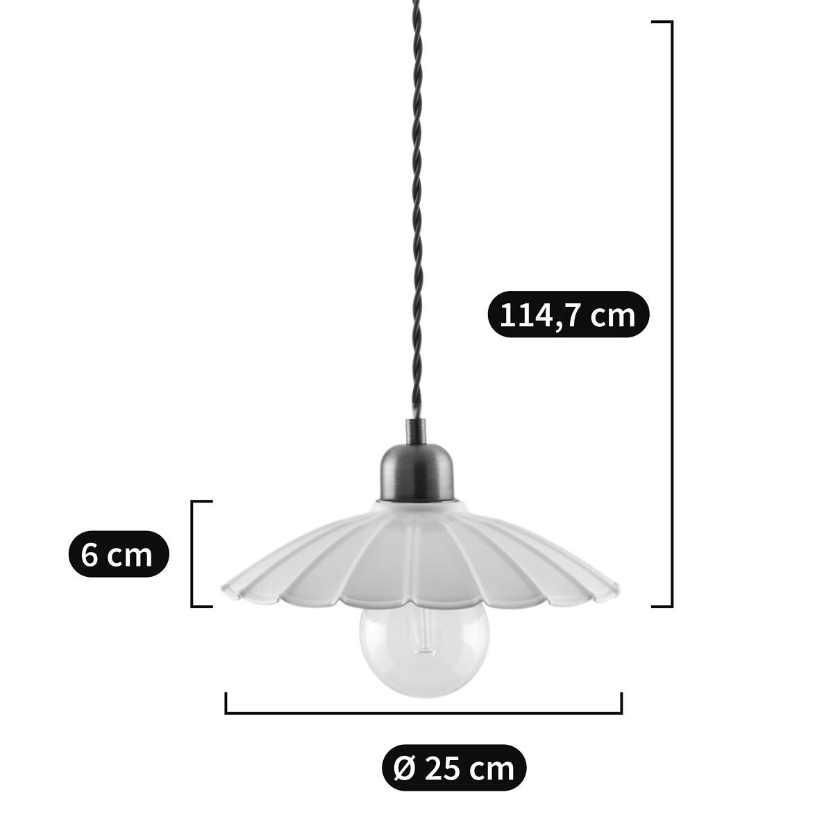 Original and elegant, the Festonia pendant lamp features a pretty scalloped metal lampshade and a twisted textile cord. The charm of yesteryear at the rendezvous. Product Details • Scalloped iron lampshade • Fabric twisted cable • E27 socket for LED bulb of 8W max (not included)Dimensions • Diameter: 25cm • Height: 114.7cm • Lampshade:Diameter 25 x H6cm Dimensions and weight of parcel1 parcel • L26 x H26.5 x D20cm. 0.7kg.