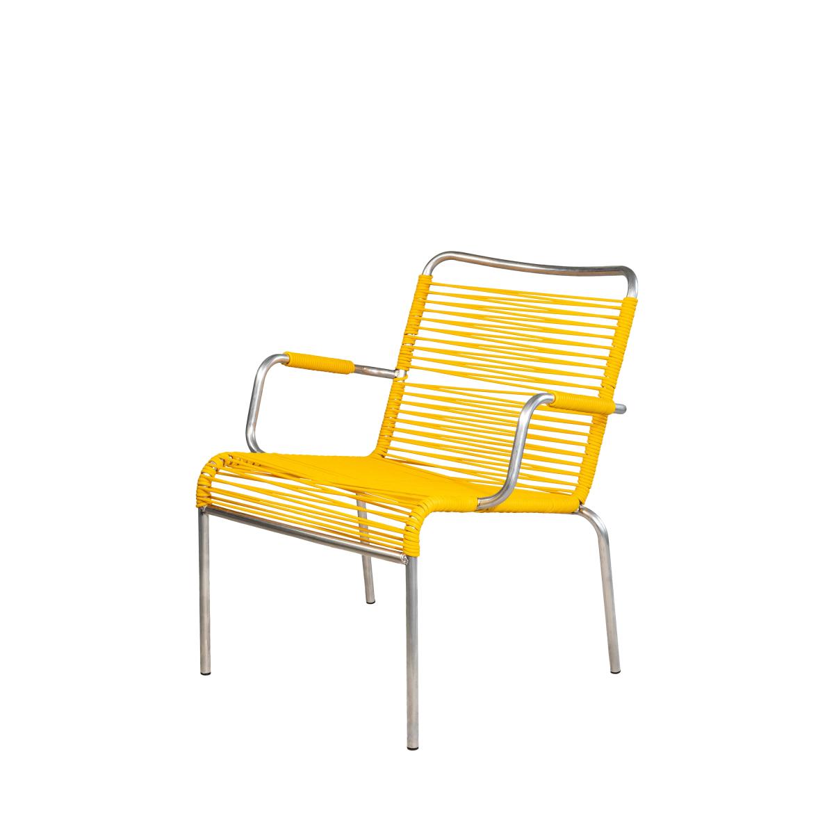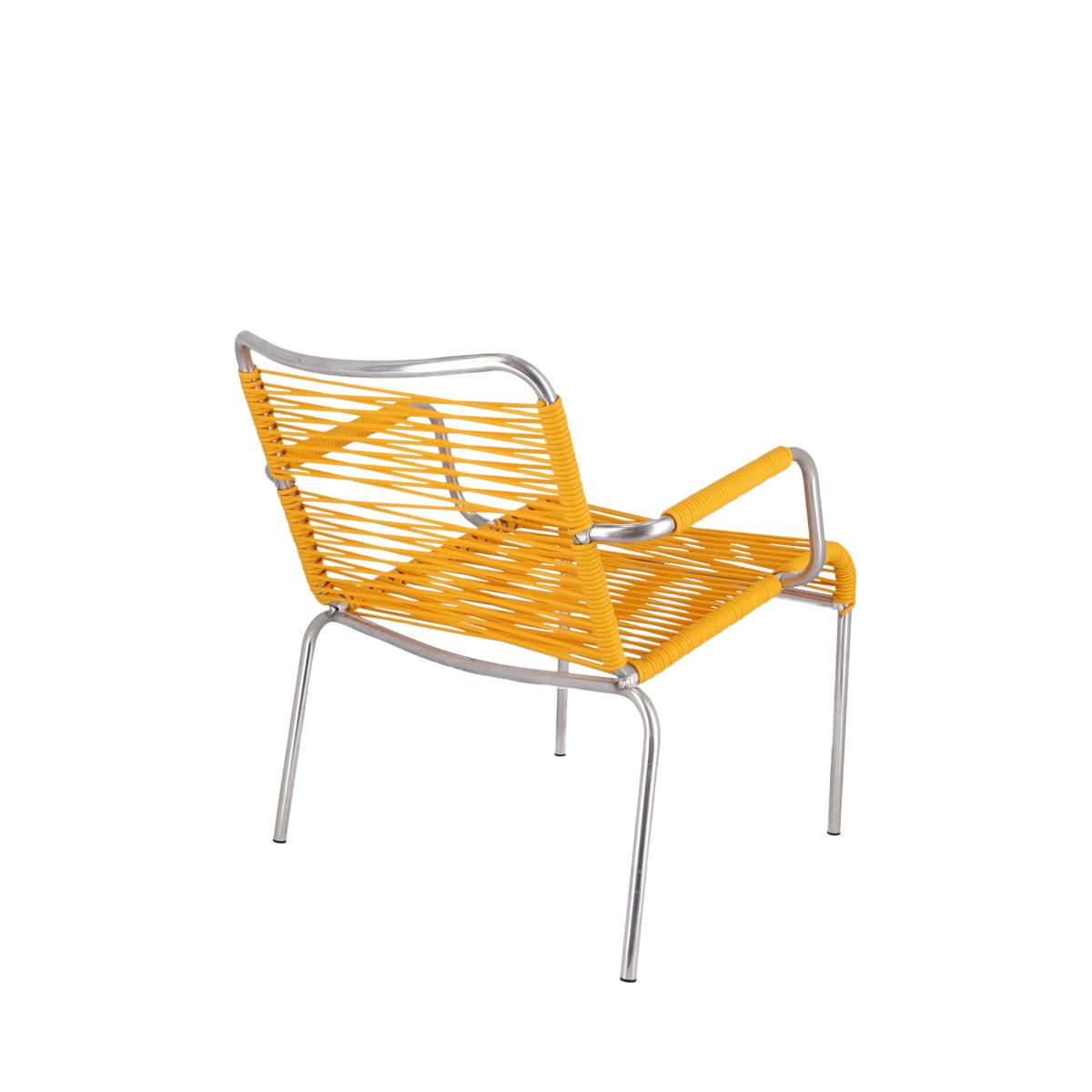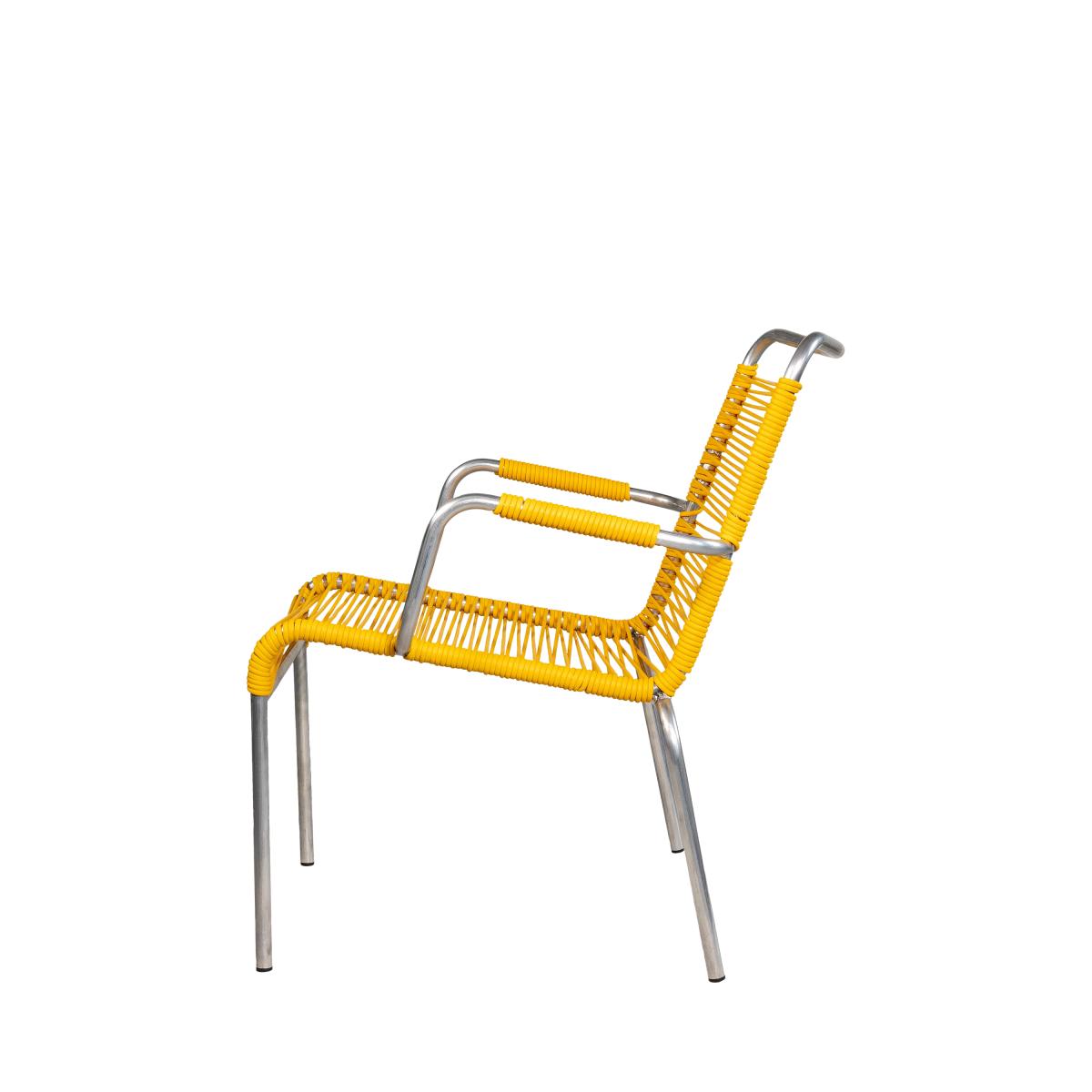 The Mya lounge chair with armrests recalls the rounded shapes of mid-century furniture with its striking design and spaghetti-style weaving. The look creates a relaxed and comfortable feel with the lightweight yet sturdy aluminium frame providing support. Stackable for compact storage and woven by hand in Italy.