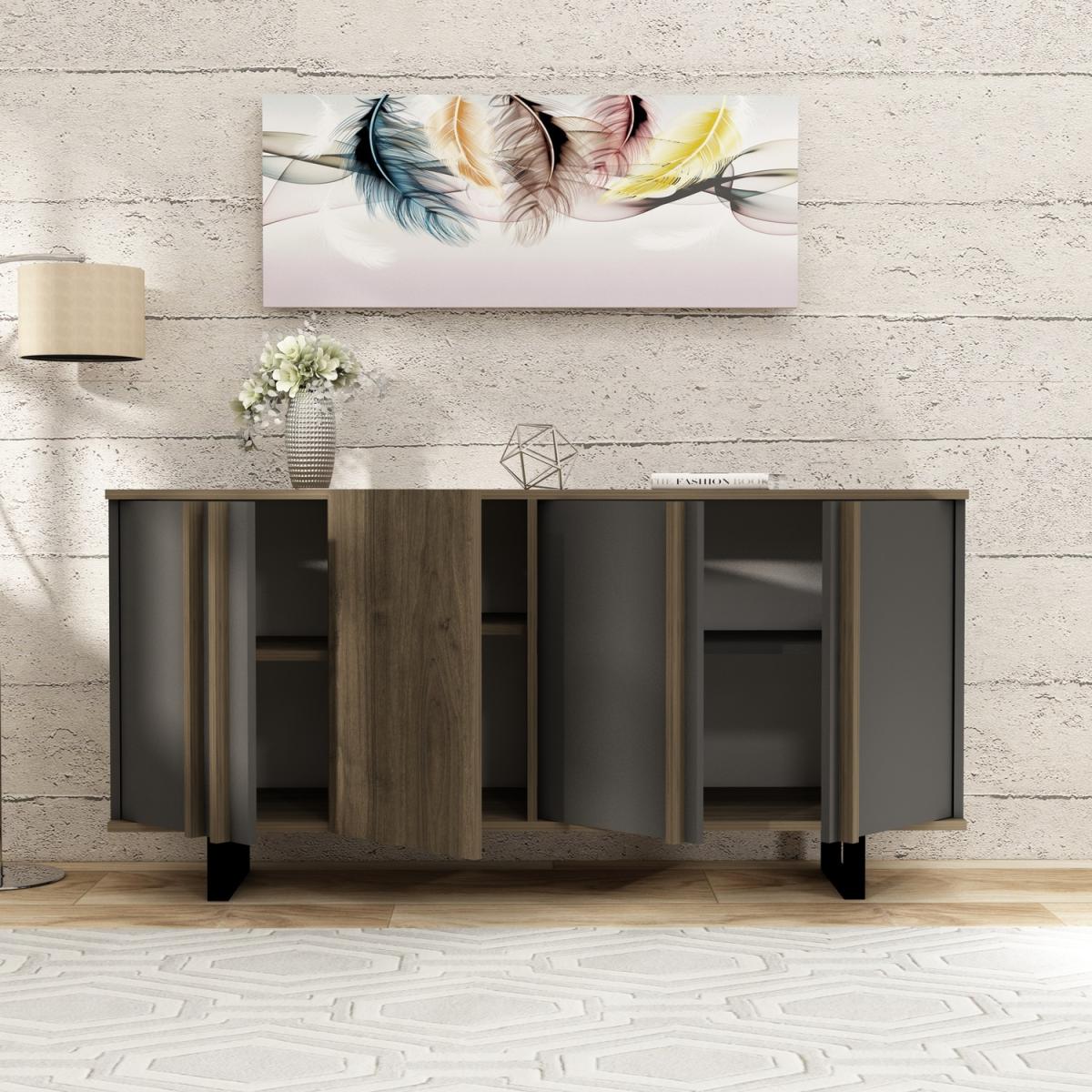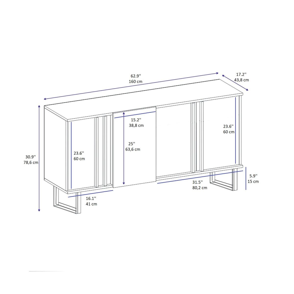 The Fido sideboard will look gorgeous and change your living room decor. The console table provides plenty of space for closed storage. It can also be used as a TV stand. MATERIAL The sideboard is made of an 18 mm thick quality melamine-coated particleboard. The manufactured wood surface is water-resistant to some extent and the edges are banded with PVC edge banding tape. First-class assemblyinstallation hardware and accessories are used. Our products are produced from certified quality raw materials that do not contain carcinogenic substances and comply with European Union health norms. LEGS Constructed from quality iron metal and coated with scratch-resistant static powder paint. Metal finish - Powder coating. CLEANING You can clean your furniture with a dry cloth. Avoid prolonged contact of your product with moisture and water. ASSEMBLY The product will be delivered to the customer in the original package as disassembled. It is designed to be assembled by the customer using a power drill and screwdriver. Assembly instruction and installation hardware are included in the package. For fast and error-free installation, product parts are numbered with stickers in accordance with the assembly guide.